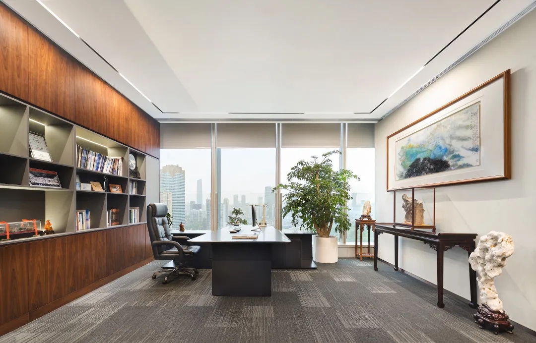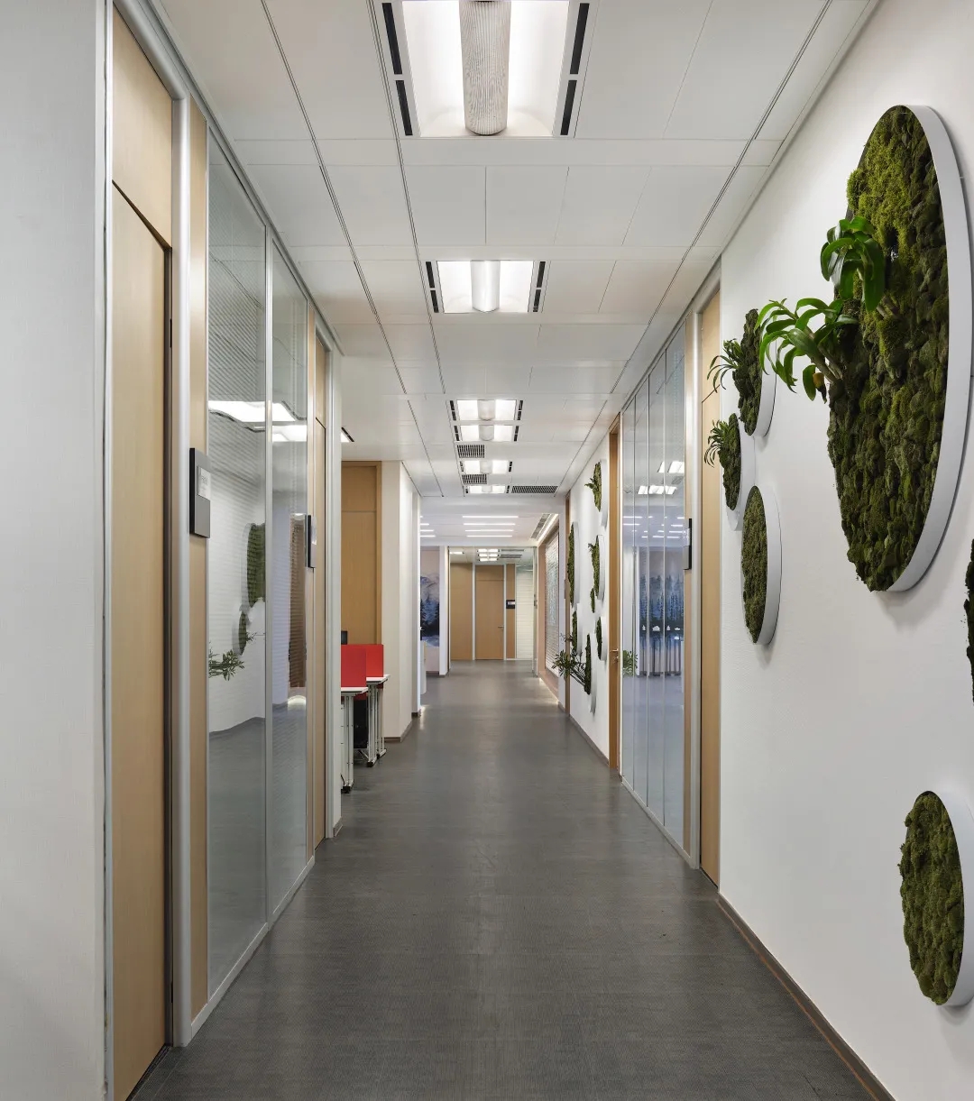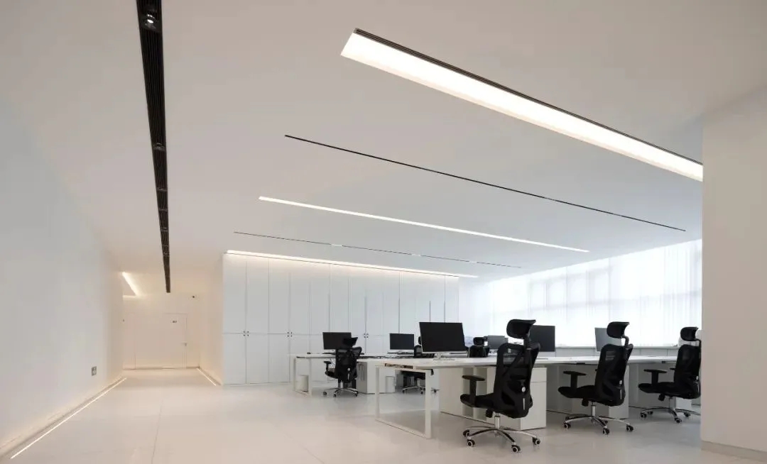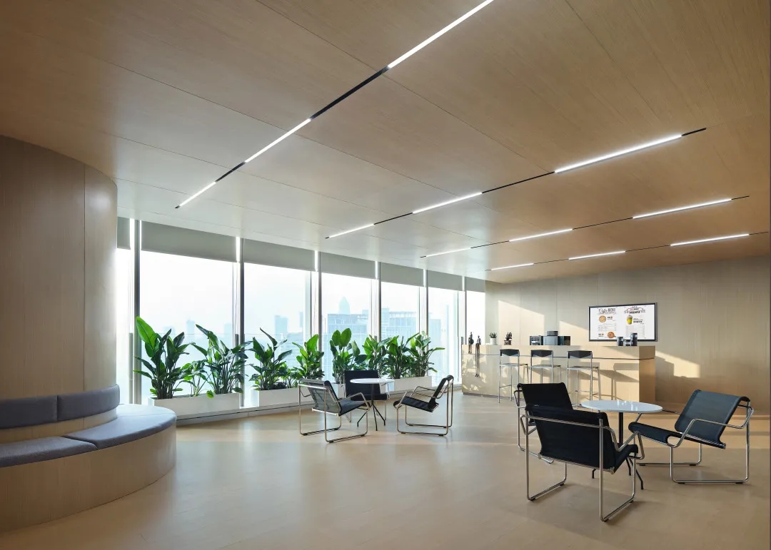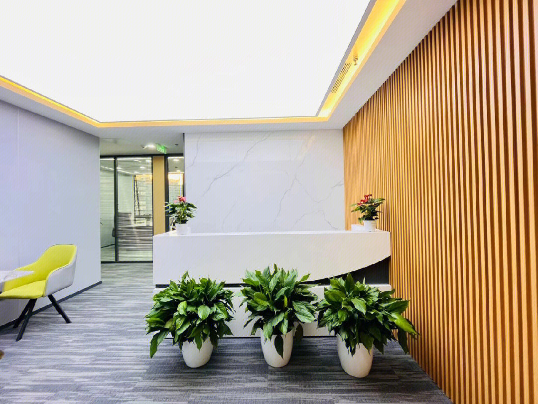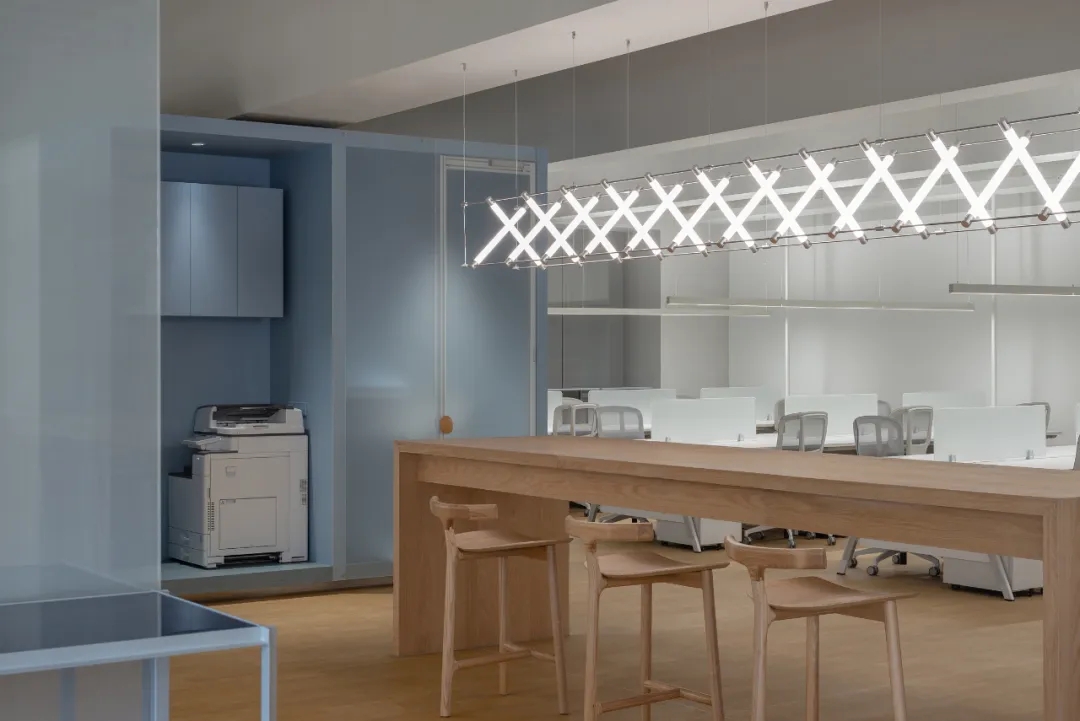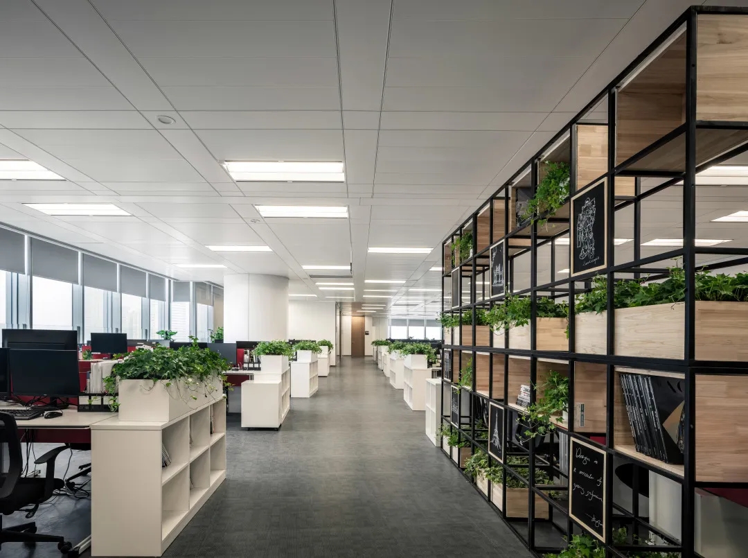 开放式办公区域,各种功能区域整洁齐整,分割合理,同时保留了相对自由宽敞的个体活动空间。在公共区域合理摆放了更多的绿植、花架与书籍,辅以定期更换的设计师手绘小板,鲜活的朝气扑面而来