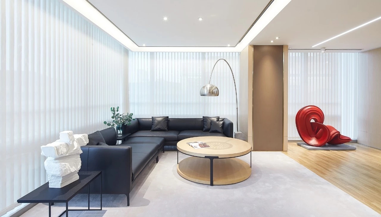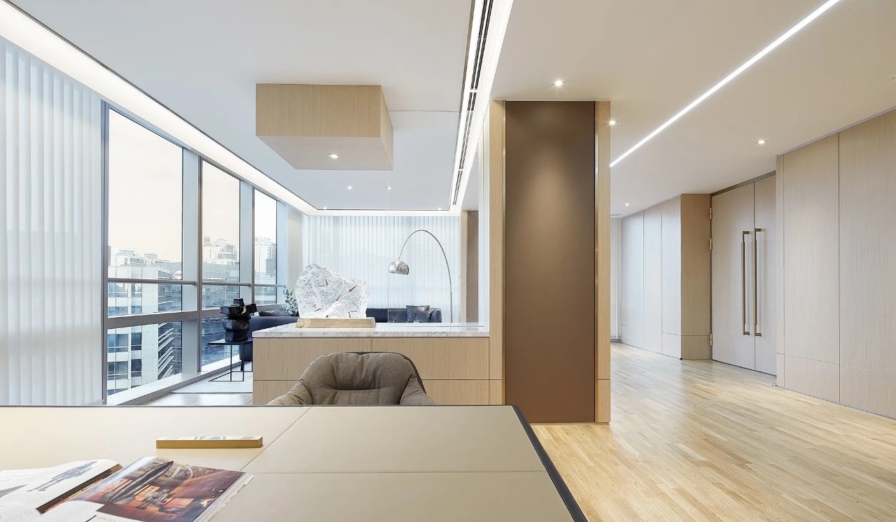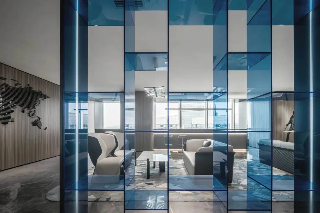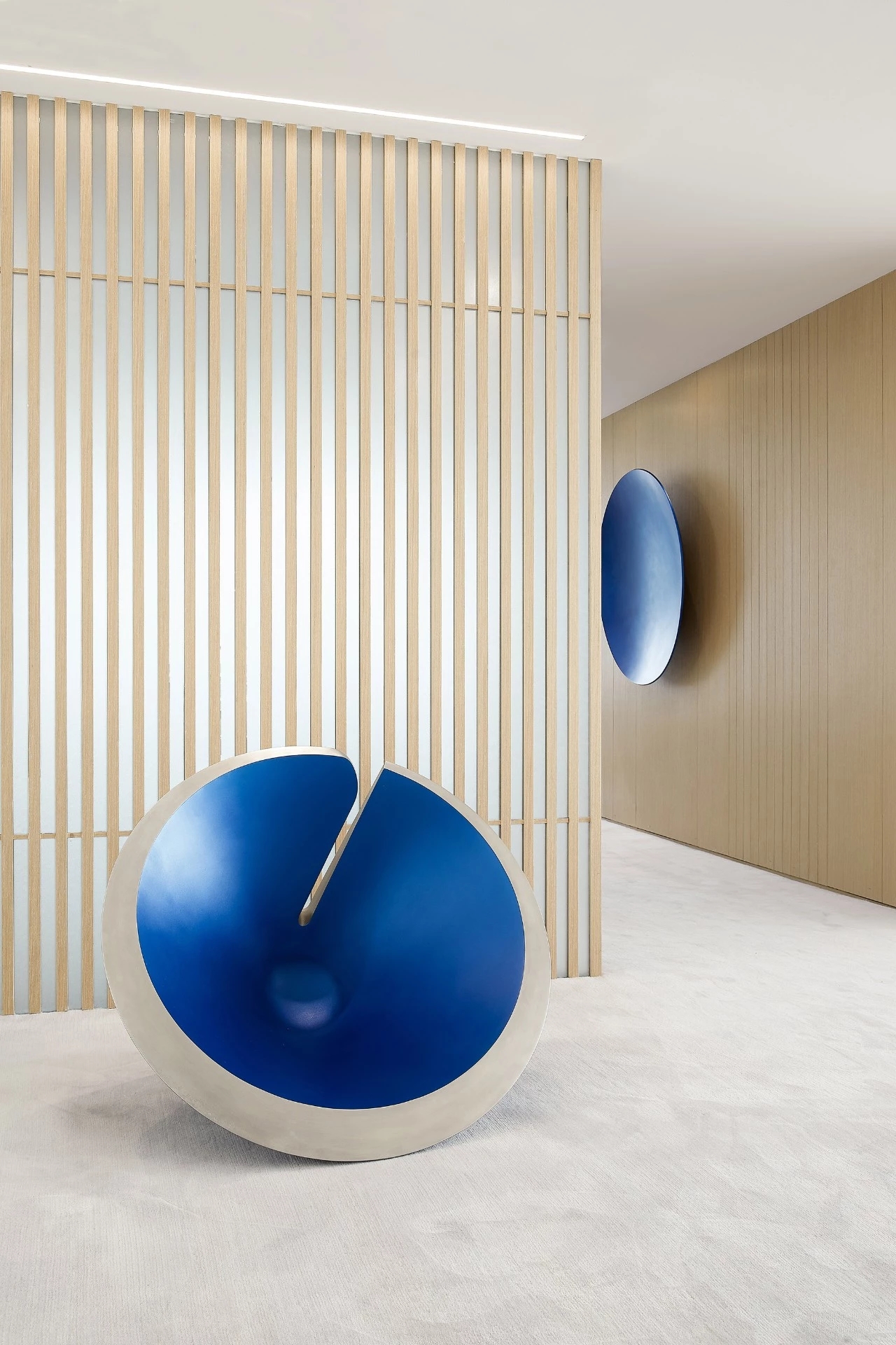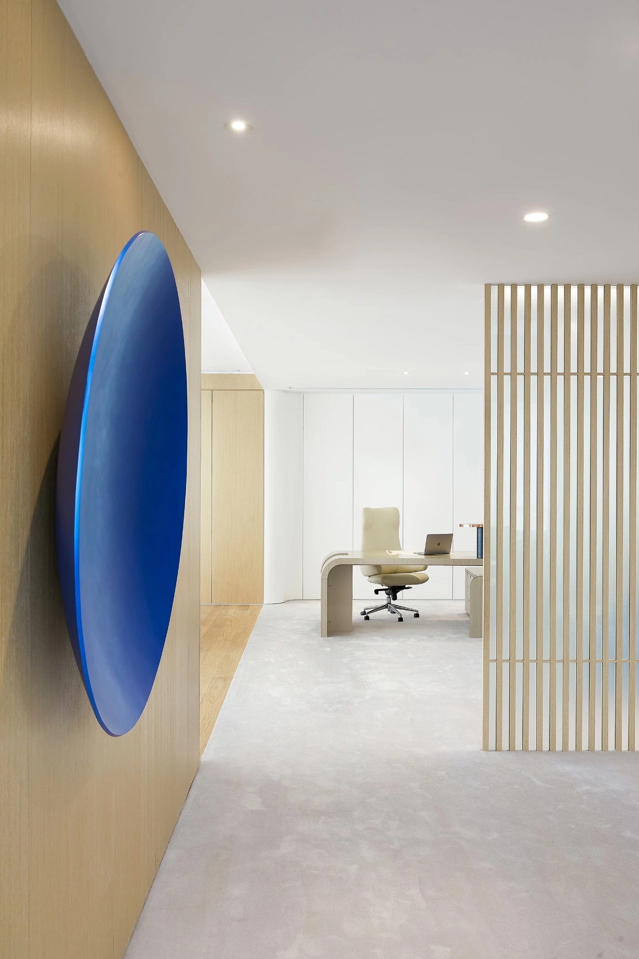 区别于常规办公区中用到的红色,自带艺术气息的克莱因蓝,为整个空间预留了想象的空间,从艺术家安尼施·卡普尔的作品获得灵感启发,置入的蓝色圆盘犹如空间沉稳静谧的灵魂,在总裁繁忙的会议中打开了放空、思考的绝佳契机。越过木质栅格,收获一片明净而开阔的办公格局。柔和的木质墙体,围合出放轻松气氛;简洁利落的线条组织,节奏明朗,勾勒出空间低调而谦和的气质。