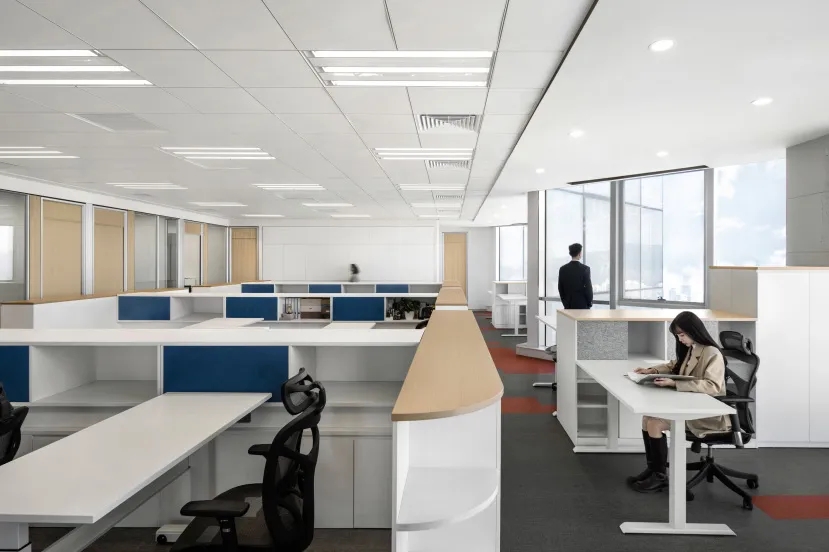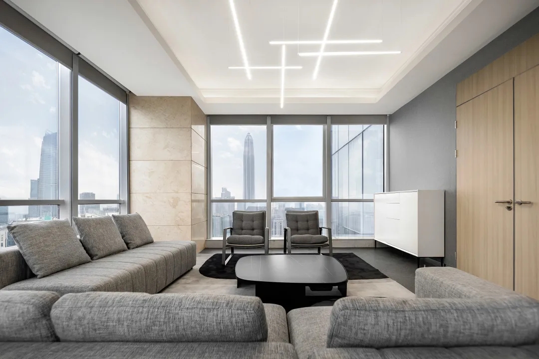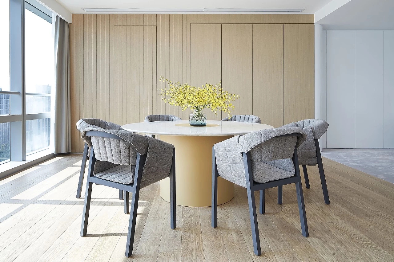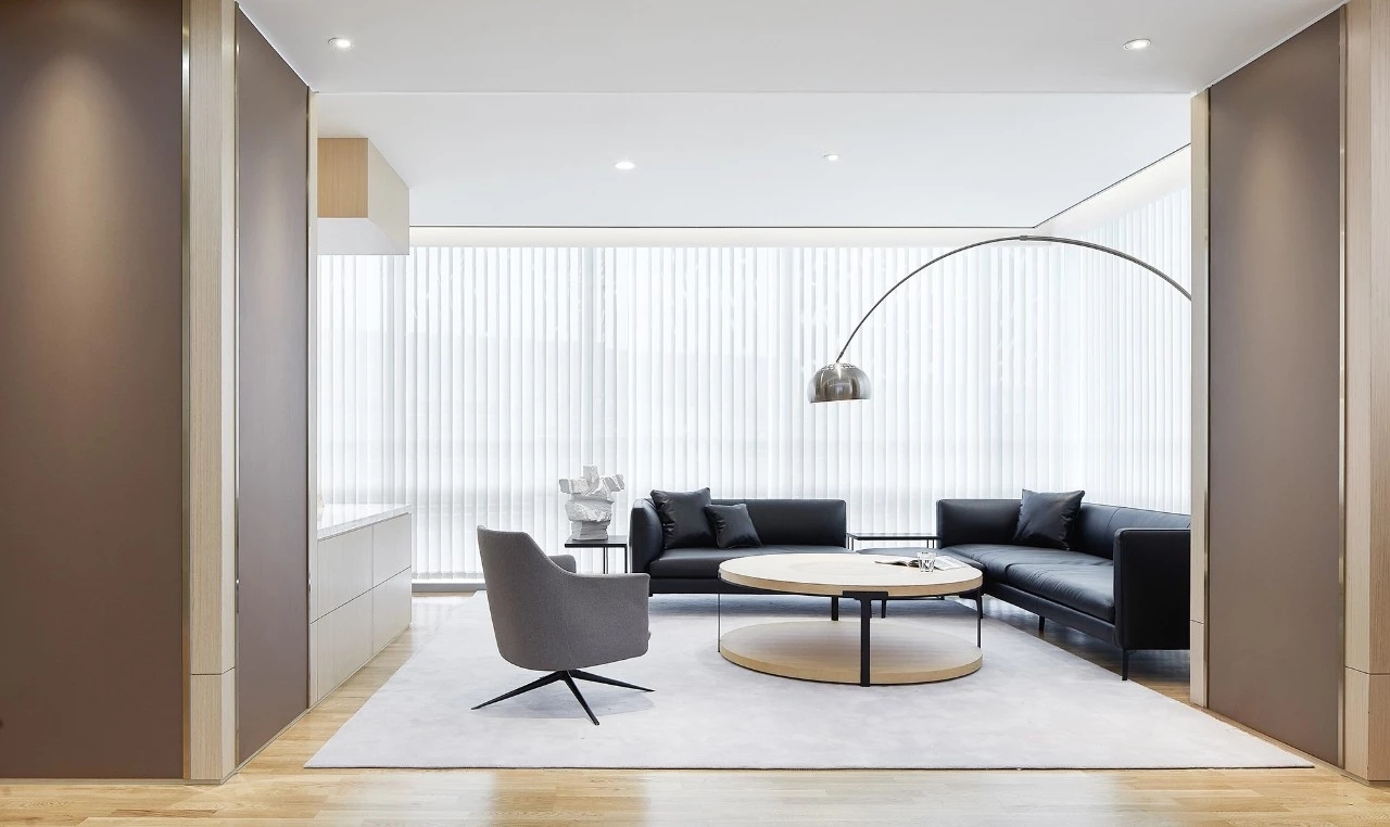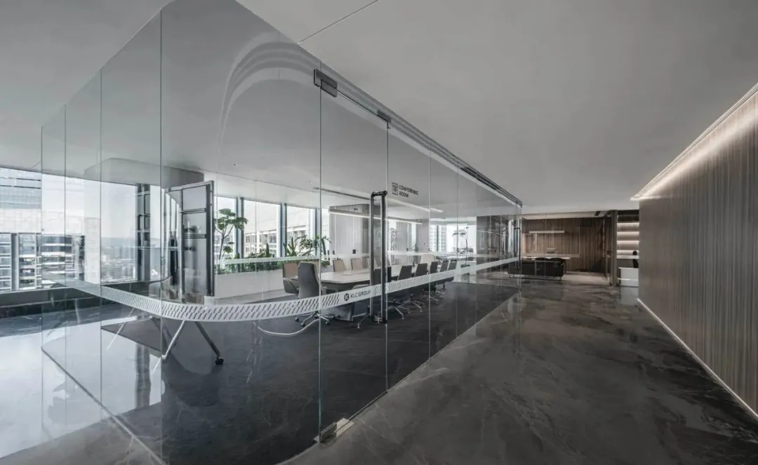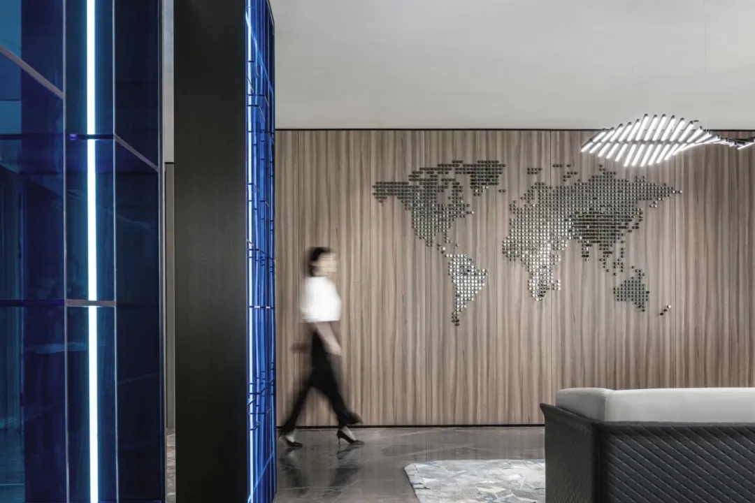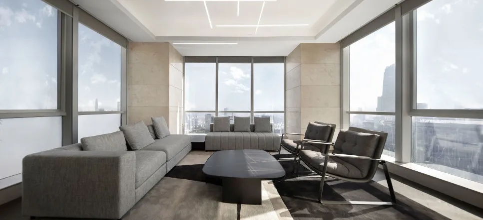 区别于常规办公区中用到的红色,自带艺术气息的克莱因蓝,为整个空间预留了想象的空间,从艺术家安尼施·卡普尔的作品获得灵感启发,置入的蓝色圆盘犹如空间沉稳静谧的灵魂,在总裁繁忙的会议中打开了放空、思考的绝佳契机。越过木质栅格,收获一片明净而开阔的办公格局。柔和的木质墙体,围合出放轻松气氛;简洁利落的线条组织,节奏明朗,勾勒出空间低调而谦和的气质。