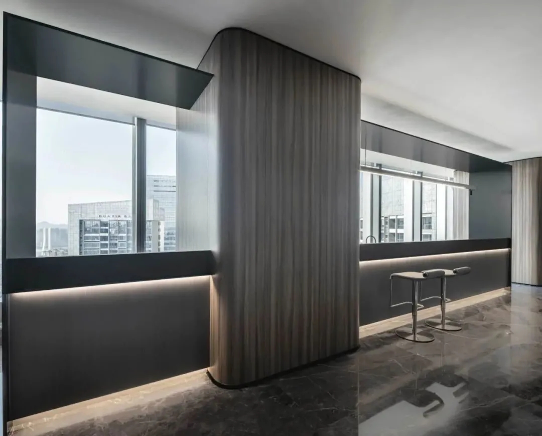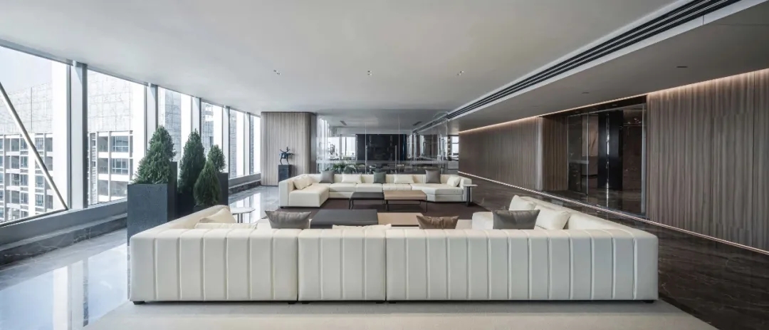 年迈的副董事长坐享的办公空间,更彰显沉稳气质。空间以木皮、皮革、金属的拼接组合构建出深浅有度、层次分明的感官体验。艺术品的置入,渲染出空间的份量感之余,构成视线的引导和虚化的空间分割节点。此起彼伏的空间节奏,构成一幅精致耐看的平面,适宜使用者长时间逗留。