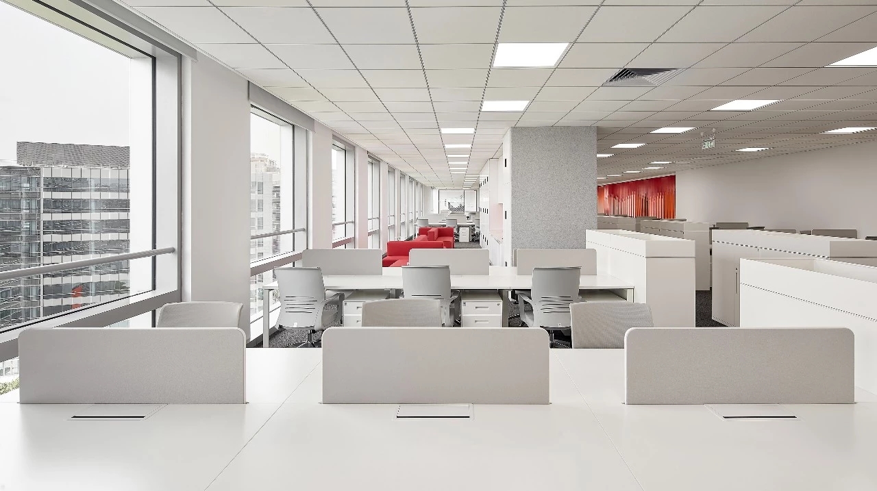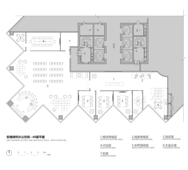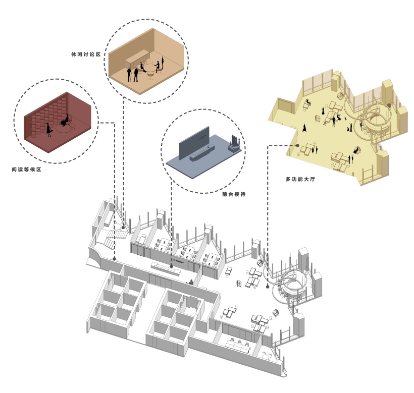 通过表格系统性地整理、分析办公空间中不同人群的行为活动及工作状况数据,得出员工的本质需求,通过完整理性的表格和数据分析制定出办公空间的规划策略。根据数据和矩形结构的场地空间情况,设计师以楼板中心为发散点,作出「十字交叉」的结构组织规划,统筹主要交通空间,让其成为连接一层各个功能空间的枢纽地带。因此,横向置入使用频率最高的会议空间模块,纵向为接待台及其他次主要功能分区模块,不同区位的办公人员可以灵活快捷地穿梭在连接路径上,让员工以最短的动线解决工作与诉求实现高效办公和协作。