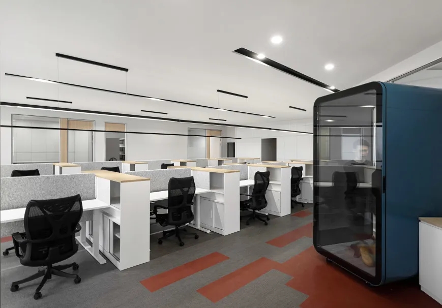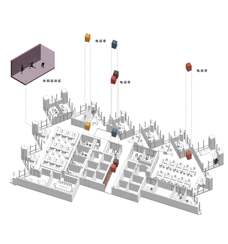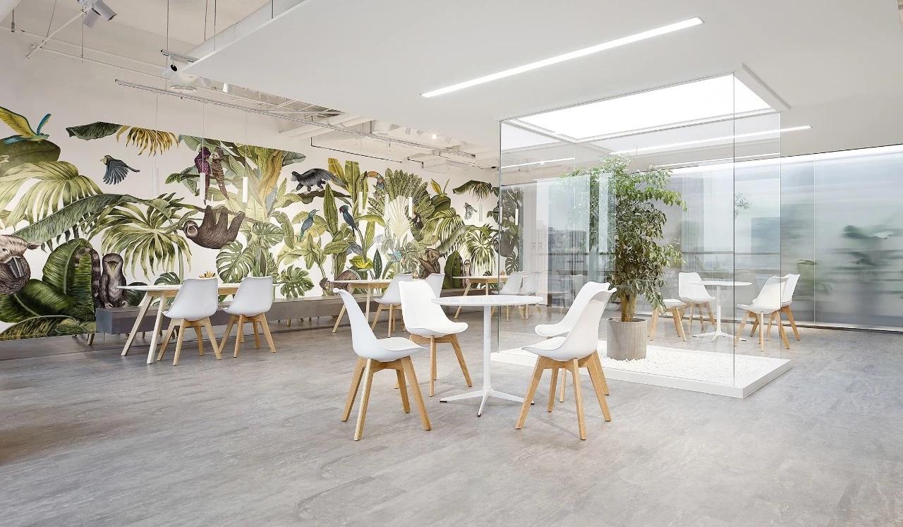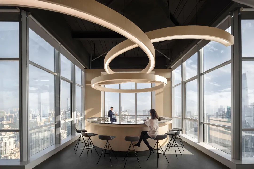 建筑与自然之间的有趣的边界称之为灰空间,休闲用餐区正是这样的模糊边界空间。空间中心植入鲜活的绿植,以玻璃围合,浸染在虚实交错的绿植之中,瞬间多了一分跳脱活泼之美。此空间让员工舒适地思考、放松与创造,提升工作品质与员工对工作环境的满意度。