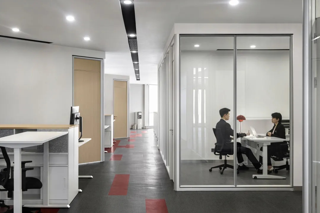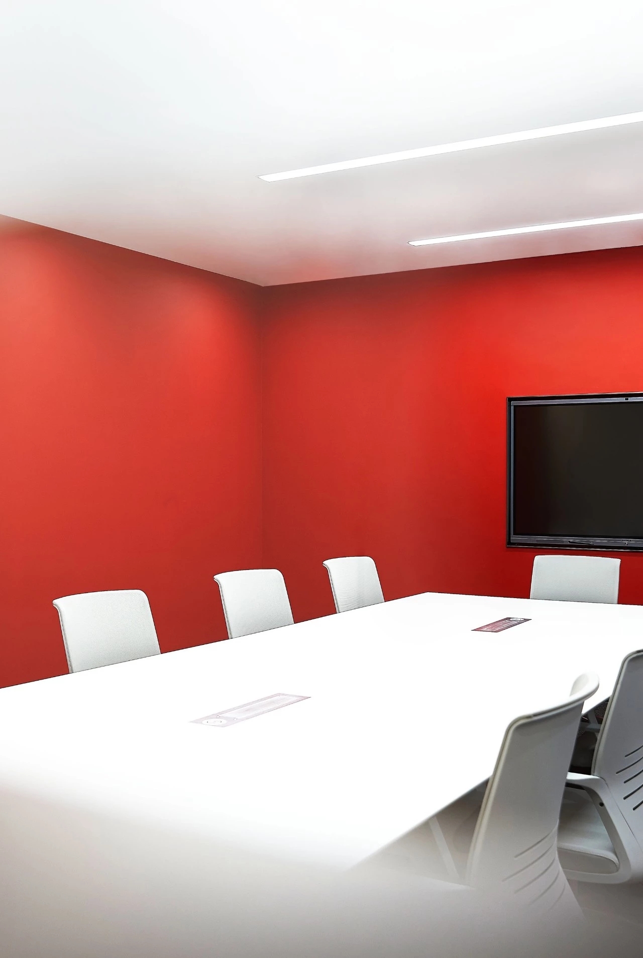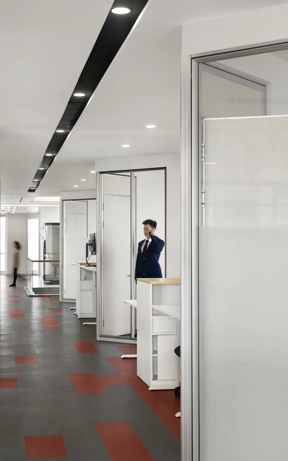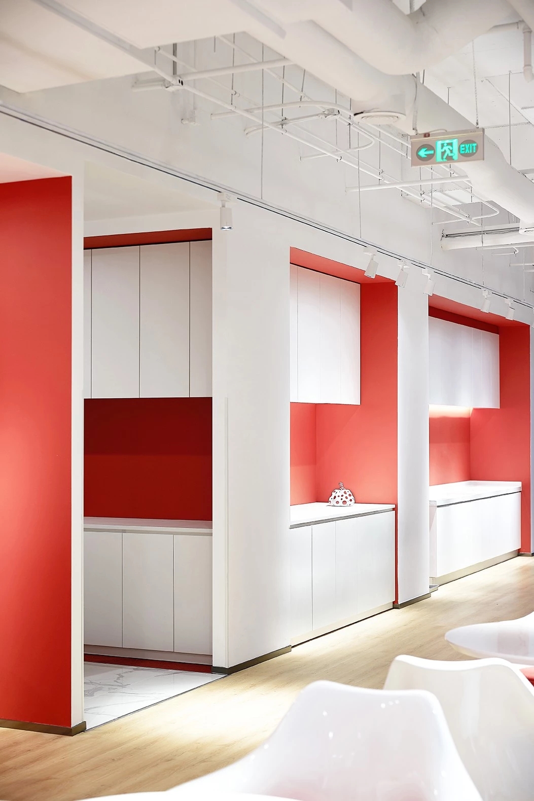 中型会议室同样使用品牌色作为墙体色,活泼的红色不但能够刺激大脑提高员工对会议的参与度,同时也能减少空间使用时间,实现会议空间的高效利用。为群体讨论创造了机会与条件同时,设计师配置可书写的白板及视讯系统,使创意表达的可视化更方便,让空间成为创新的工具。企业文化内容也可以在干净的墙体上进行平铺展现。
