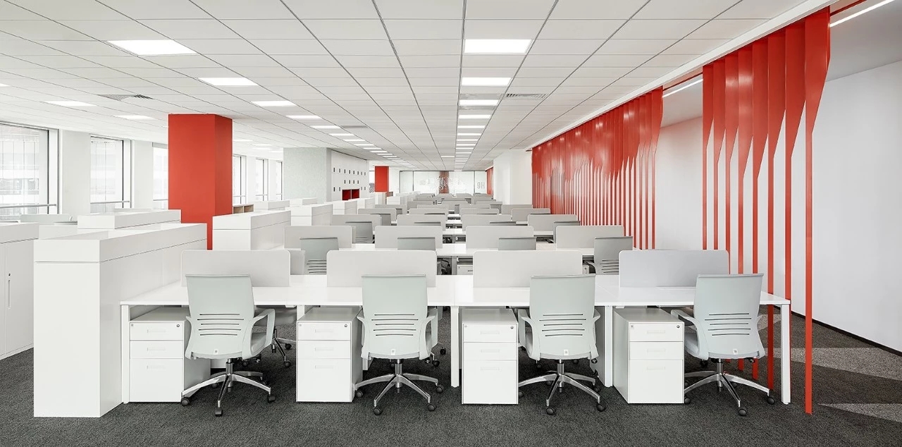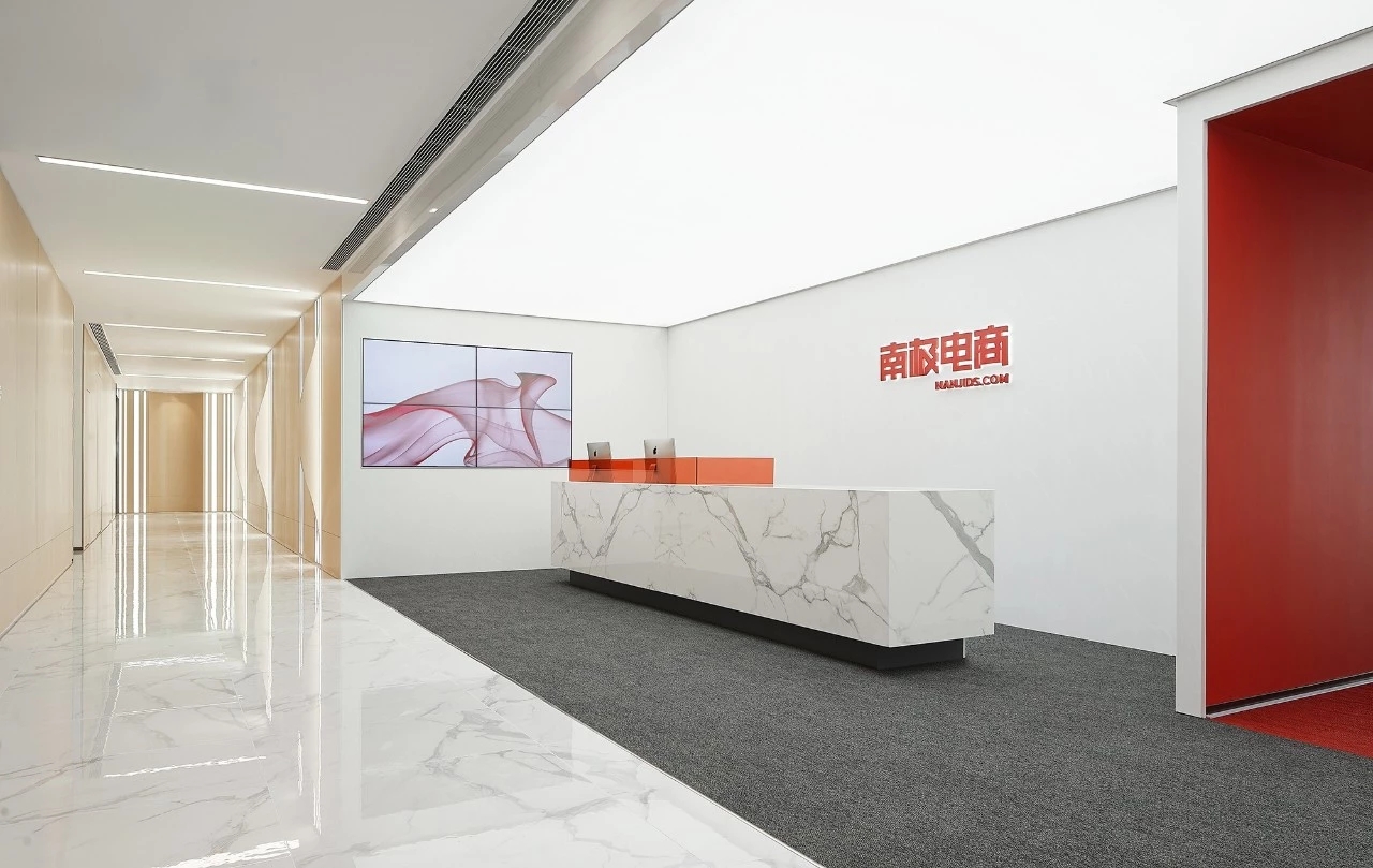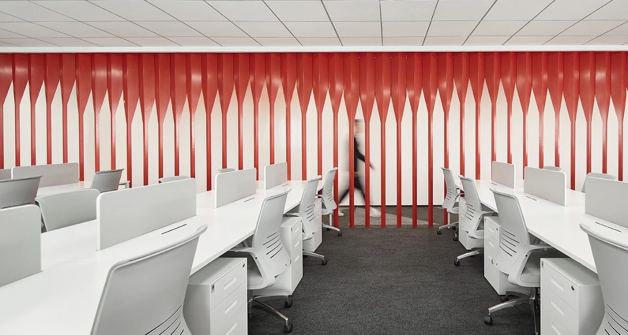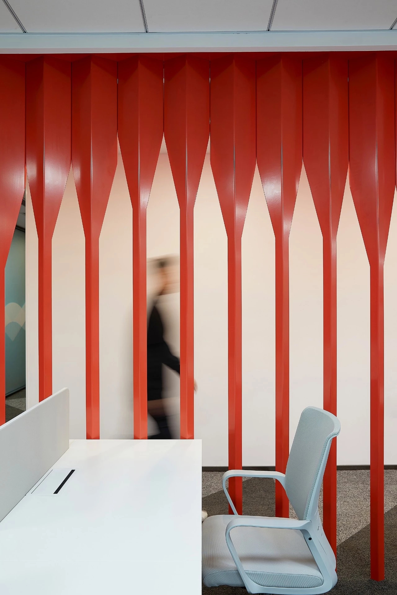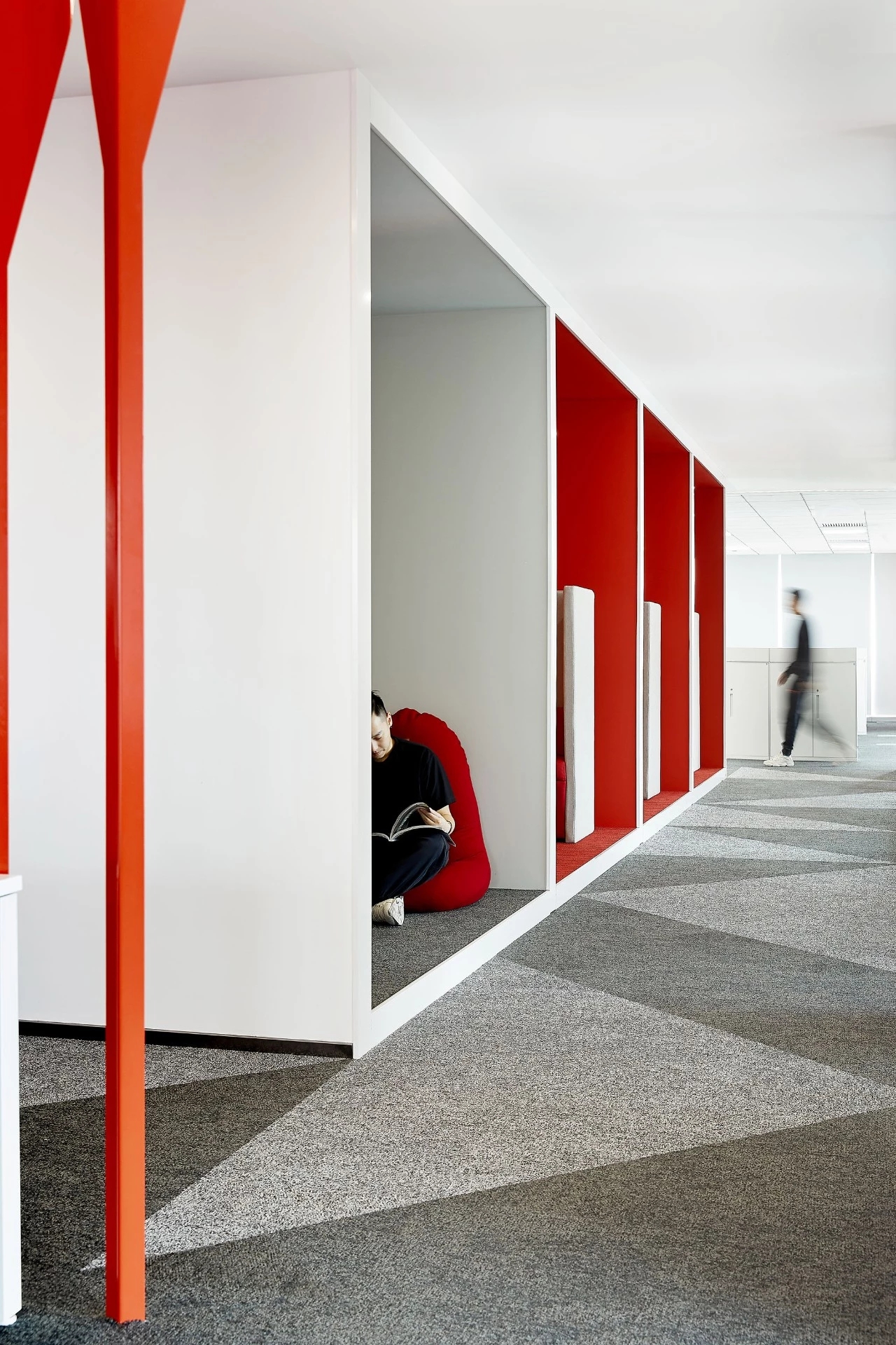中型会议室同样使用品牌色作为墙体色,活泼的红色不但能够刺激大脑提高员工对会议的参与度,同时也能减少空间使用时间,实现会议空间的高效利用。为群体讨论创造了机会与条件同时,设计师配置可书写的白板及视讯系统,使创意表达的可视化更方便,让空间成为创新的工具。企业文化内容也可以在干净的墙体上进行平铺展现。