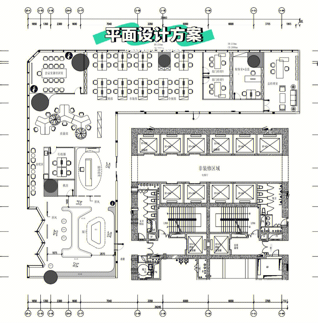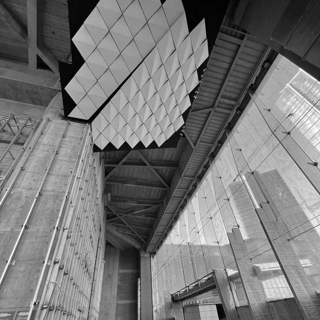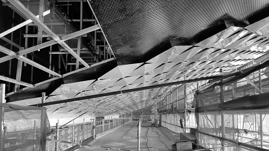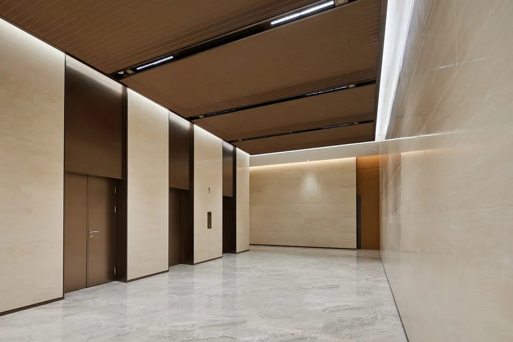 設計團隊以基準形態深化出不同單體形狀拼接的延伸效果,經過多輪對比,最終確定選用龍鱗狀的菱形漸變鋁板細化方案,板塊開口從幕墻延伸到核心筒內部。而後面臨三個深化問題,天花噴淋及煙感、照明燈光、排煙及出風如何消化進乾淨一體的天花幕墻中。