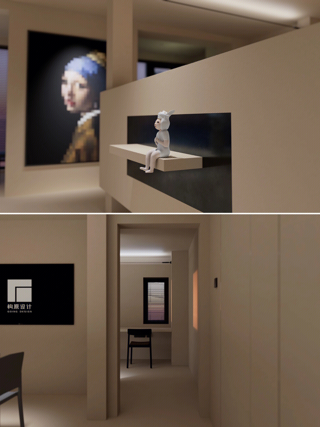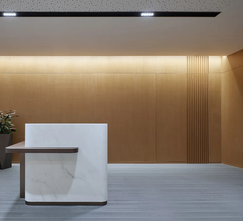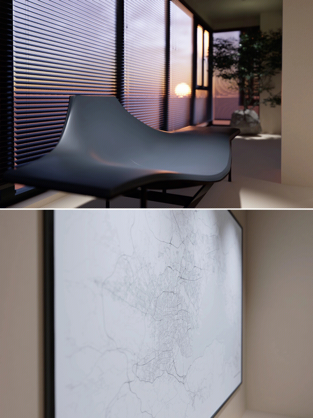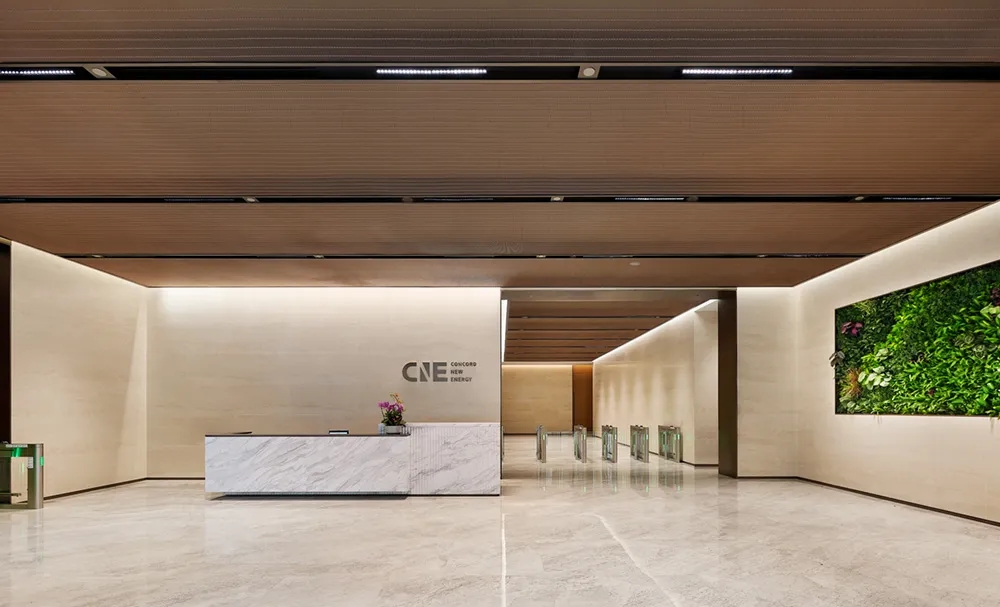 经过设计师设计改造的大厅空间,最大化的利用自然光线,通过温柔而有力的视觉先导,让环境视觉在访客保持「理性」,同时维持「科学的感性」。经由简朴不造作的大理石,铺就了稳重低调的视觉氛围。同时,若隐若现的星光,一路漫游于天花之上,映照着天光云影。