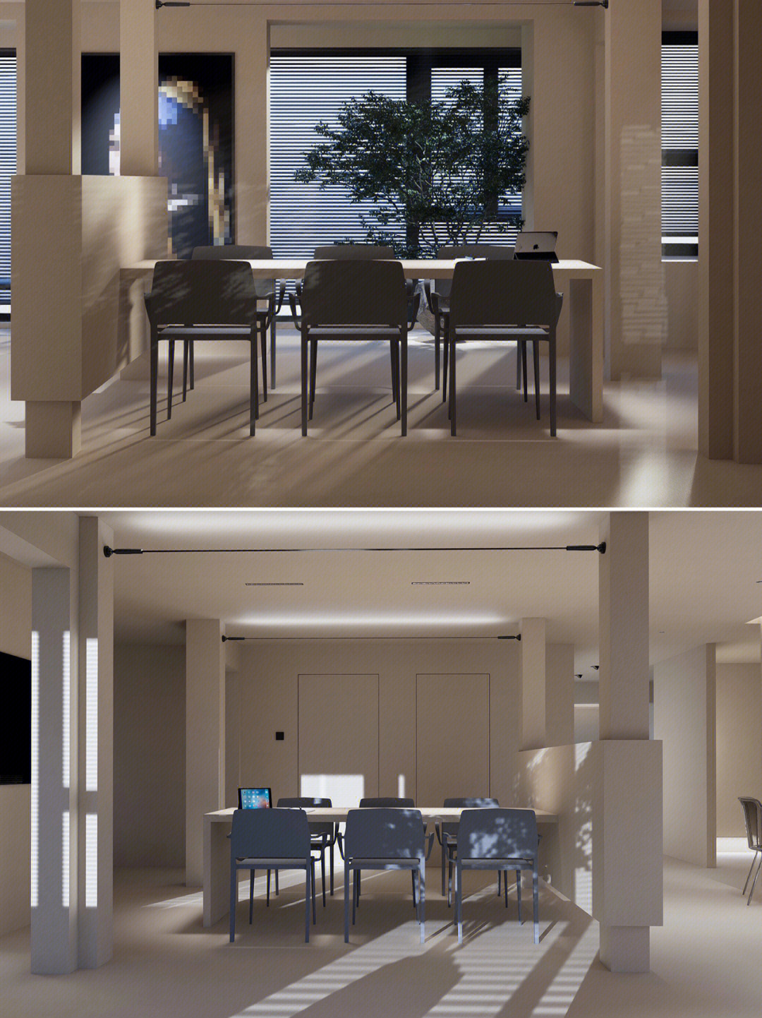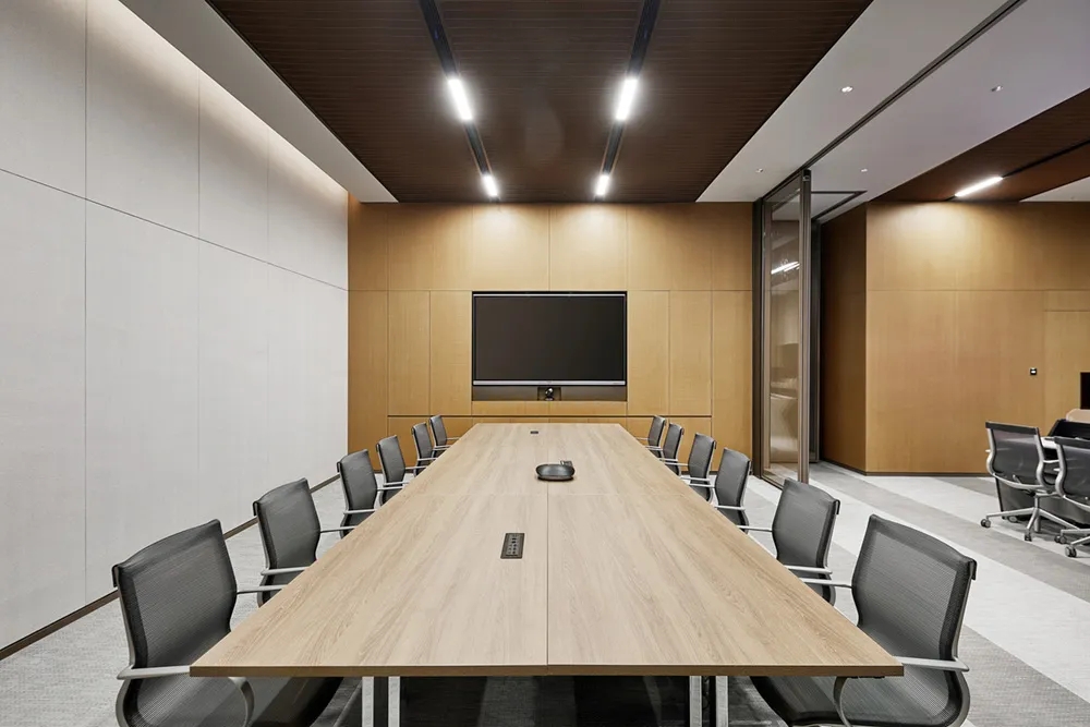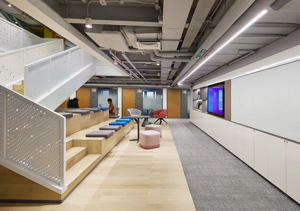 为了加强内部相互连接,设计师将光与材料引入至阶梯式多功能会议室,消除掉原本空间格局带来的压抑感,同时通过光线与几何空间的相互渗透,让光顺着空间蔓延形成点点星光,如同「雪挂虹亘」般,成为视觉的焦点。