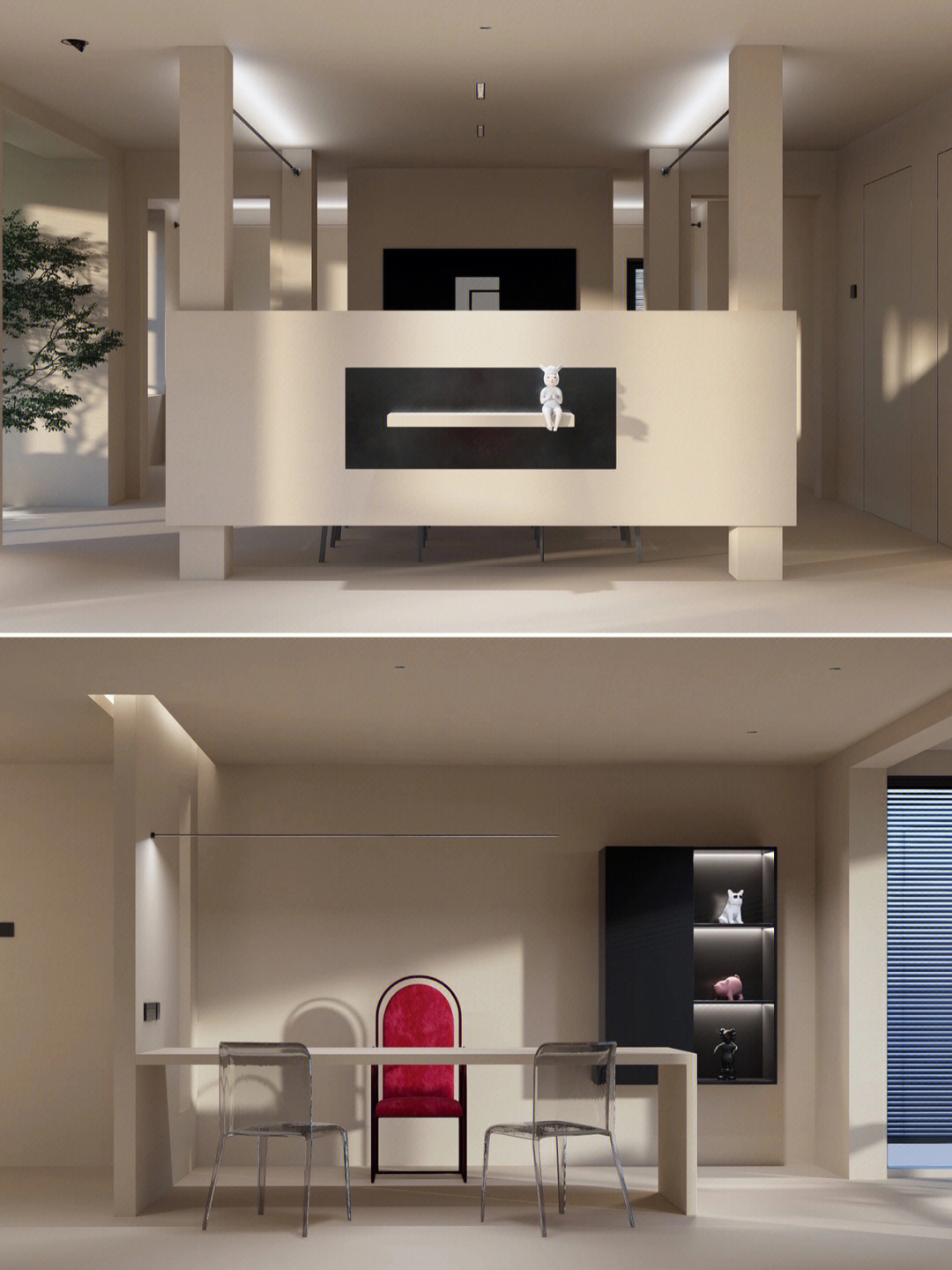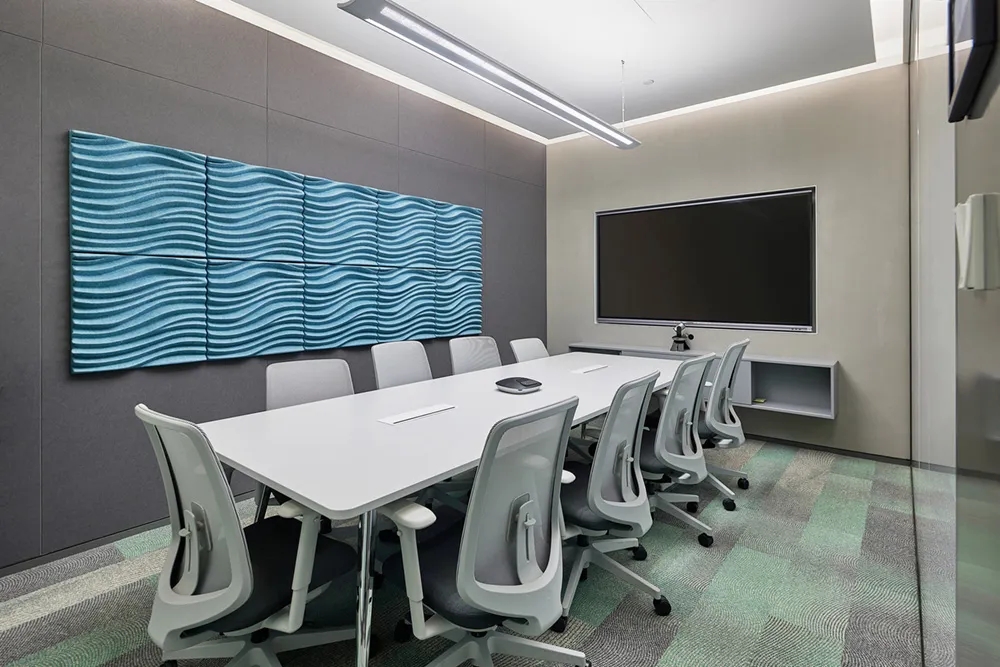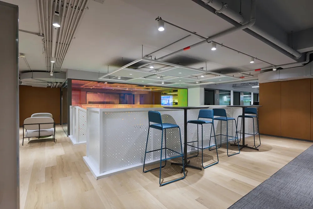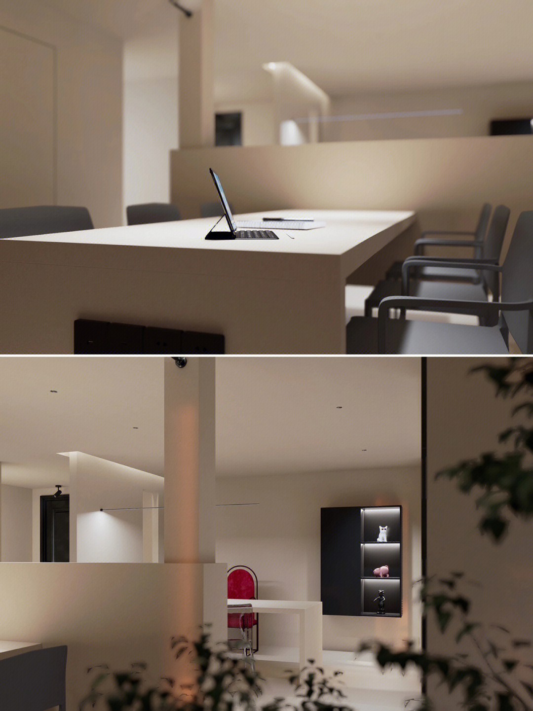 为了加强内部相互连接,设计师将光与材料引入至阶梯式多功能会议室,消除掉原本空间格局带来的压抑感,同时通过光线与几何空间的相互渗透,让光顺着空间蔓延形成点点星光,如同「雪挂虹亘」般,成为视觉的焦点。