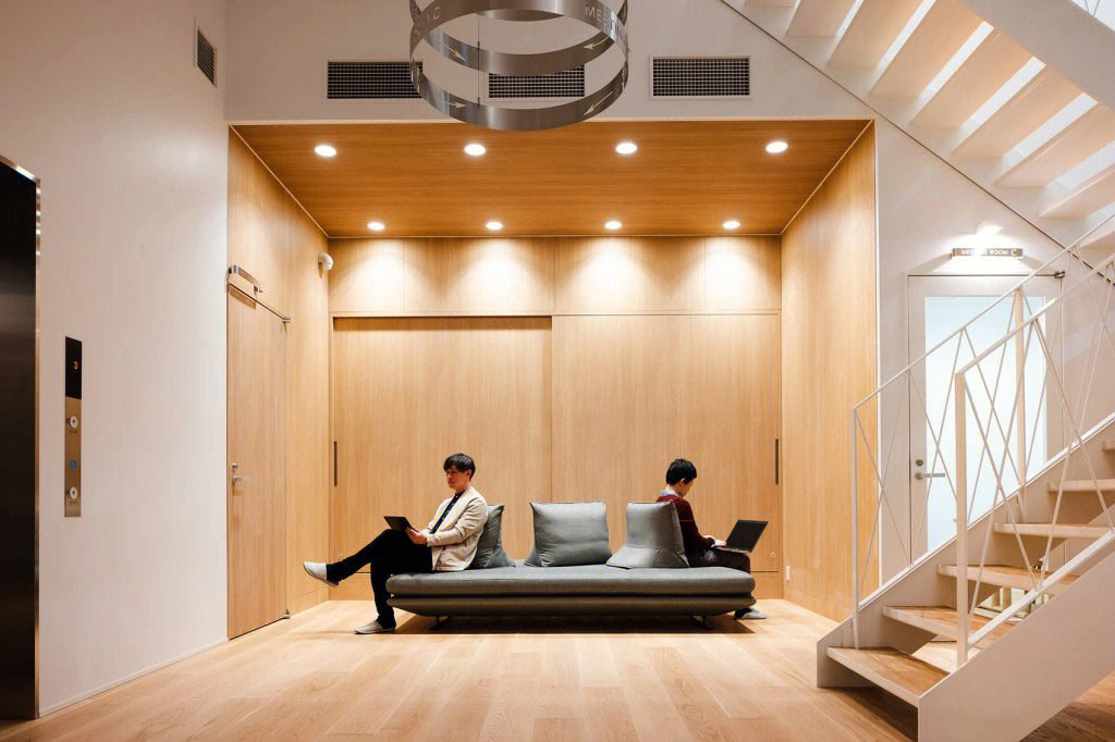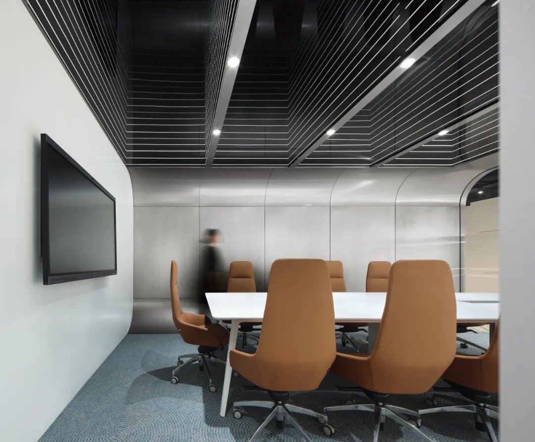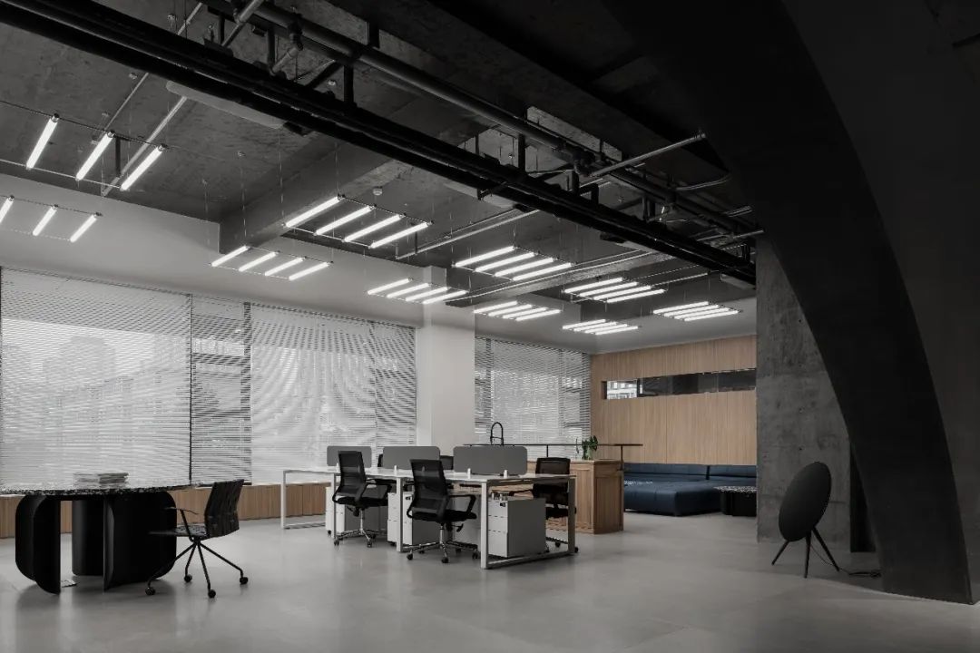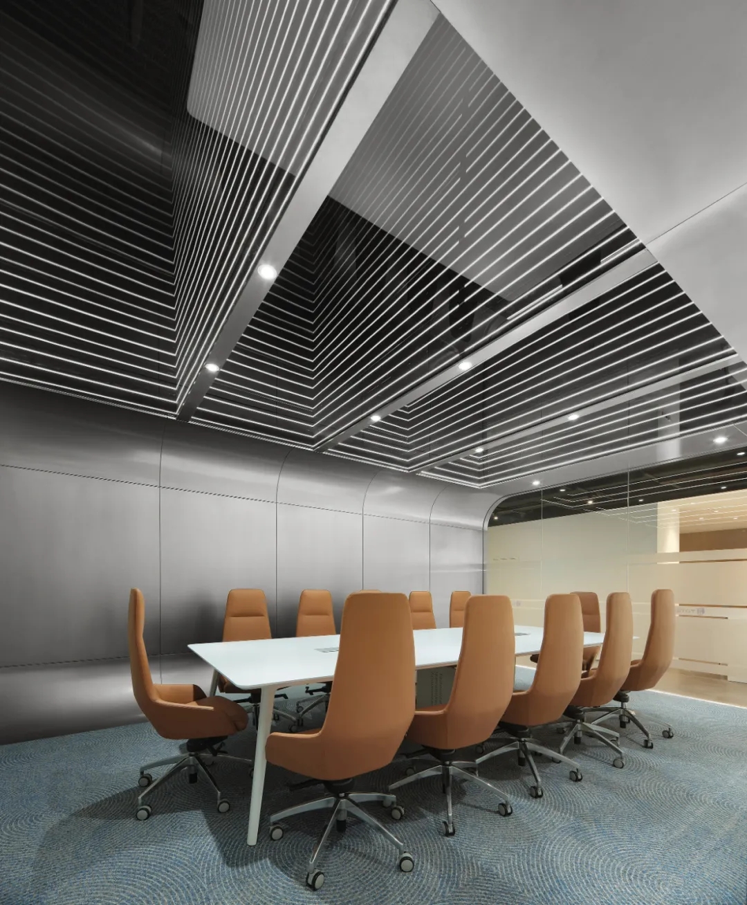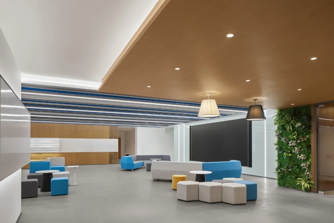 创意中心是办公区域中较大的一处共享型复合空间,在这里可开展演讲、头脑风暴、茶歇咖啡、聚会等多种活动,同时也引导员工探索更多的使用方式。不同明度的蓝灰垂片天花搭配局部木色墙面使此空间理性科技又不乏温馨舒适。内部办公空间设计中,将沿窗采光较好的区域规划成了专注工作区,沿内部核心筒区域则布置了供员工交流、休憩及灵动办公的茶水休闲空间。