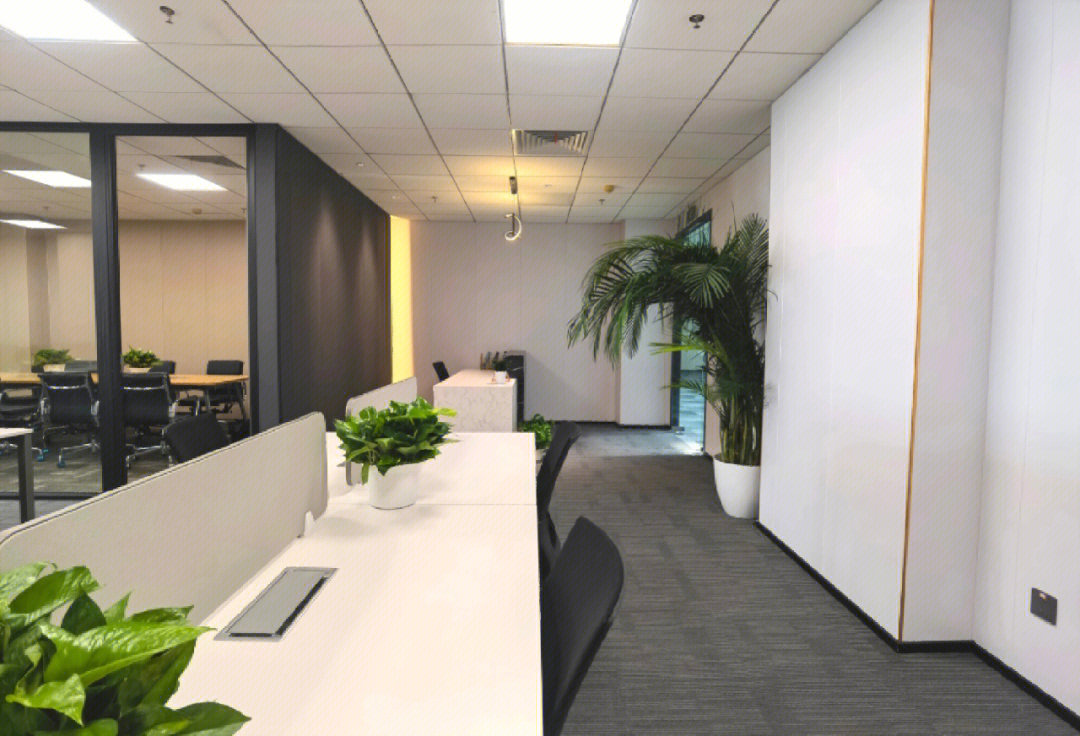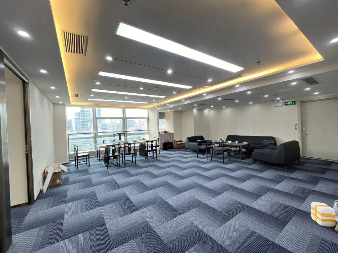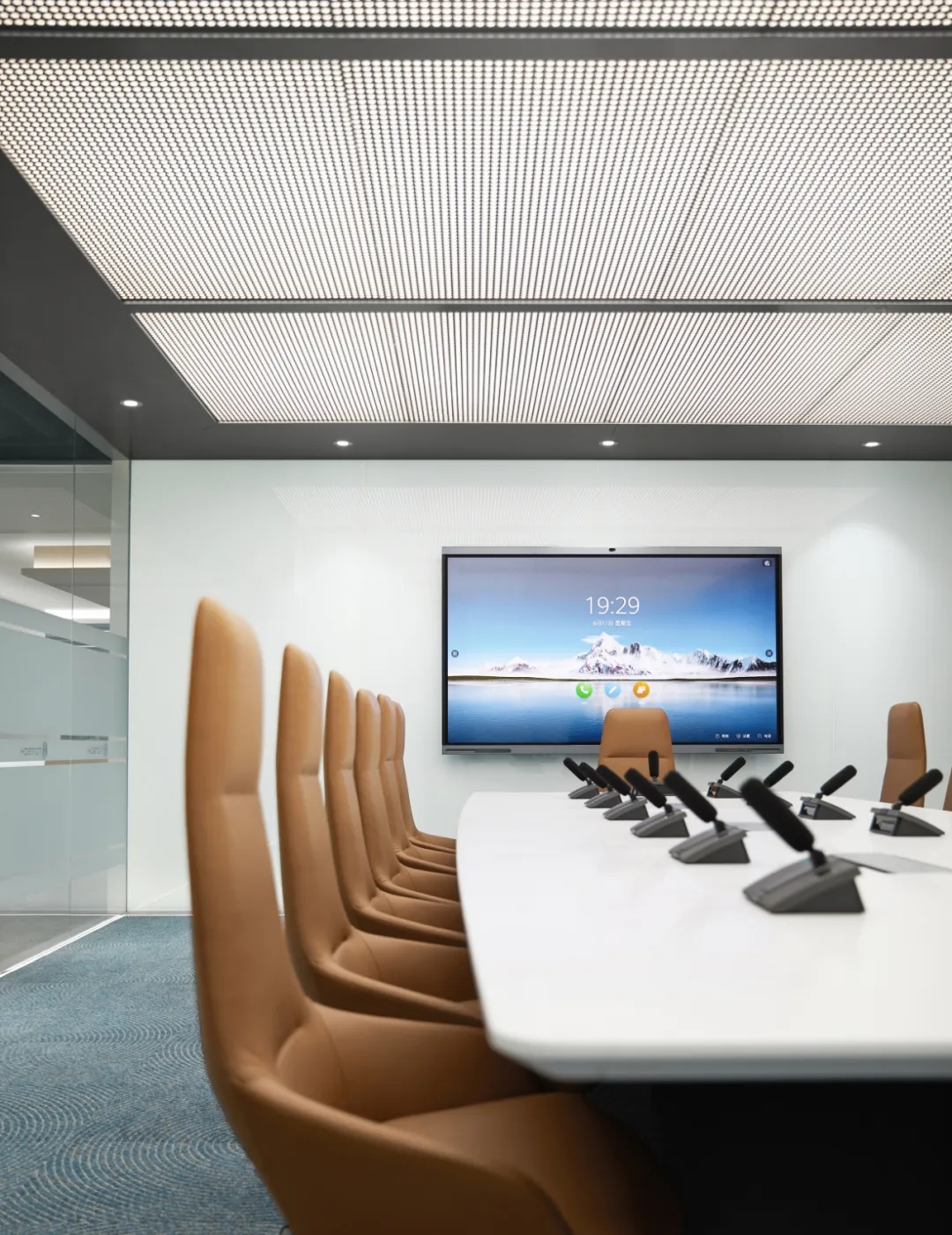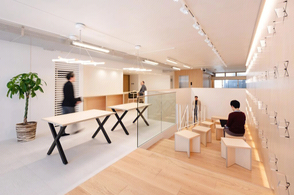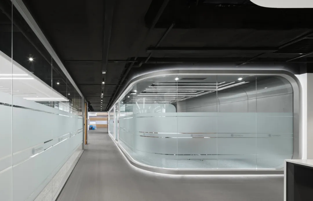 创意中心是办公区域中较大的一处共享型复合空间,在这里可开展演讲、头脑风暴、茶歇咖啡、聚会等多种活动,同时也引导员工探索更多的使用方式。不同明度的蓝灰垂片天花搭配局部木色墙面使此空间理性科技又不乏温馨舒适。内部办公空间设计中,将沿窗采光较好的区域规划成了专注工作区,沿内部核心筒区域则布置了供员工交流、休憩及灵动办公的茶水休闲空间。