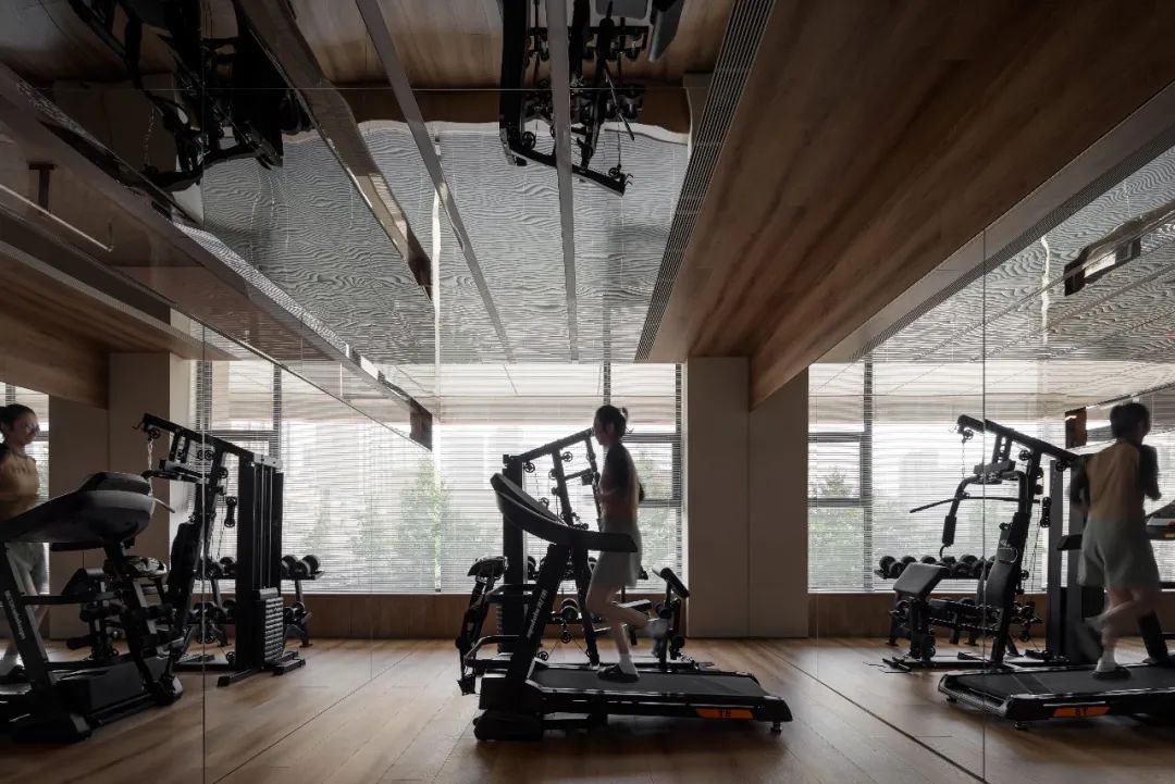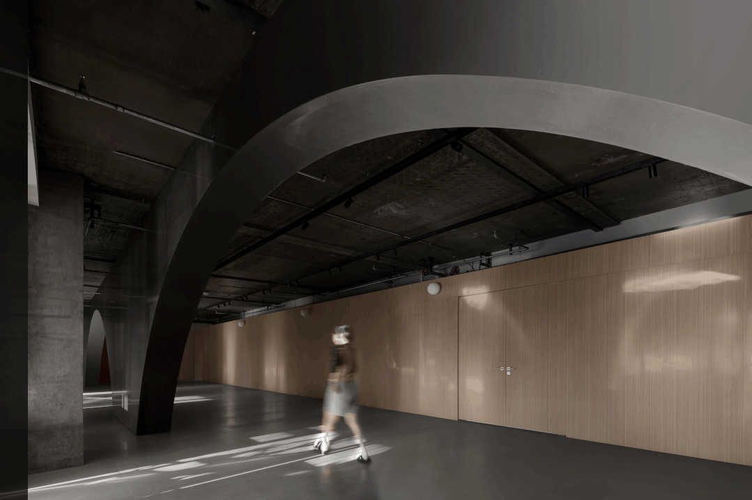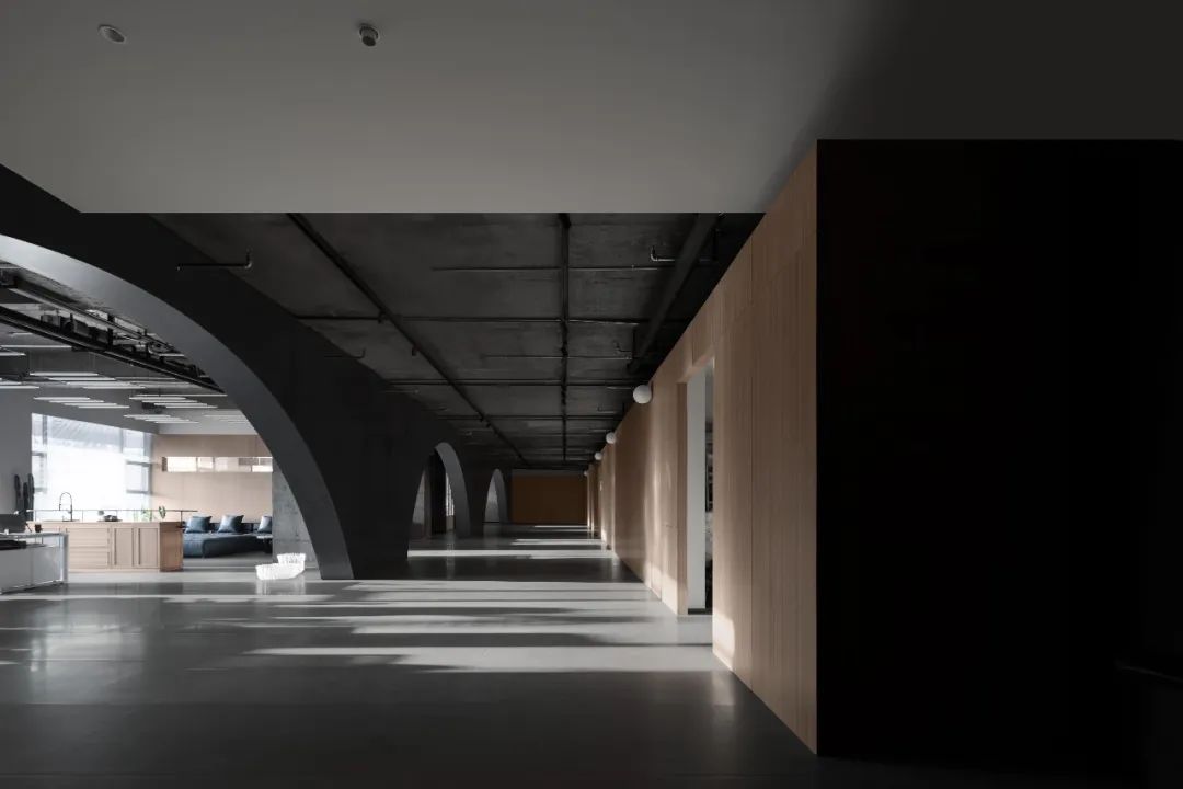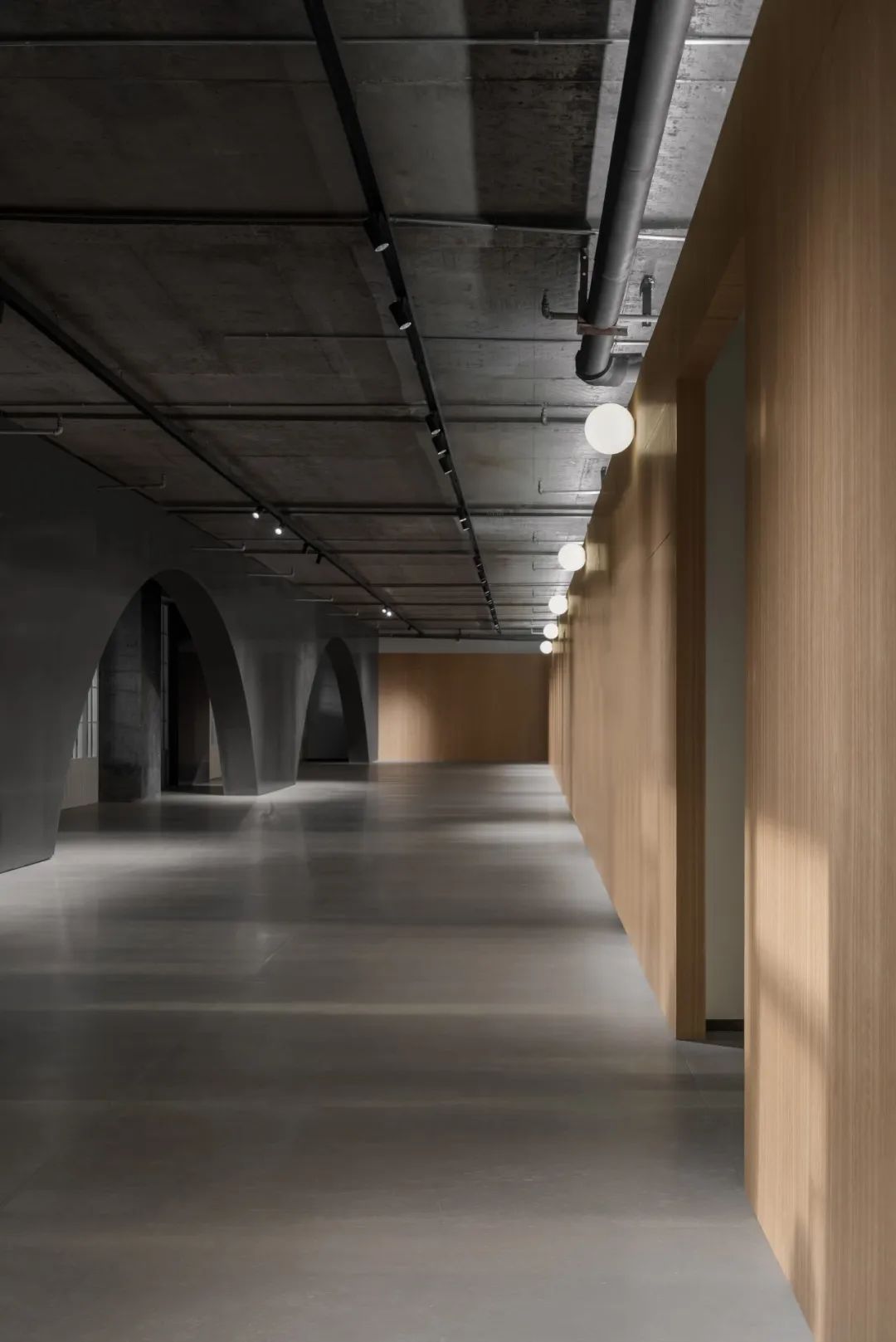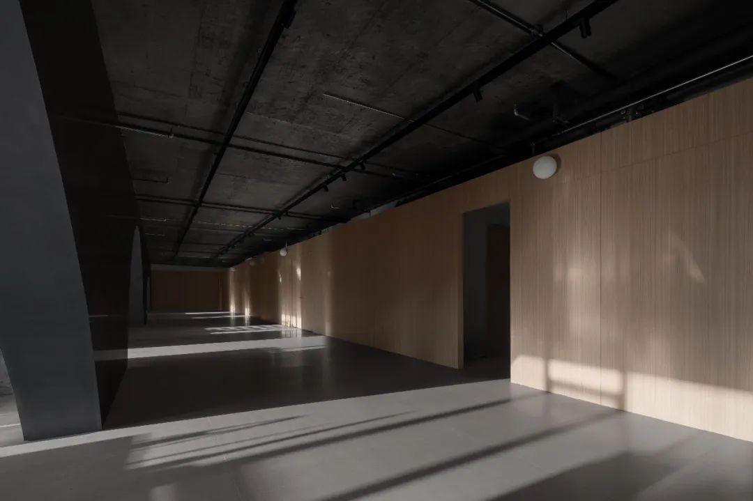 石材与木饰面,温润与粗粝,强烈的对比与共生促进了光与空间的交流。有形的结构变得飘渺,虚实之间给人的感觉是生动而通透。在透明与半透明的状态下,暧昧的光线也随之交错,展现了理性主义与浪漫诗意的融合。