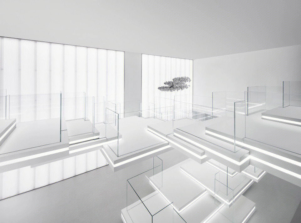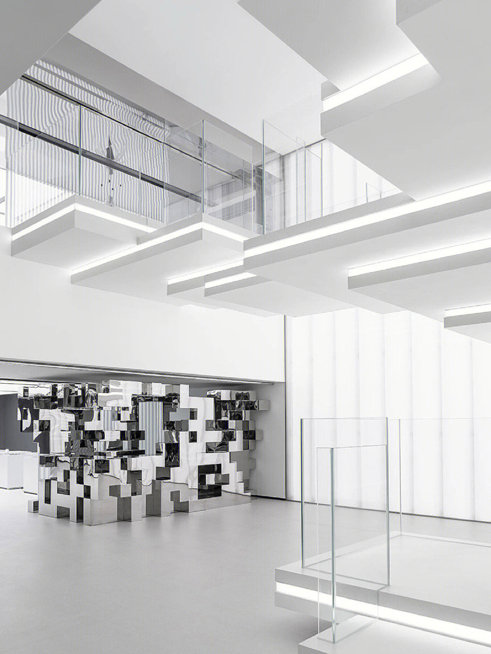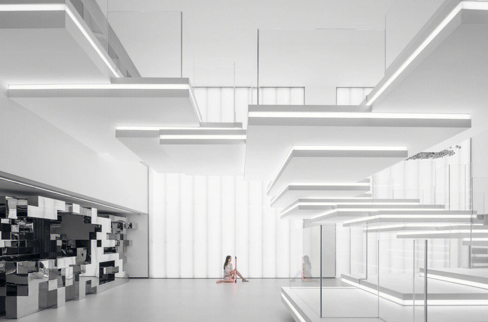 办公区空间设置以字母为形状设计的置物架,极具线性创意感。顶面主色调为灰色,采用轨道射灯和白色圆形吊灯相结合的布置。