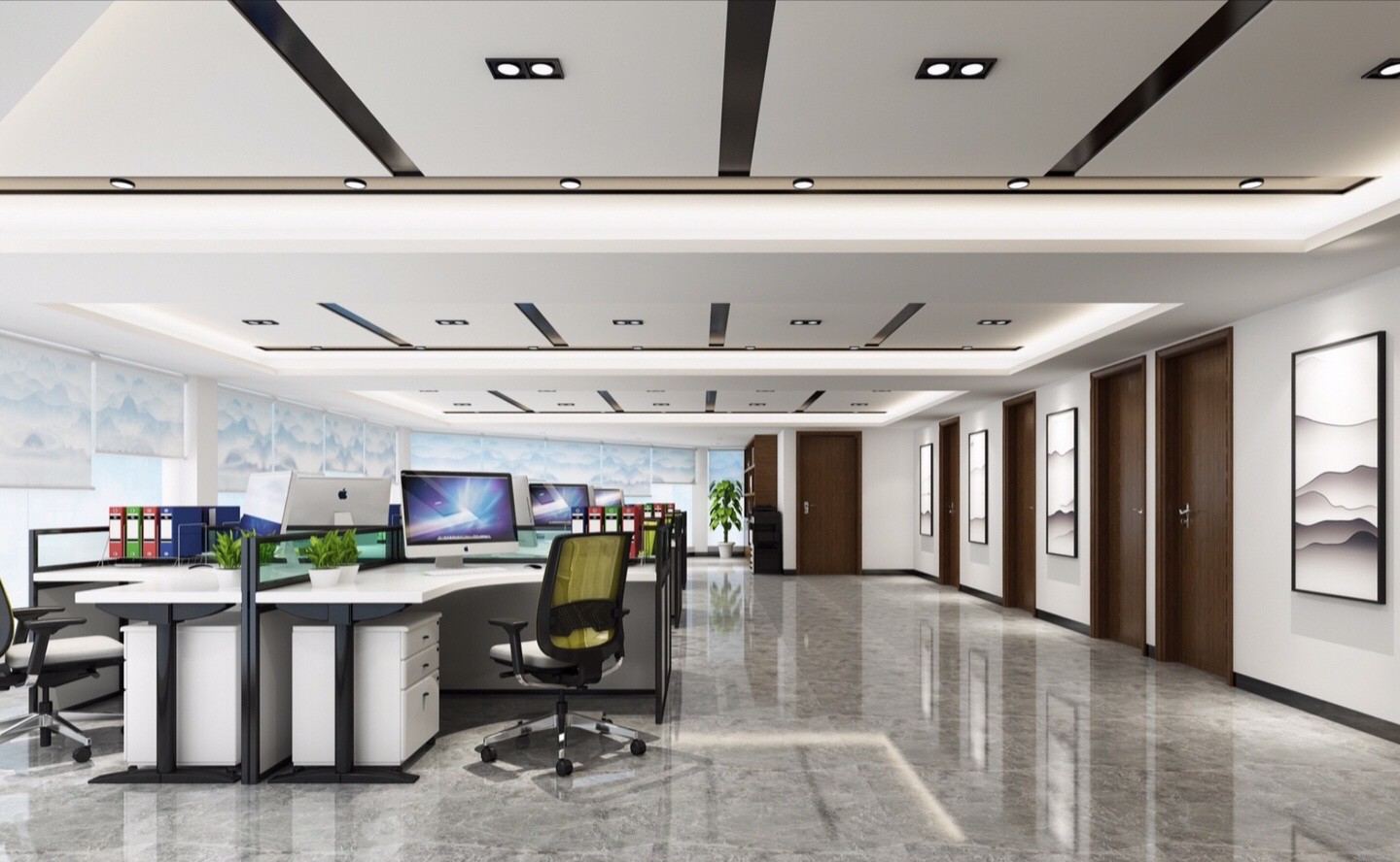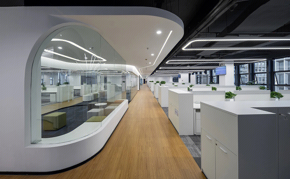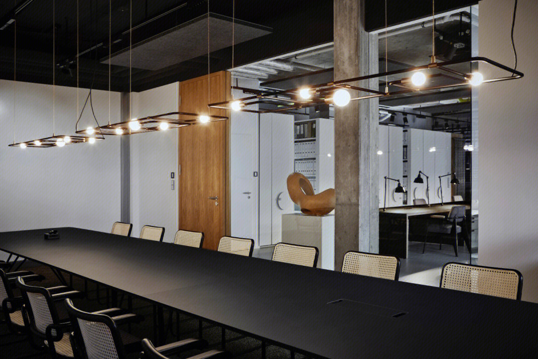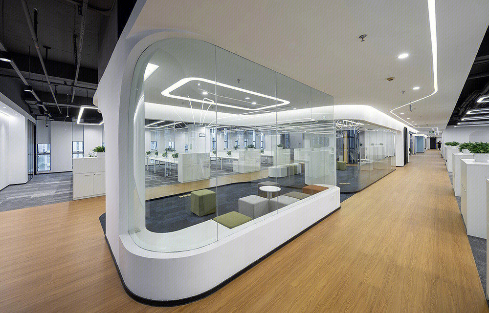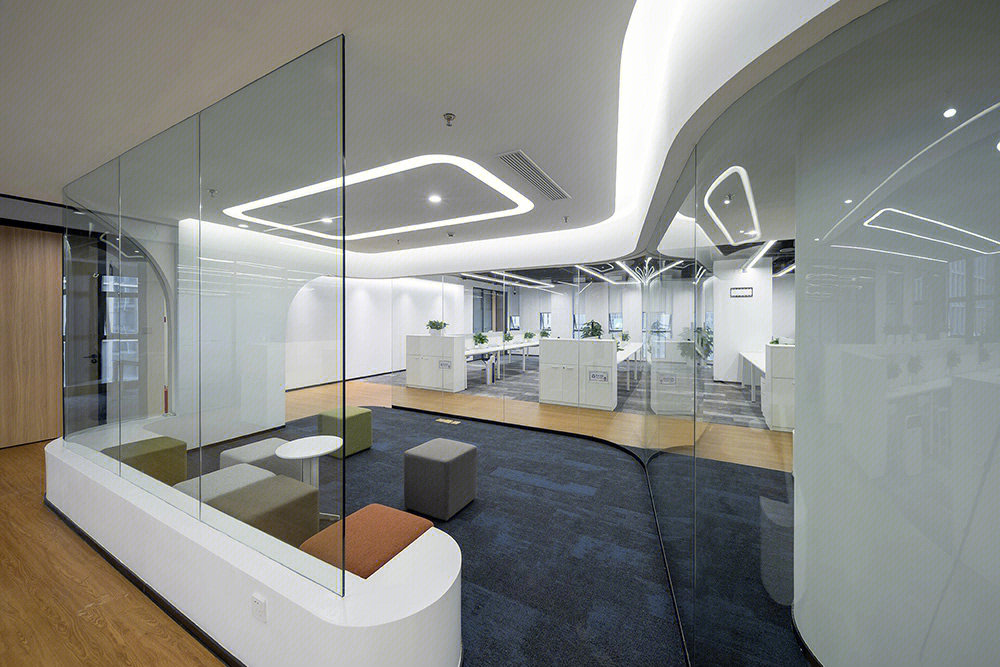 独立办公室的空间组成结构是由办公区、休闲区和小型会议区组合而成。顶面的黑色金属线型线条带来科技现代感,白色基调烘托出空间的柔和与干练,高级的家具尽显使用者的品味。
