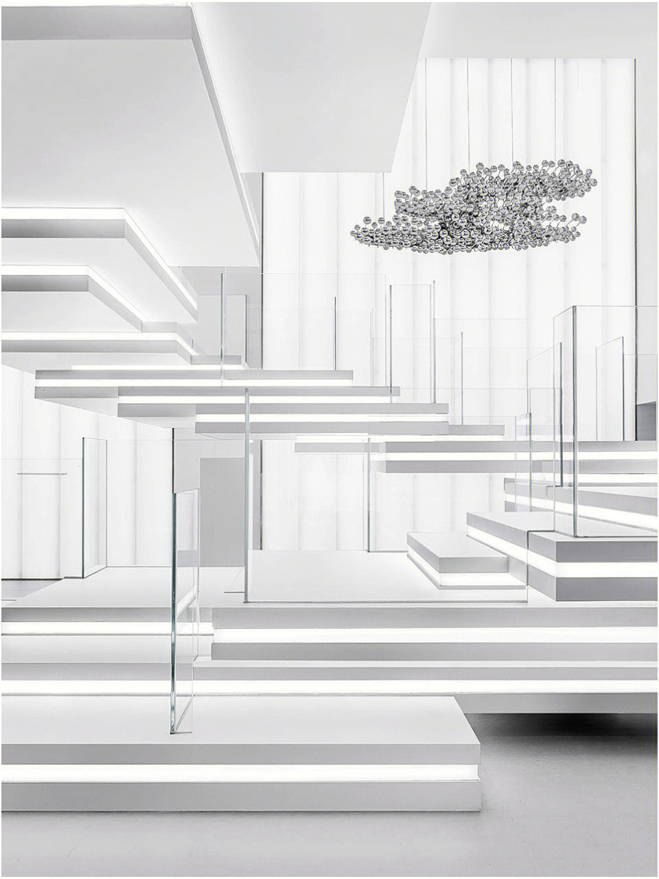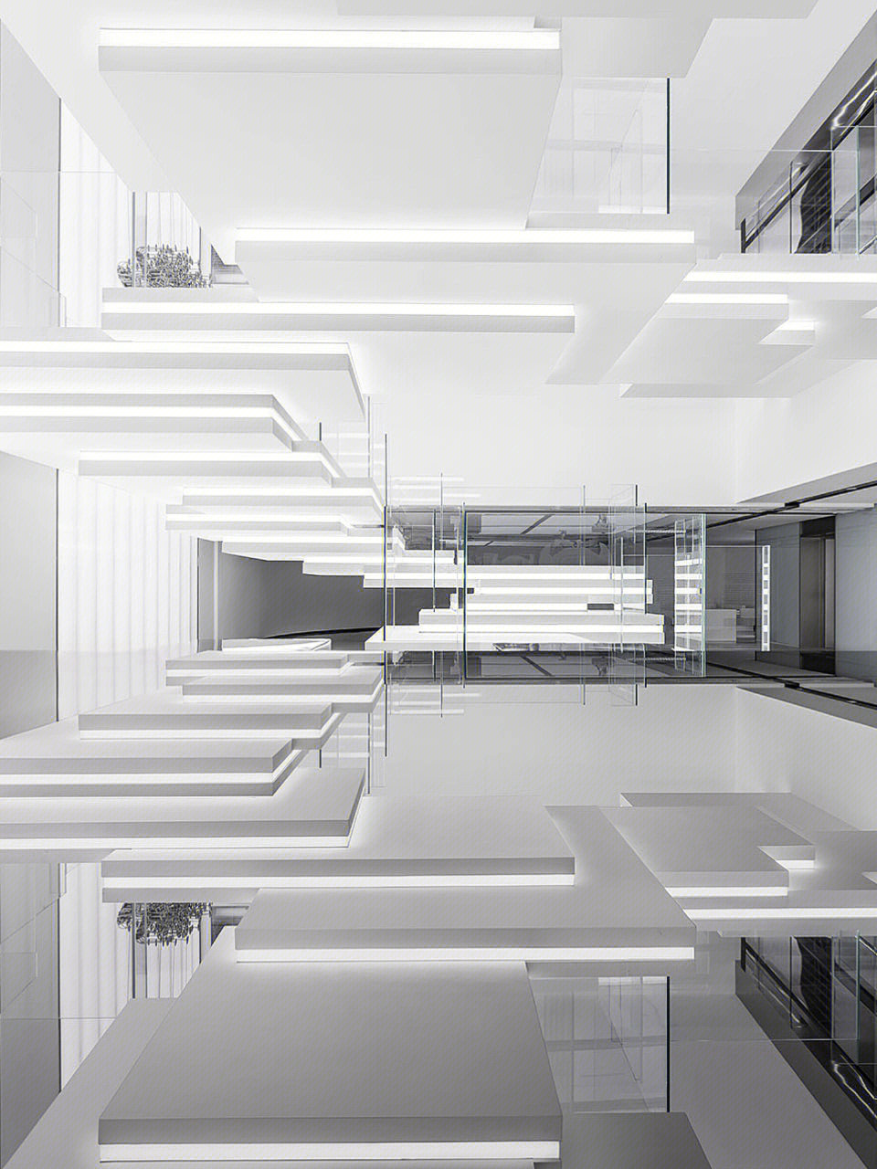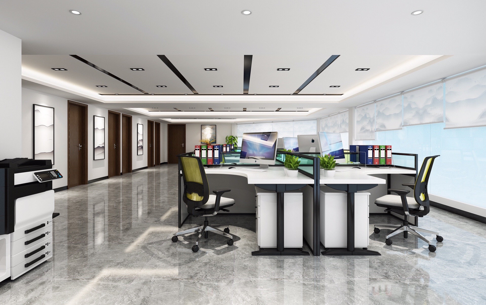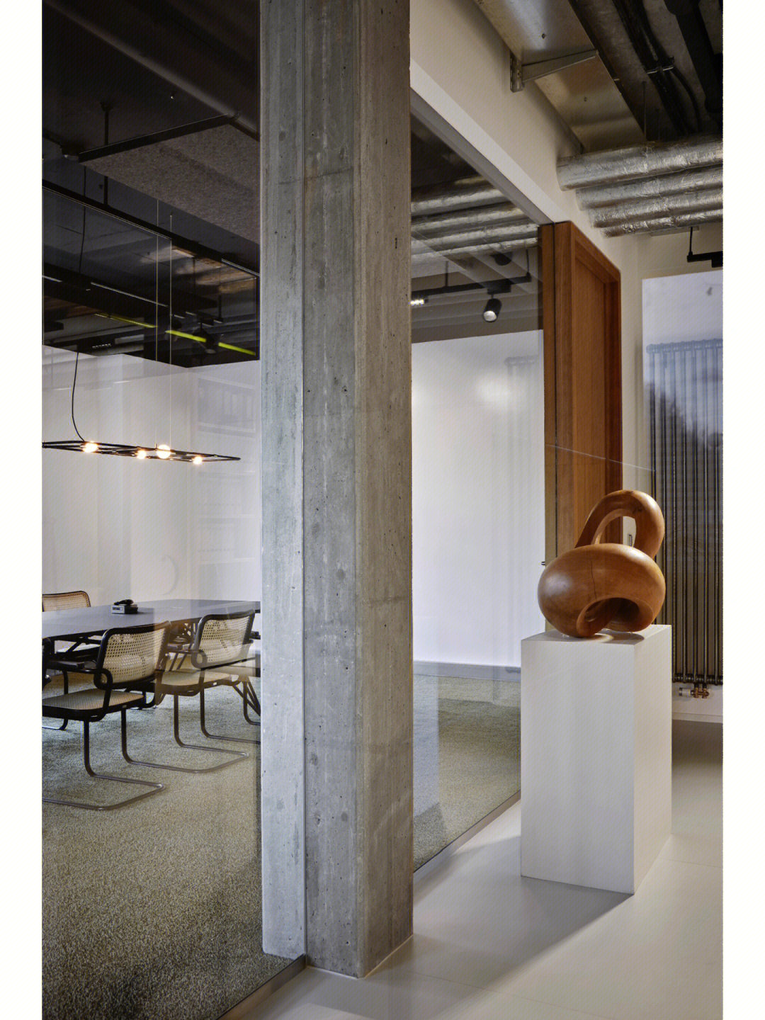 独立办公室的空间组成结构是由办公区、休闲区和小型会议区组合而成。顶面的黑色金属线型线条带来科技现代感,白色基调烘托出空间的柔和与干练,高级的家具尽显使用者的品味。