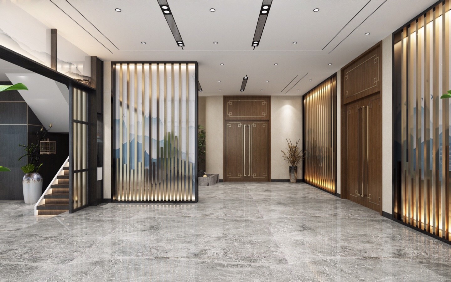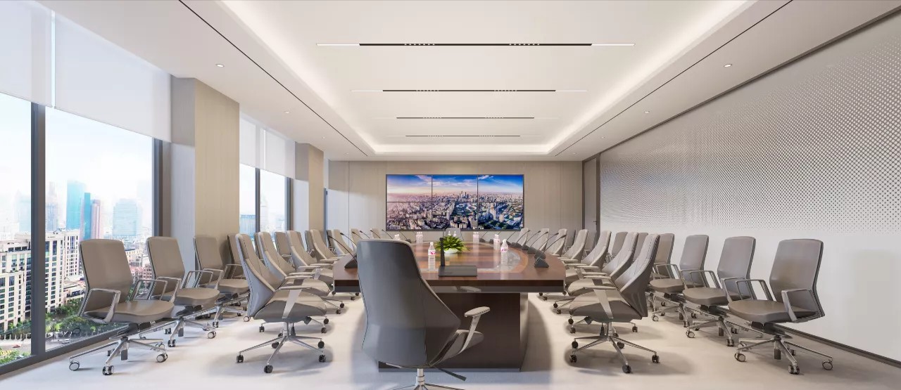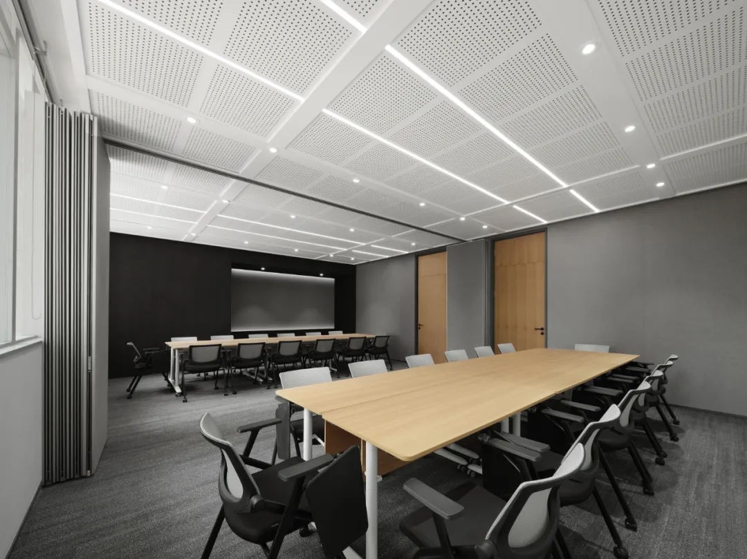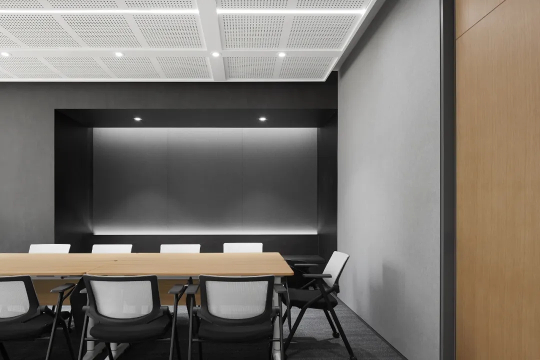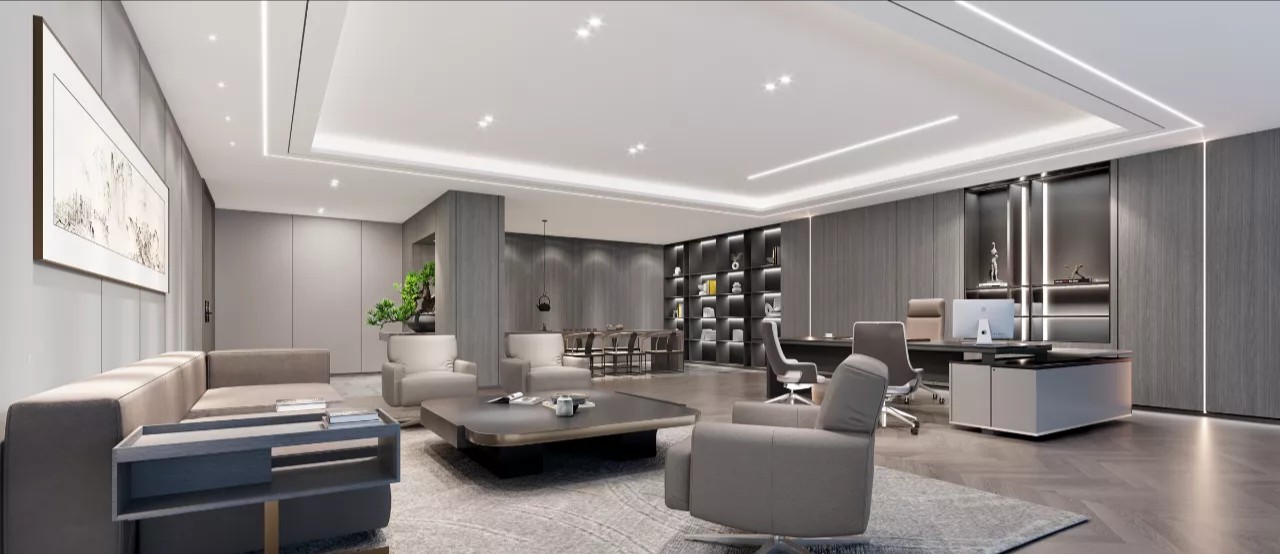 灰色调占据主导,木饰面墙体天花和大理石花纹地砖增添了空间的沉稳气息,高档的软装搭配将空间提升了一个格调,呼应了企业的工业品牌形象。