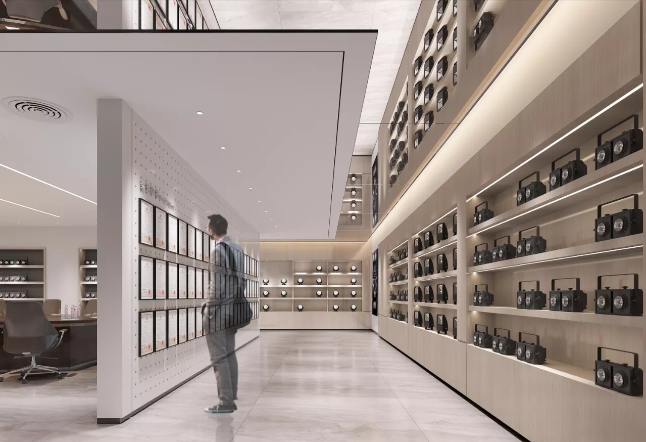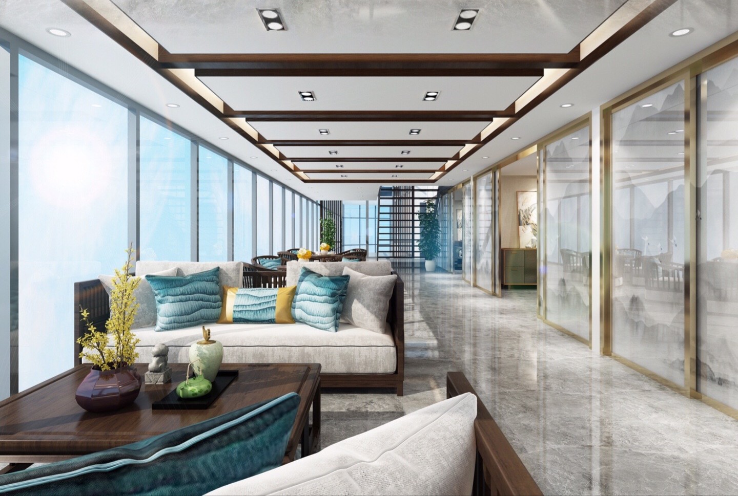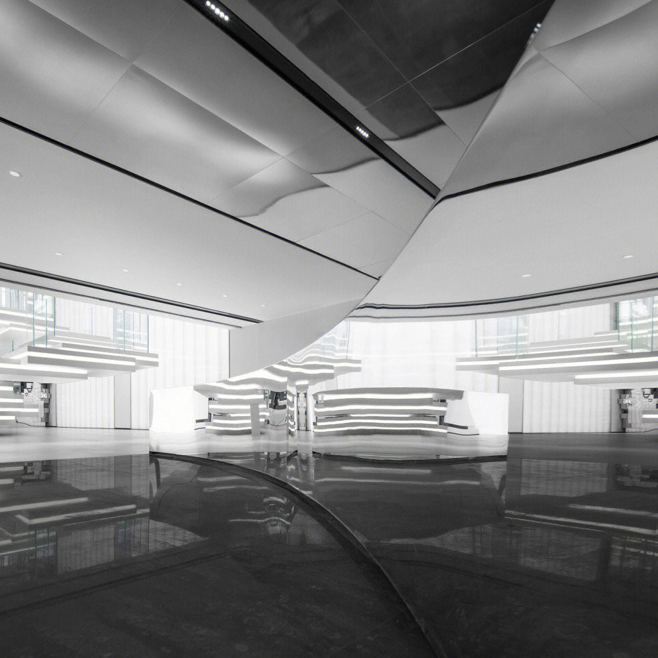 灰色调占据主导,木饰面墙体天花和大理石花纹地砖增添了空间的沉稳气息,高档的软装搭配将空间提升了一个格调,呼应了企业的工业品牌形象。