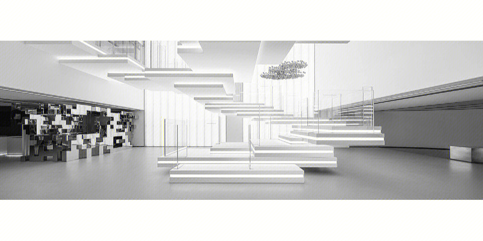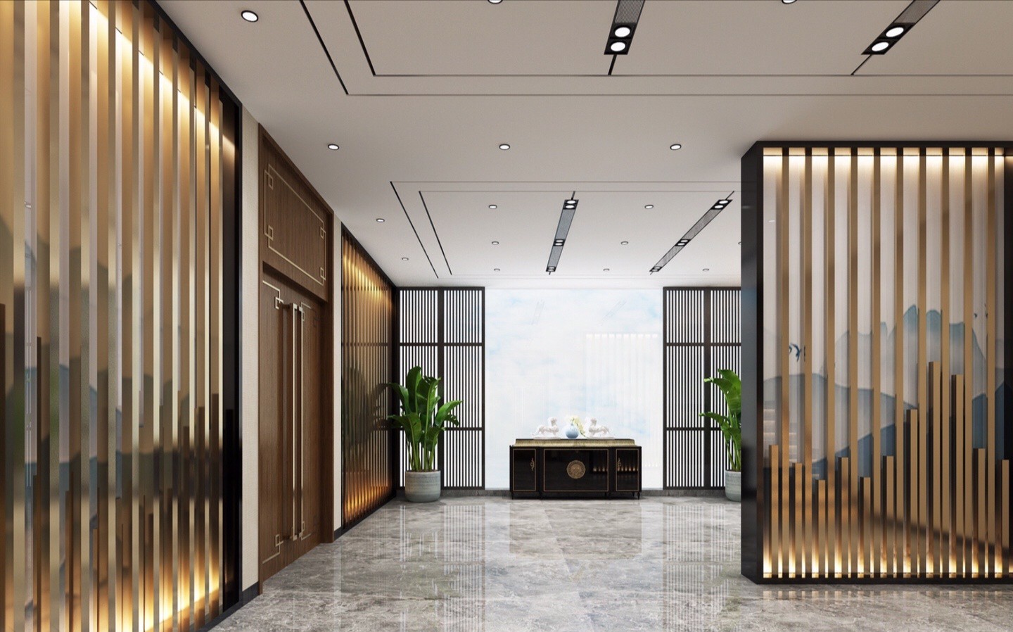 顶面采用石膏板加铝方通吊顶,且与前台形状相结合的凹槽造型,以及极具艺术感的小吊灯,再加上背景墙采用不规则的的暗藏灯带进行墙面分割,给整体构建简洁大气的视觉印象。