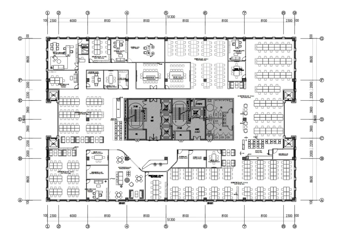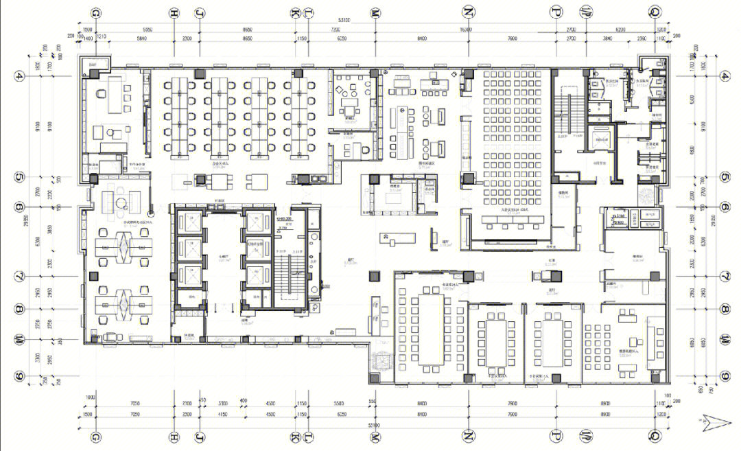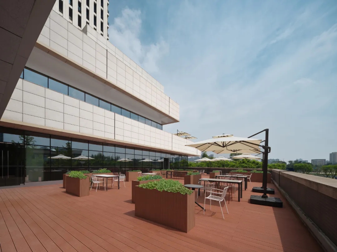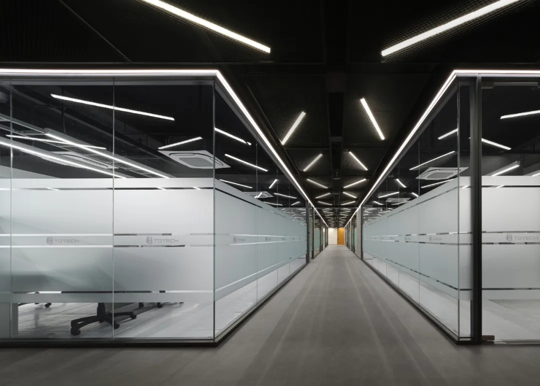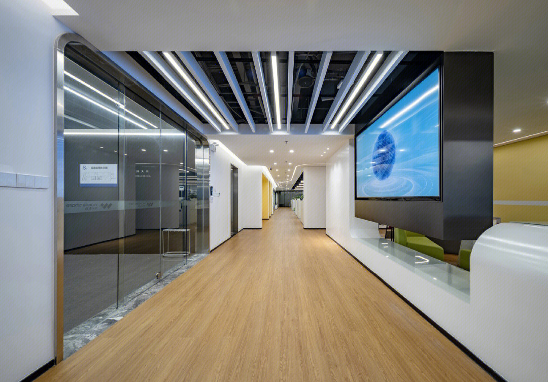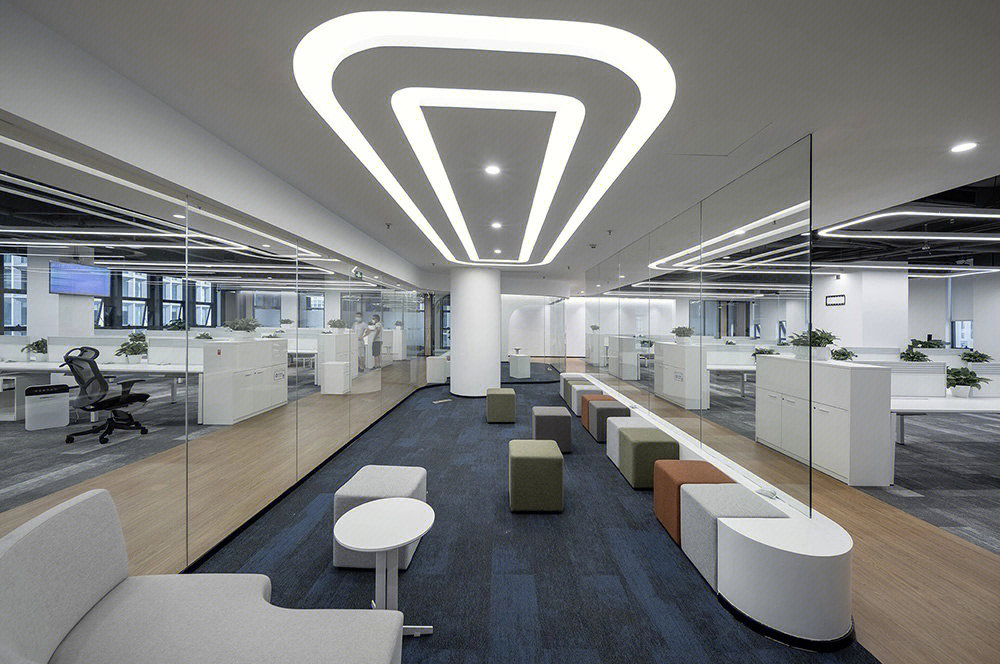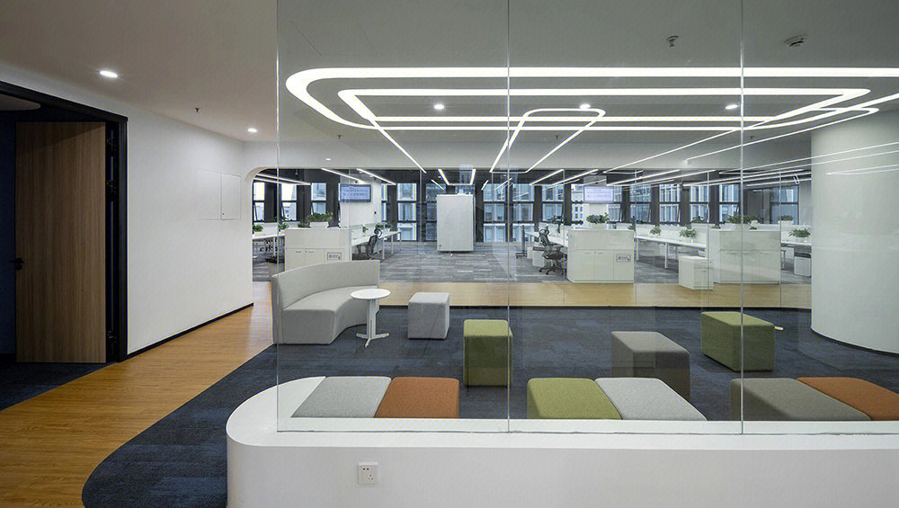 开放实验室是鼎桥通信重要的研发部门,实验室空间在整体办公空间中占据重要位置。实验室的外部空间通过黑色铁网天花、具有节奏构成的条形灯具突出了实验室区域的工业科技感。“鼎桥印”的logo红色点缀其中,营造出了极强的视觉冲击力,将实验研发区的展示性提升到了最高点。