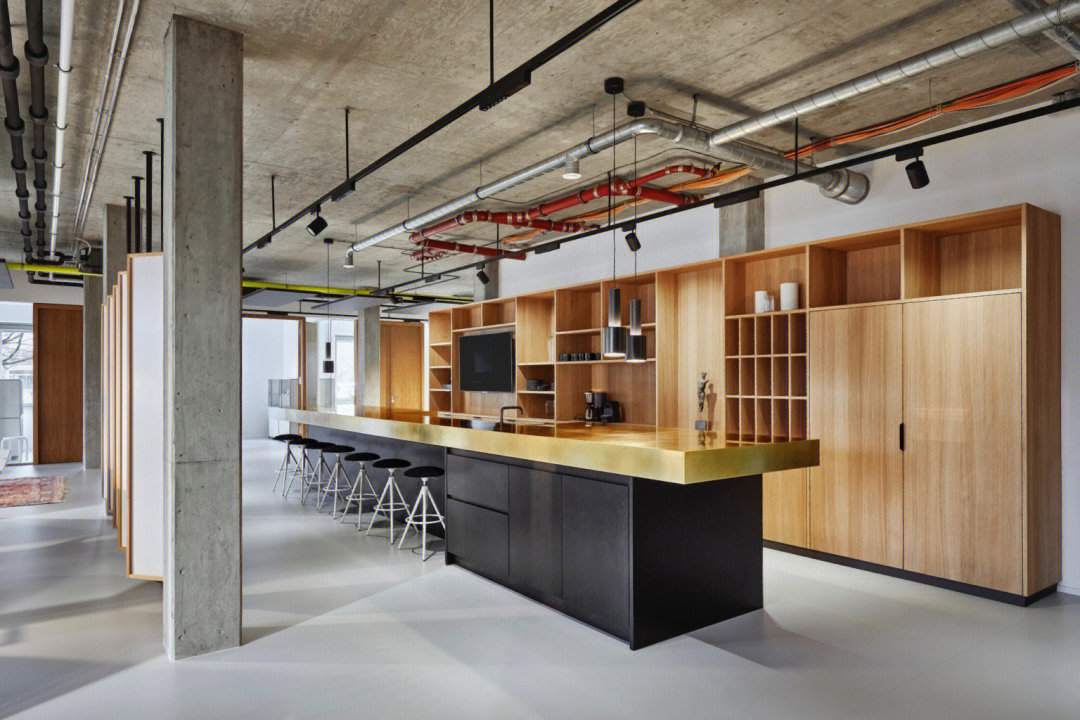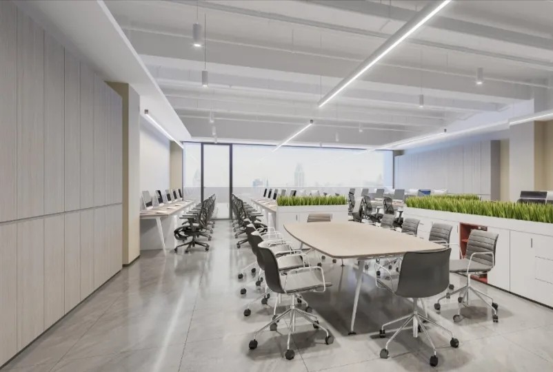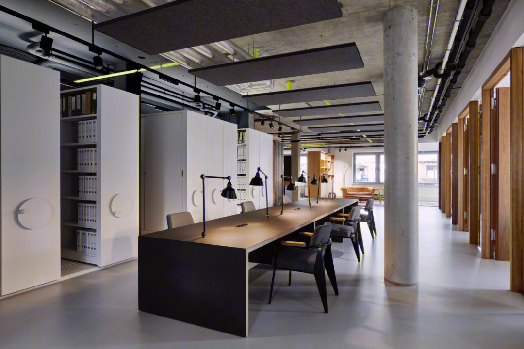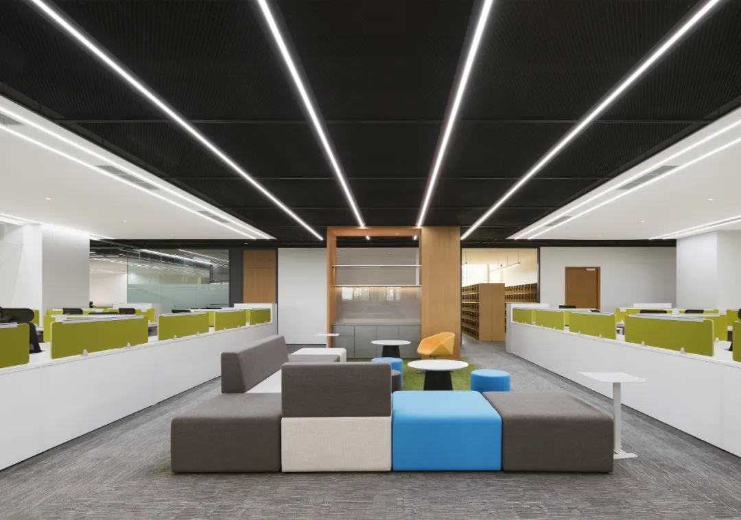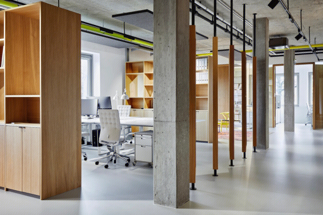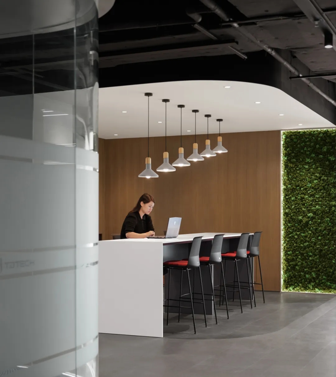 办公桌椅采用木质钢架以及浅绿色的座椅靠背增添空间活力,整体色调促进视觉上的联系,同时调节了流动区域和休息区域二者之间的平衡。