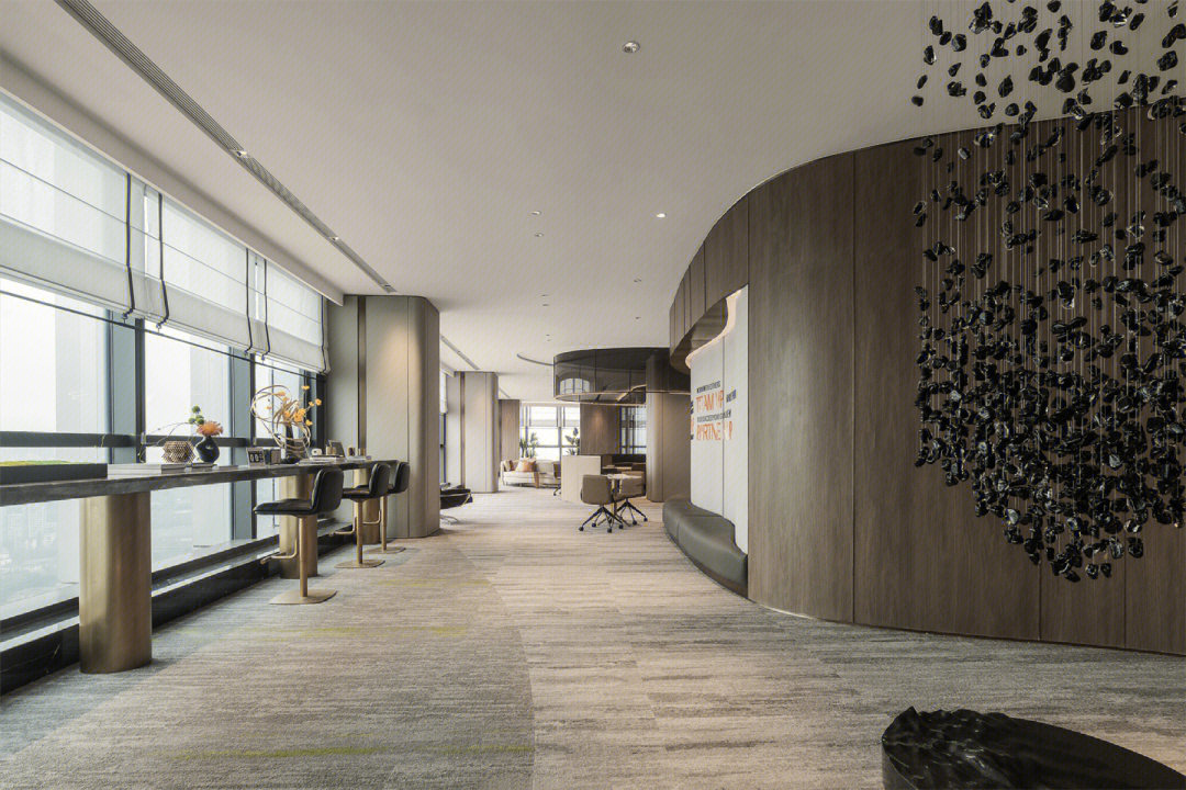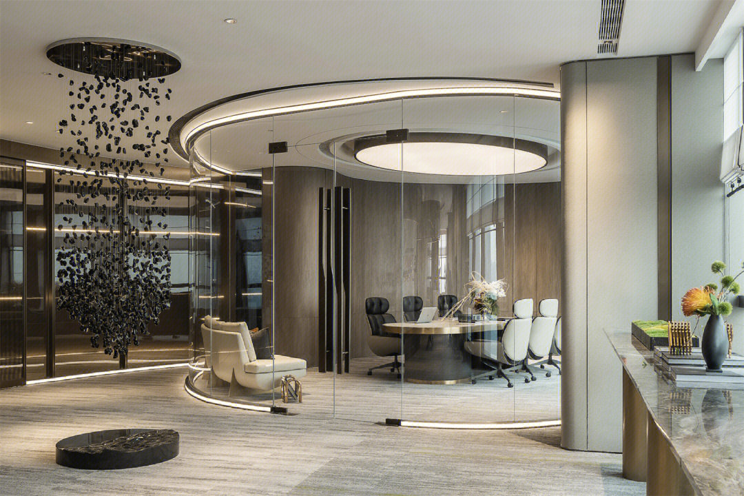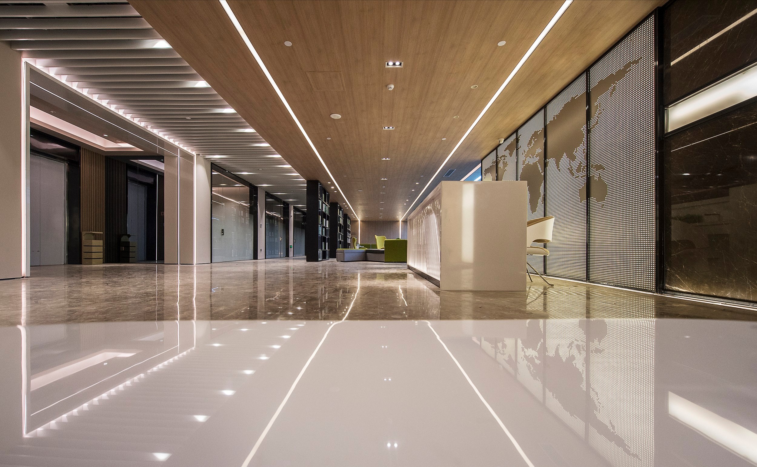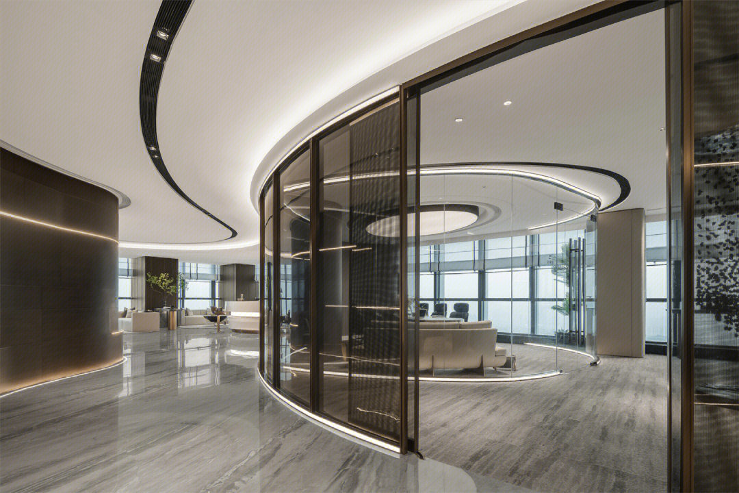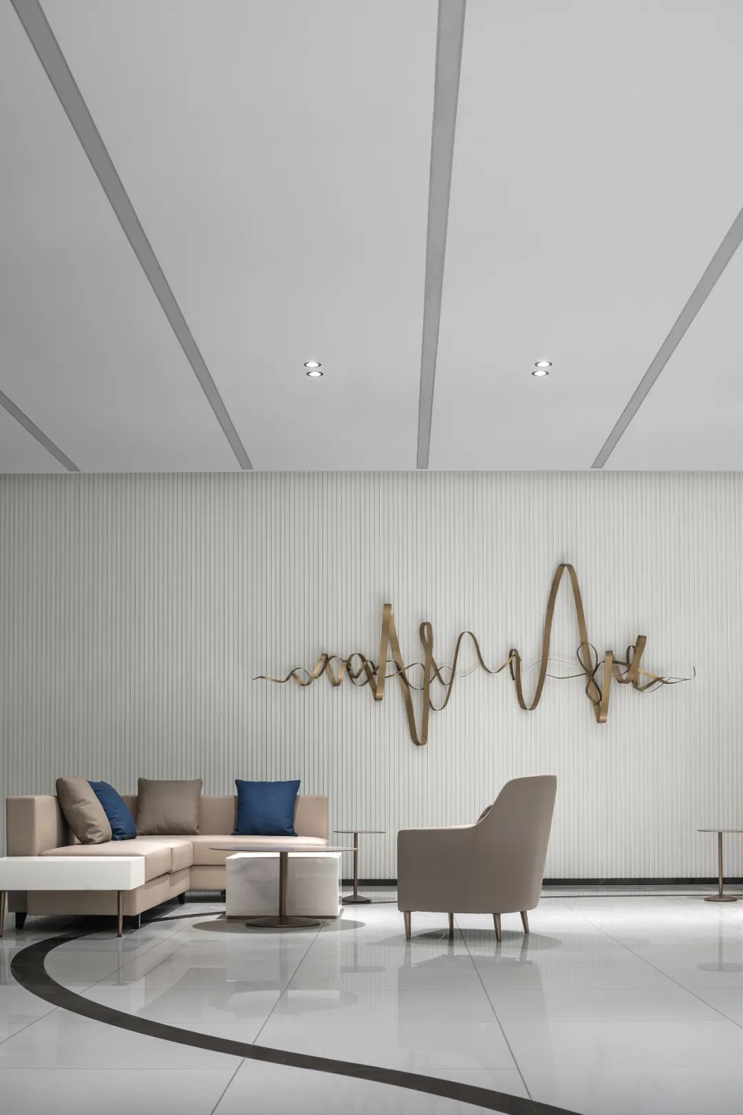 前厅顶部,镜面质感与光带反射,使空间得到延伸、重叠呼应,营造出多维的视觉效果,同时打破科技办公室设计的刻板印象,拥有宽敞开放的前台设计、待客区,层次、质感、丰满而厚重。