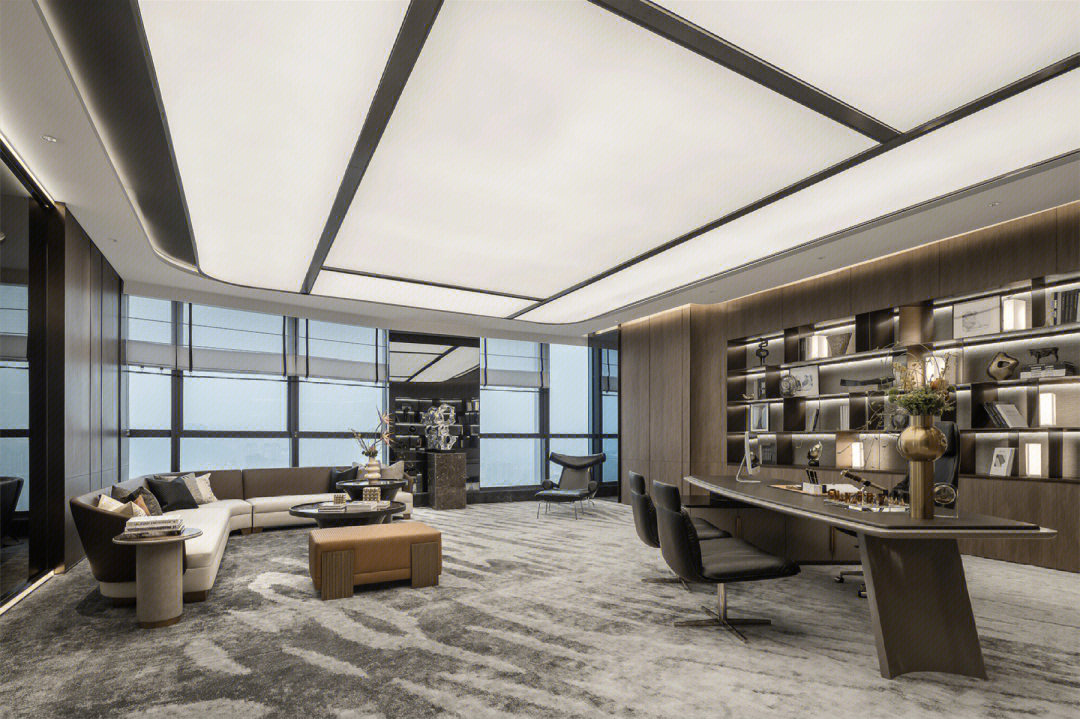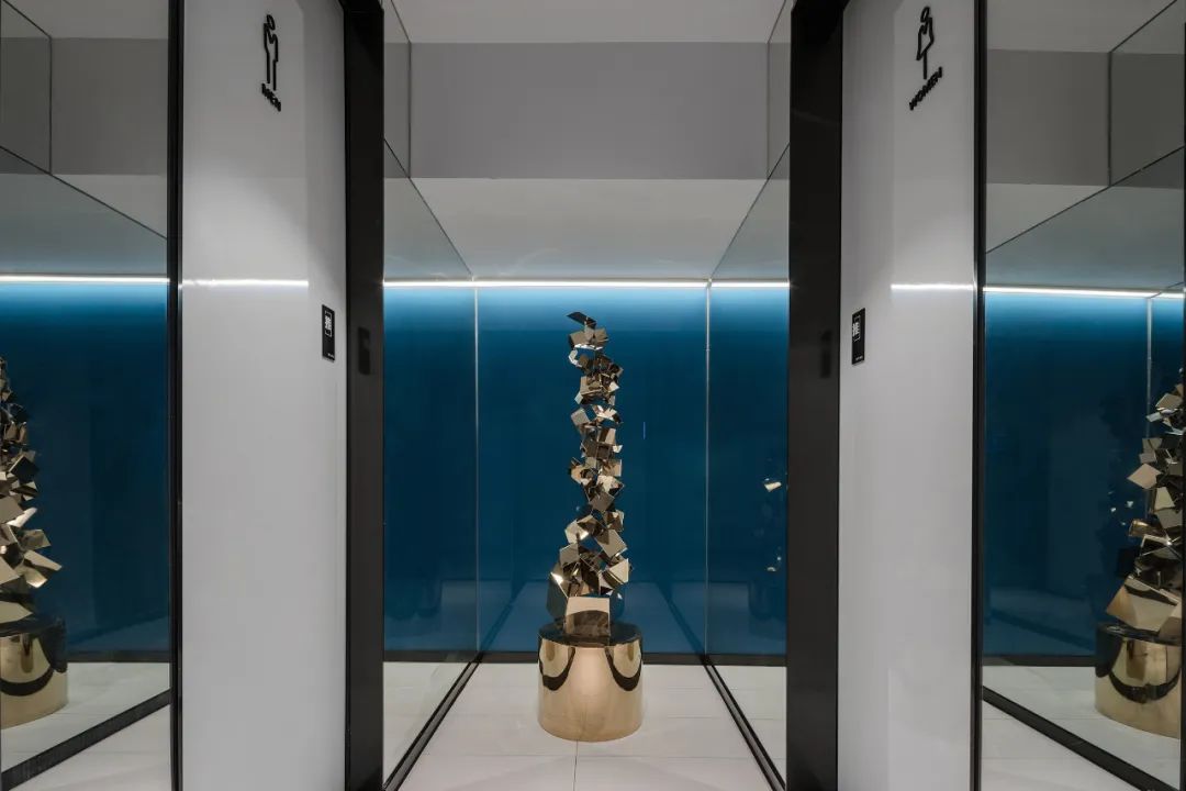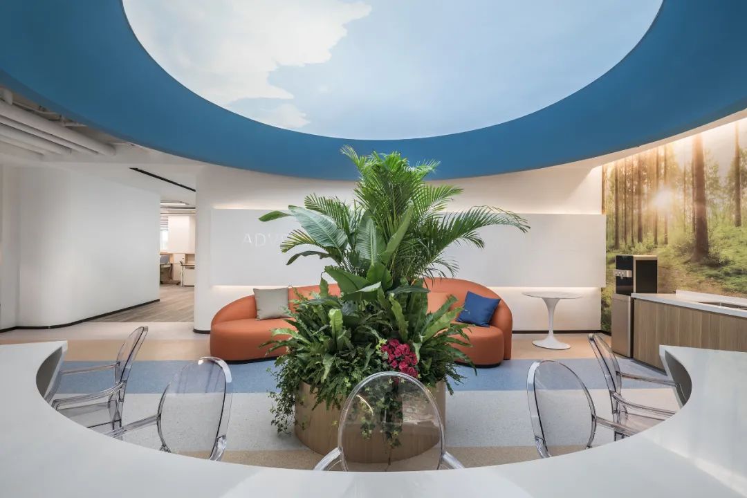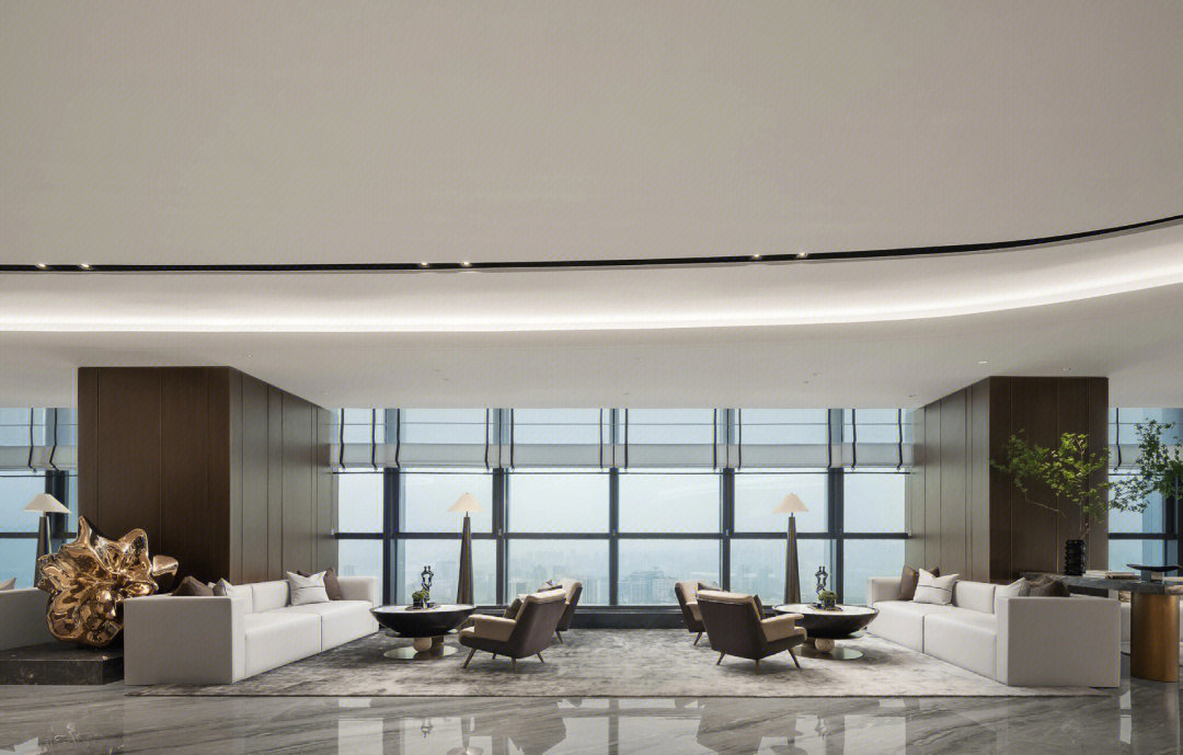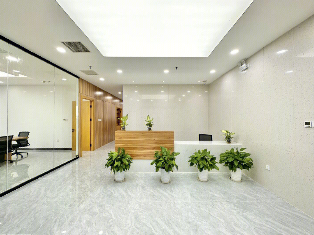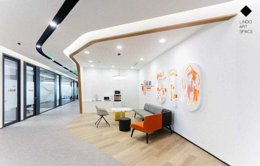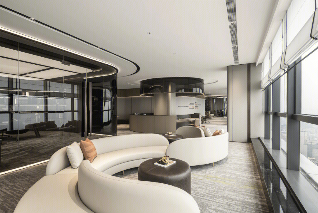 前厅顶部,镜面质感与光带反射,使空间得到延伸、重叠呼应,营造出多维的视觉效果,同时打破科技办公室设计的刻板印象,拥有宽敞开放的前台设计、待客区,层次、质感、丰满而厚重。