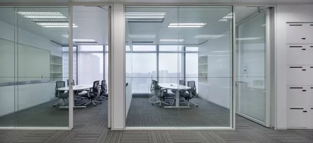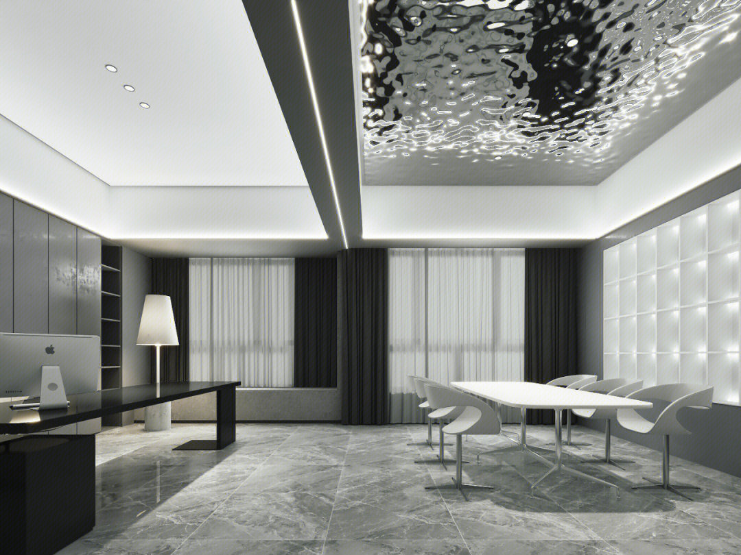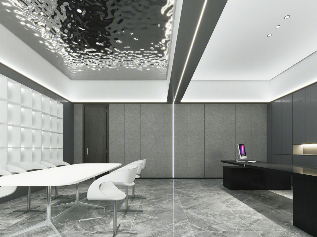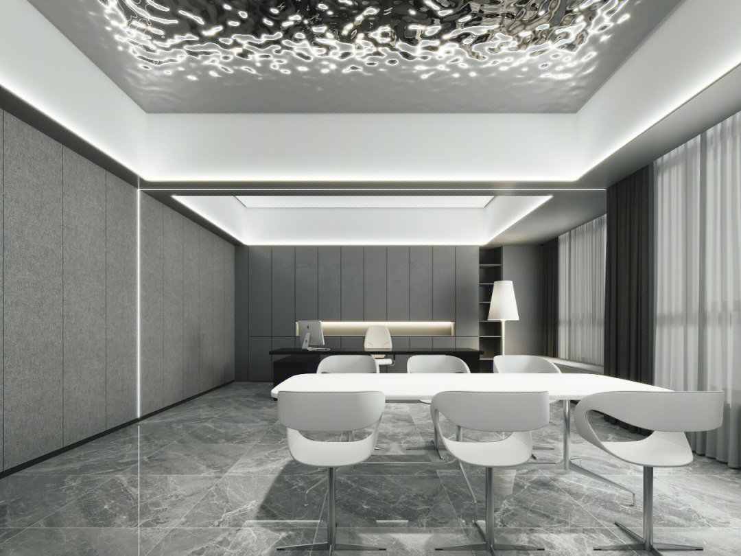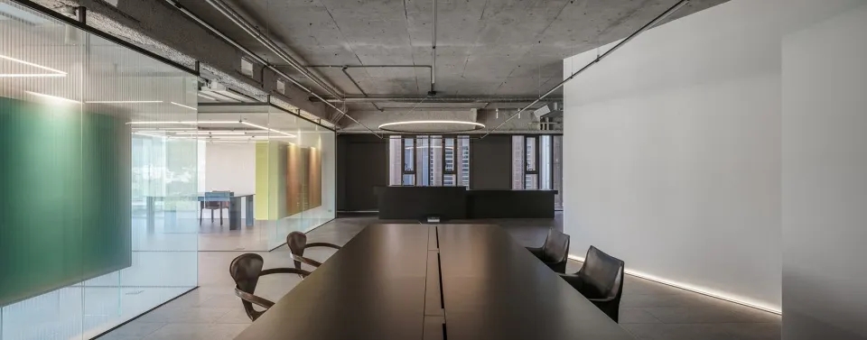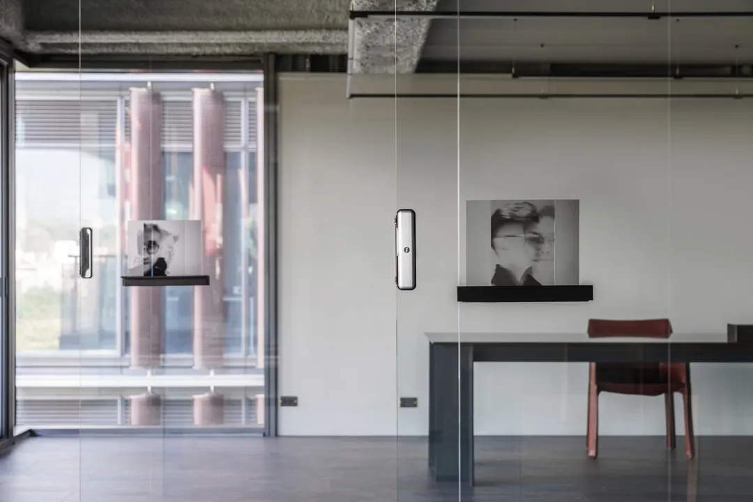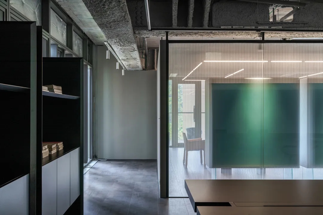 首先擒住目光的是两端俐落对称的结构画面。我们将两位合伙人的办公室视为对望的主题展间,以雕刻玻璃和清玻璃的不同透度建构朦胧迷幻的光透层次,隔间内各有两座储物柜模拟现代主义单色画作。