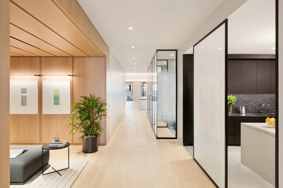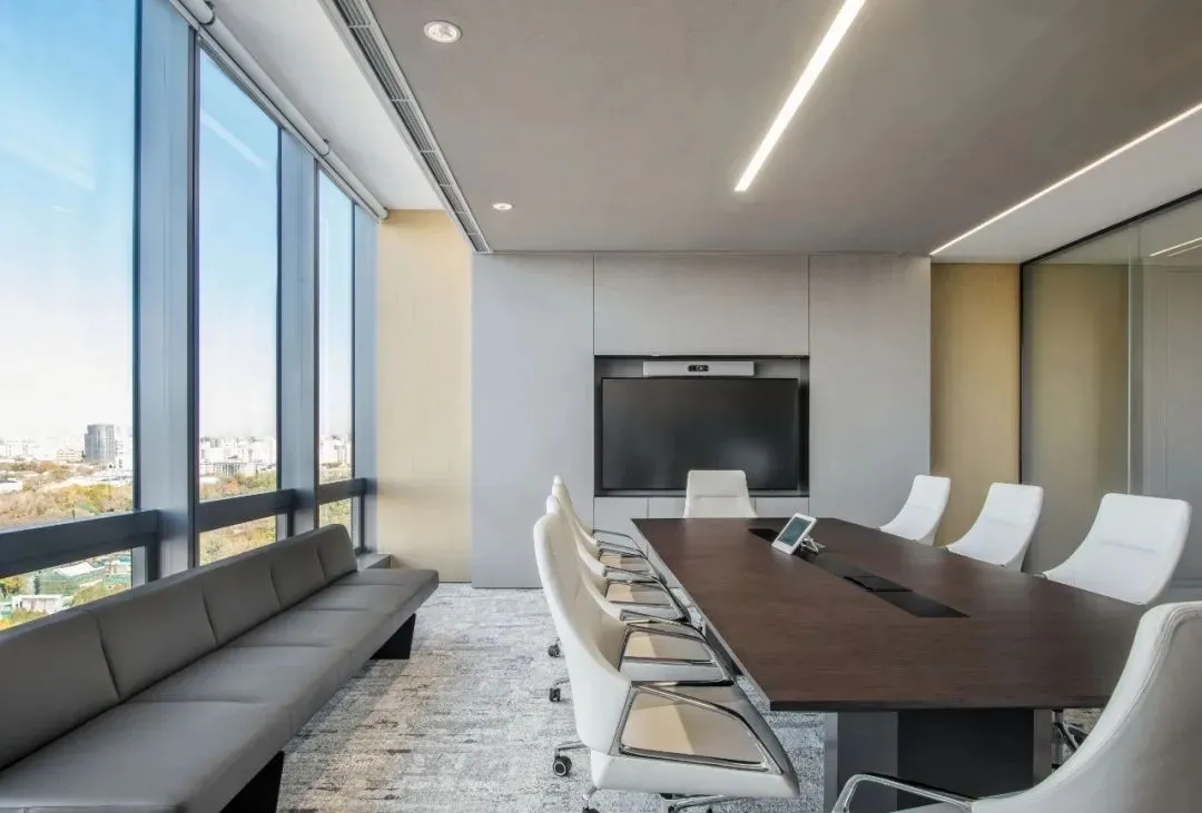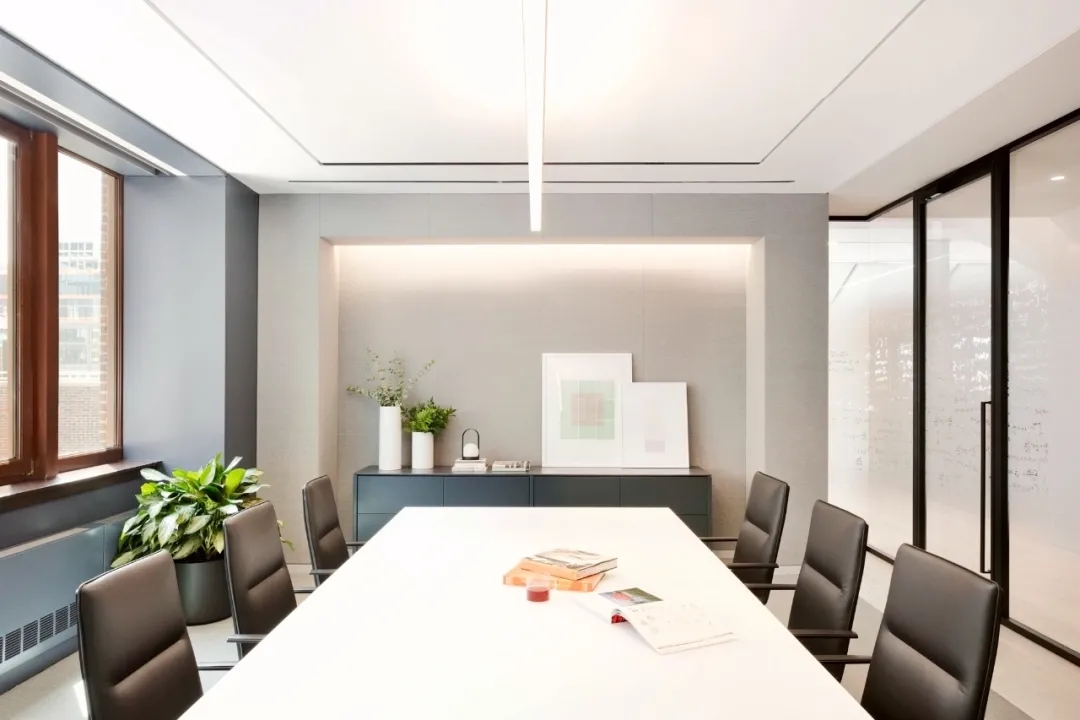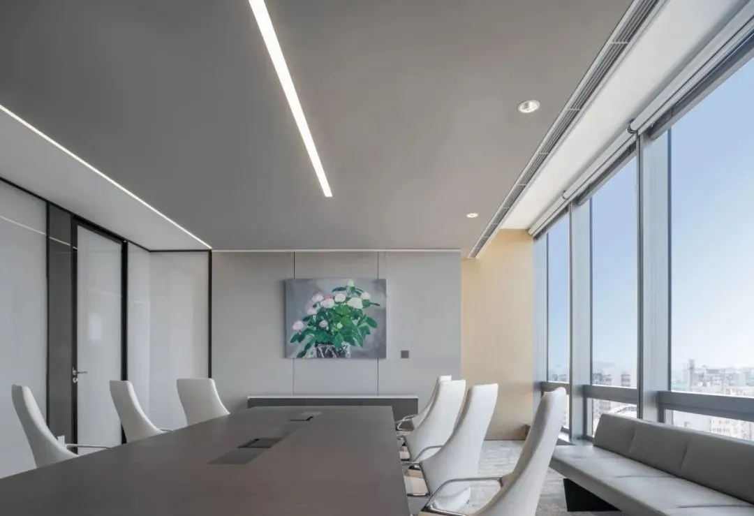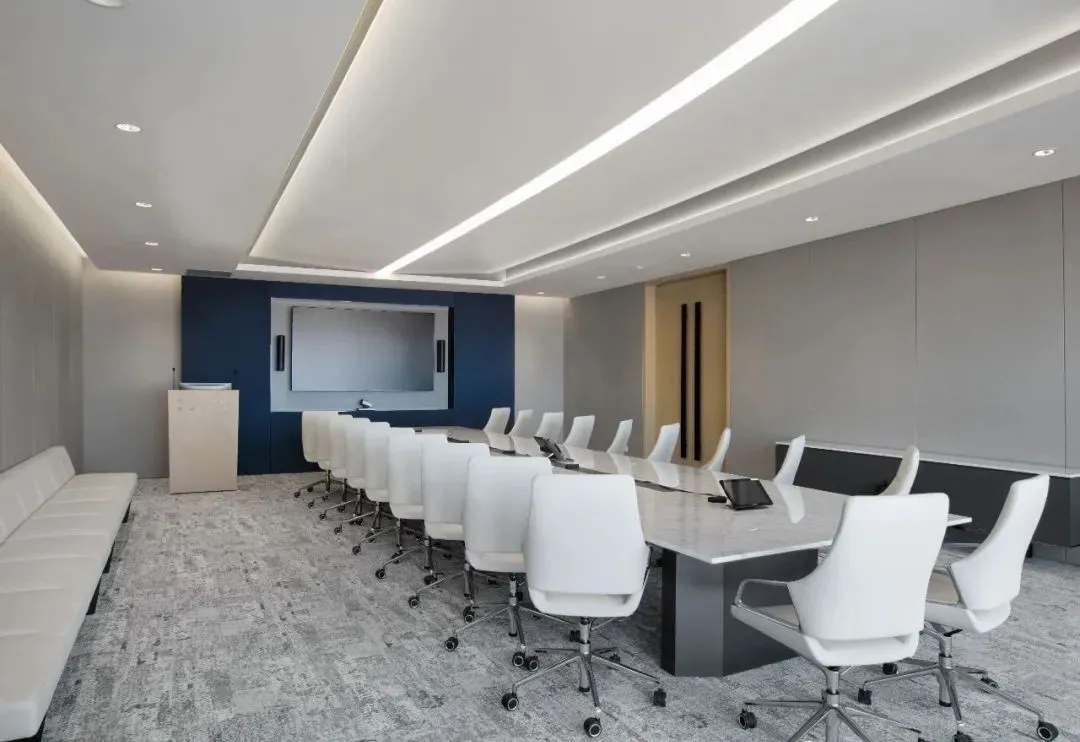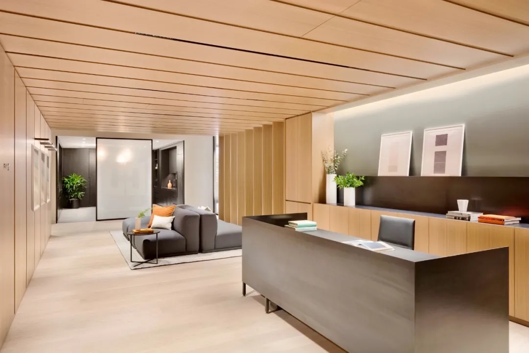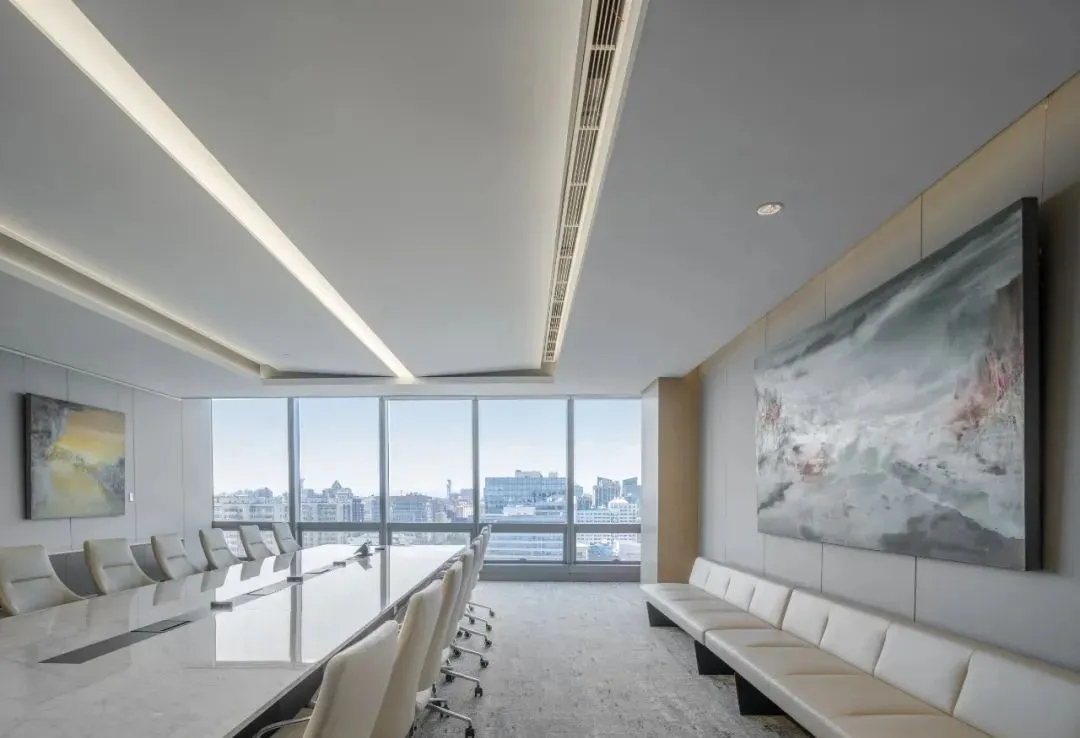 会议室高品质的家具和饰面,中间分开的天花设计细节,与空间中的其他艺术品相互呼应。颇具建筑感的接待台细节,体现在大理石和木饰面板的层次及体量感中。