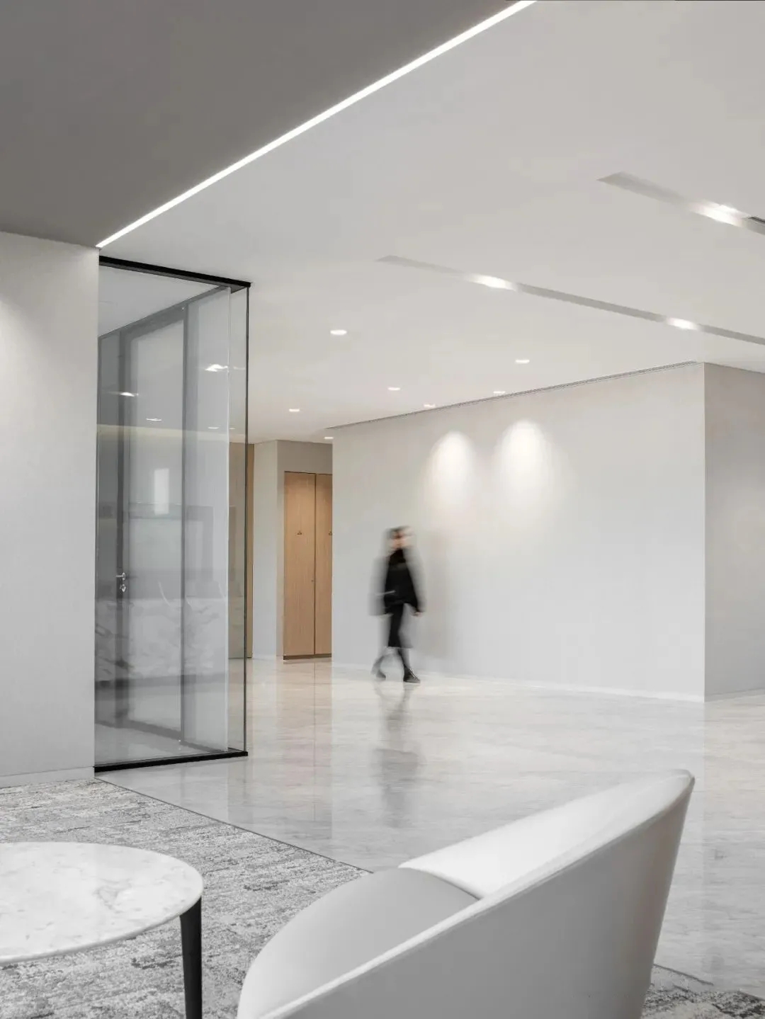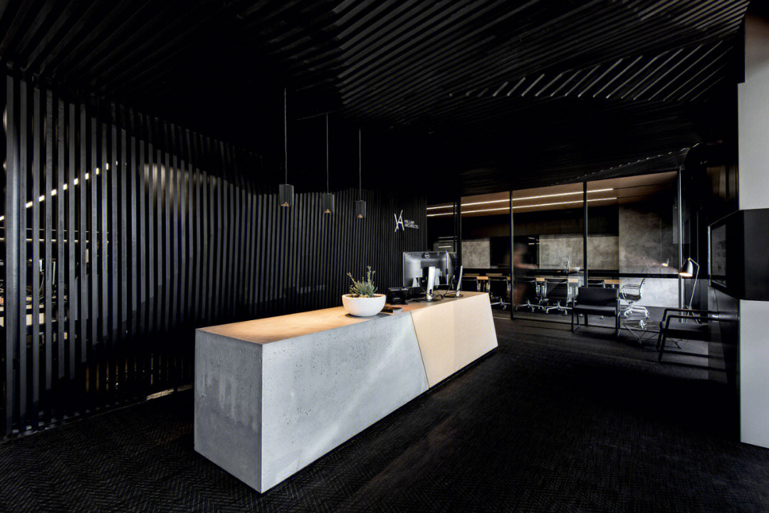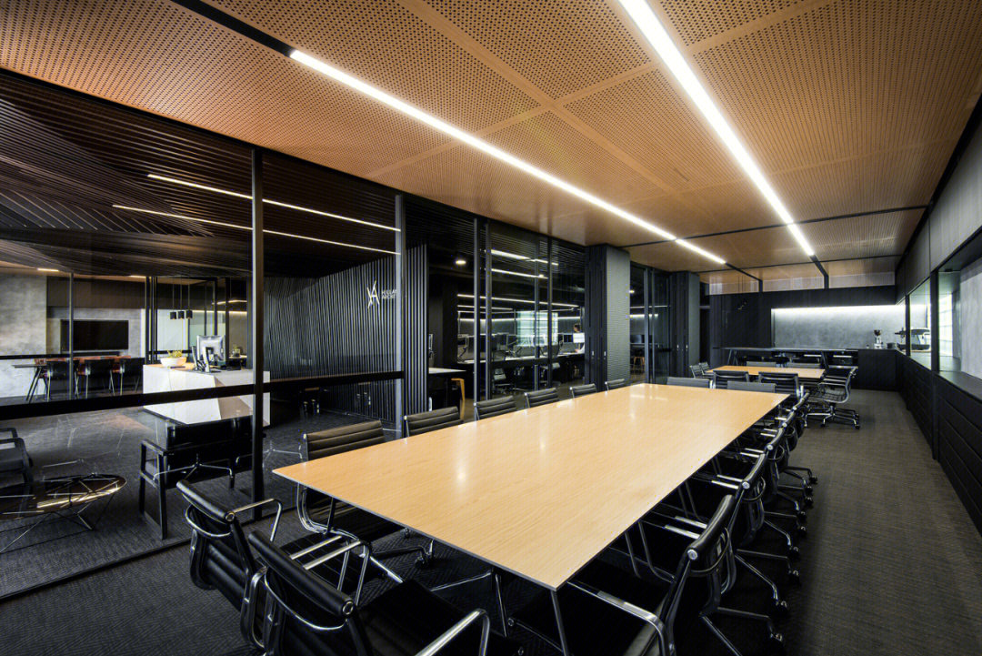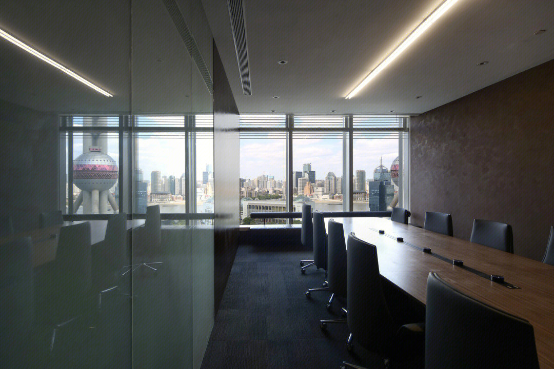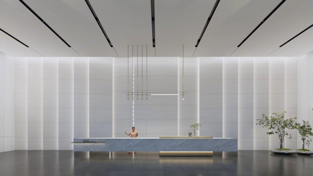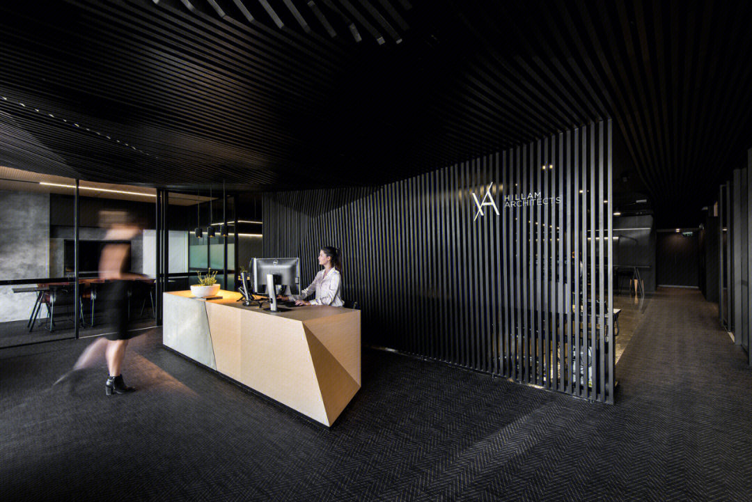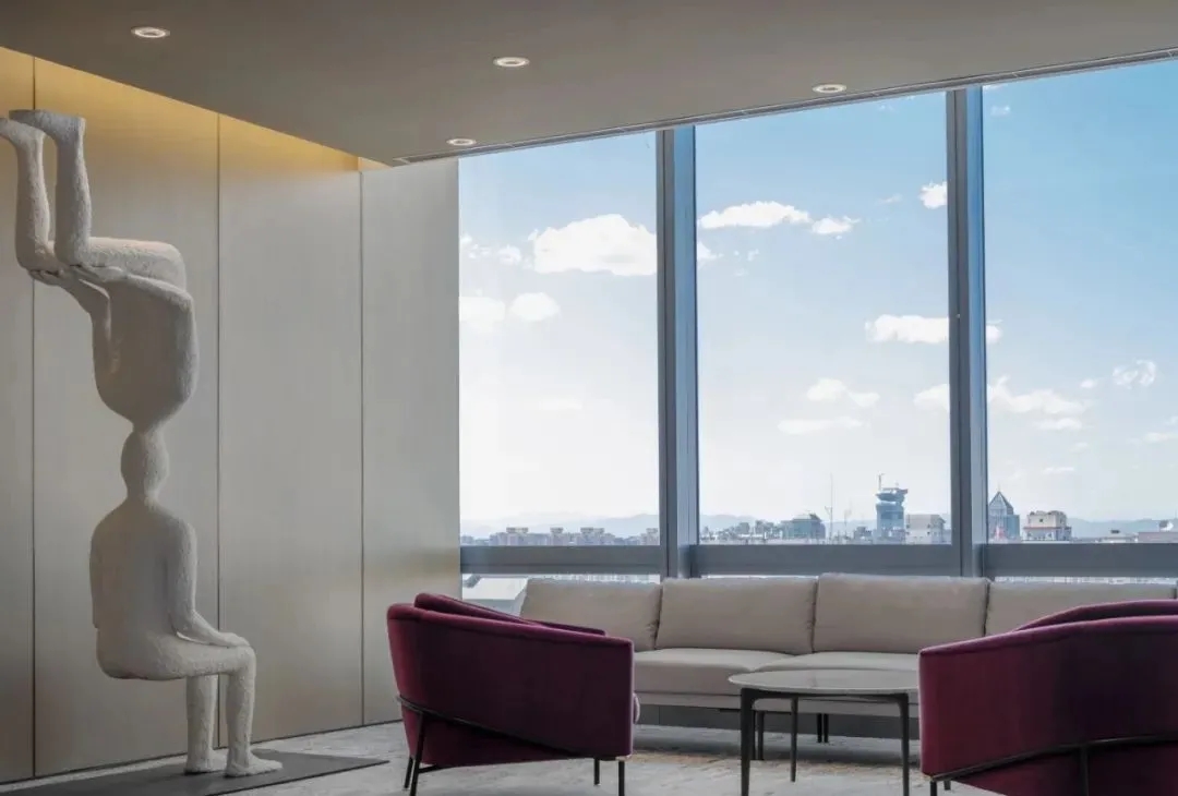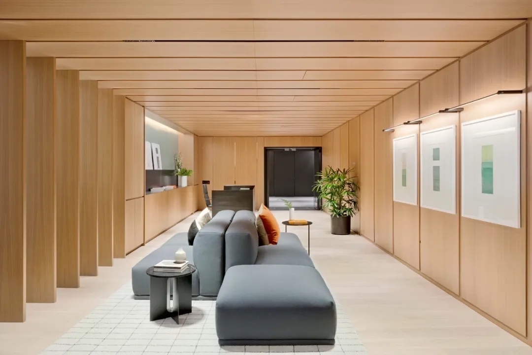 会议室高品质的家具和饰面,中间分开的天花设计细节,与空间中的其他艺术品相互呼应。颇具建筑感的接待台细节,体现在大理石和木饰面板的层次及体量感中。