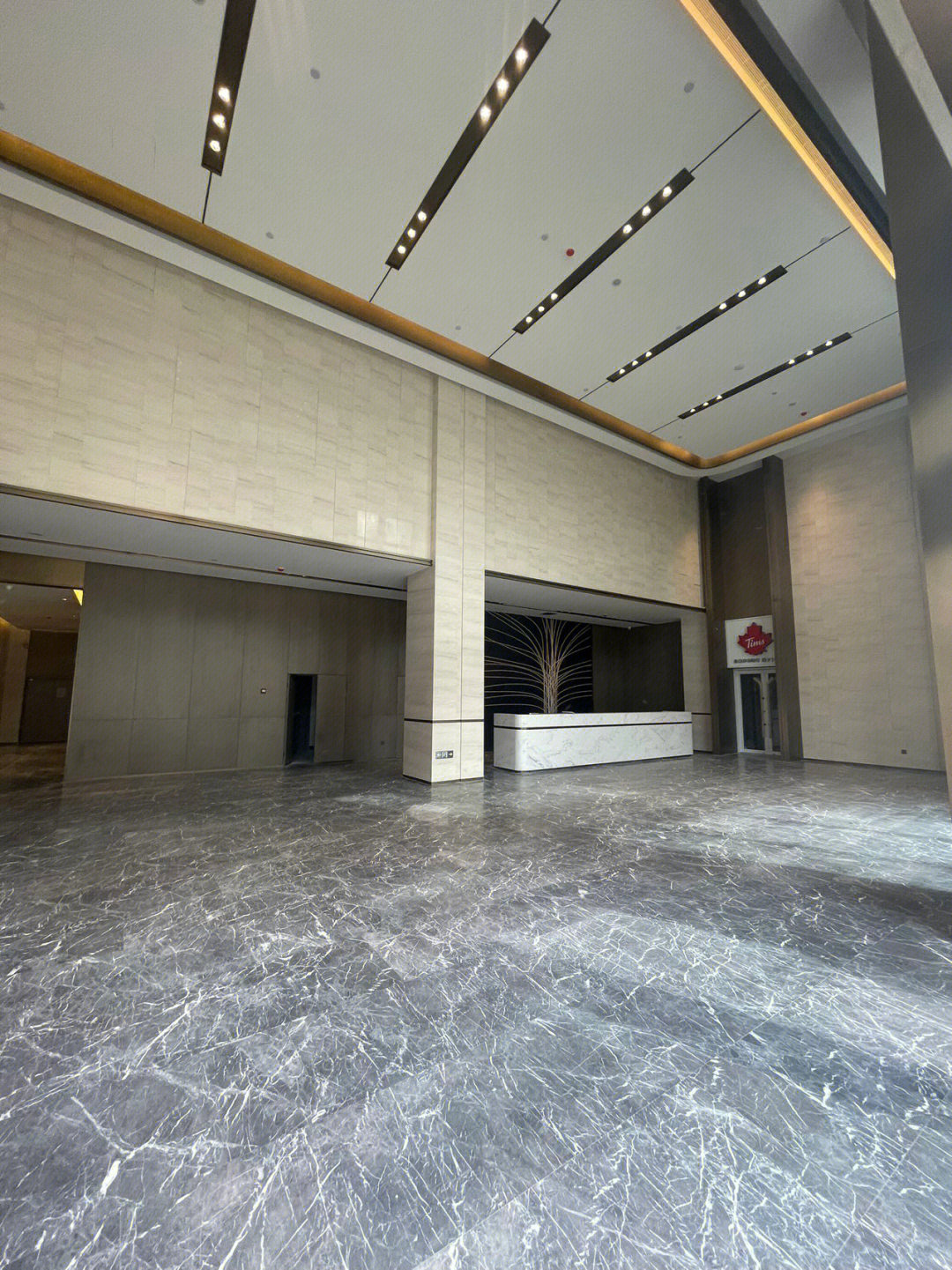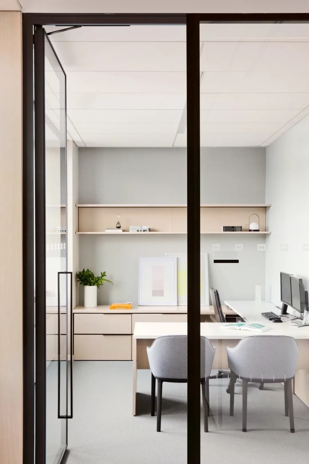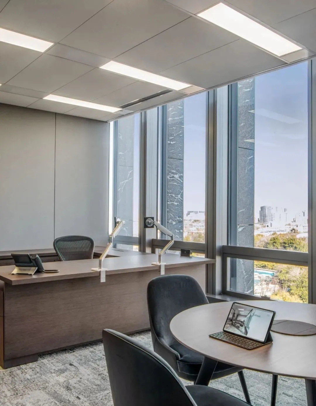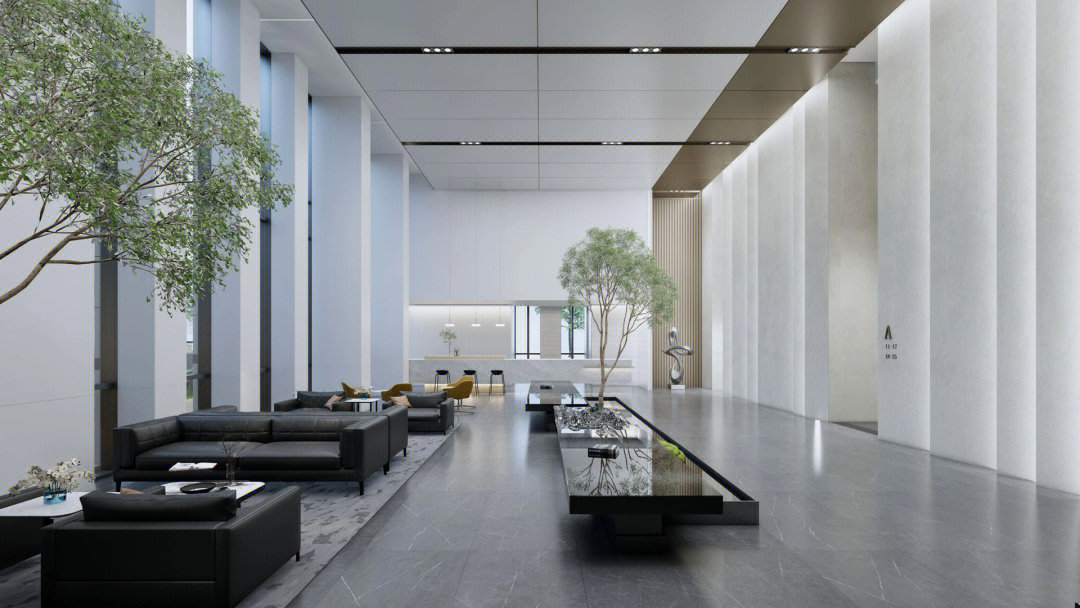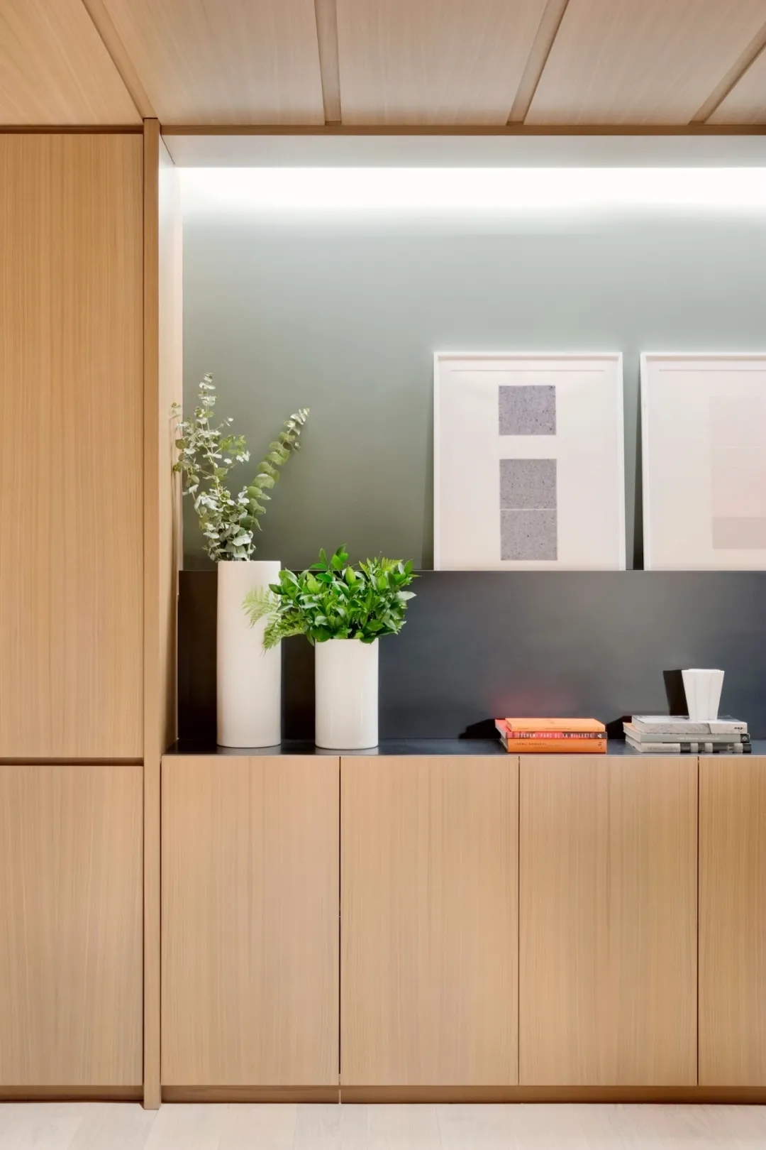 会议室高品质的家具和饰面,中间分开的天花设计细节,与空间中的其他艺术品相互呼应。颇具建筑感的接待台细节,体现在大理石和木饰面板的层次及体量感中。