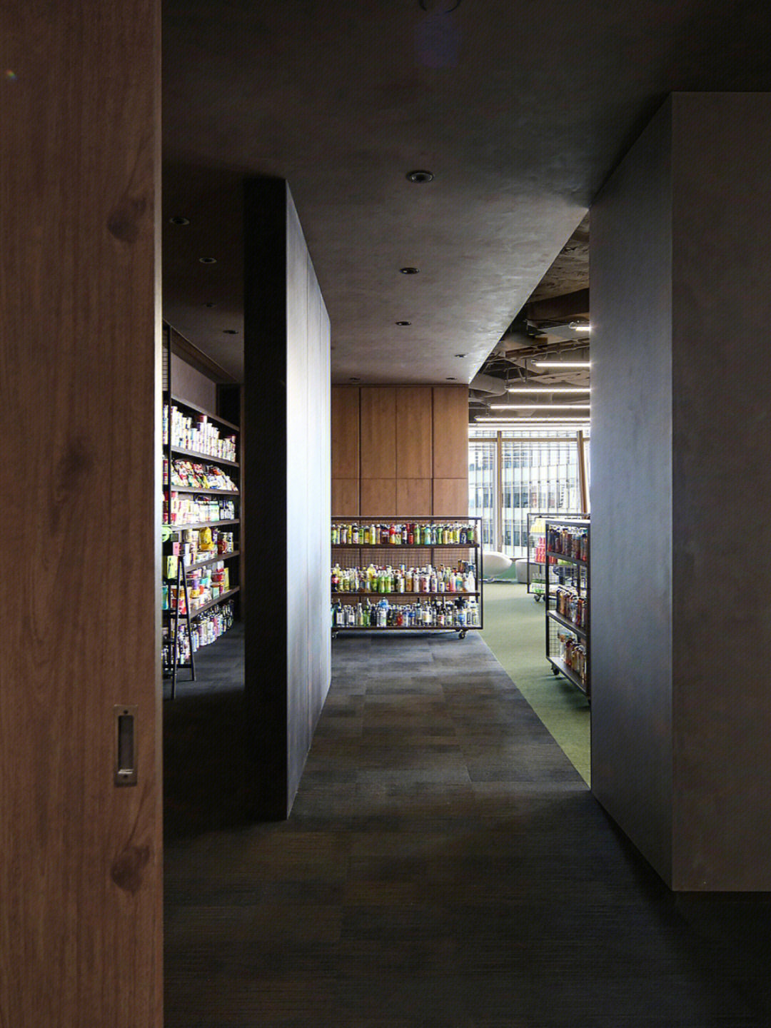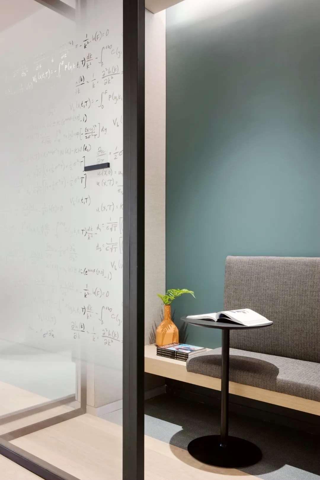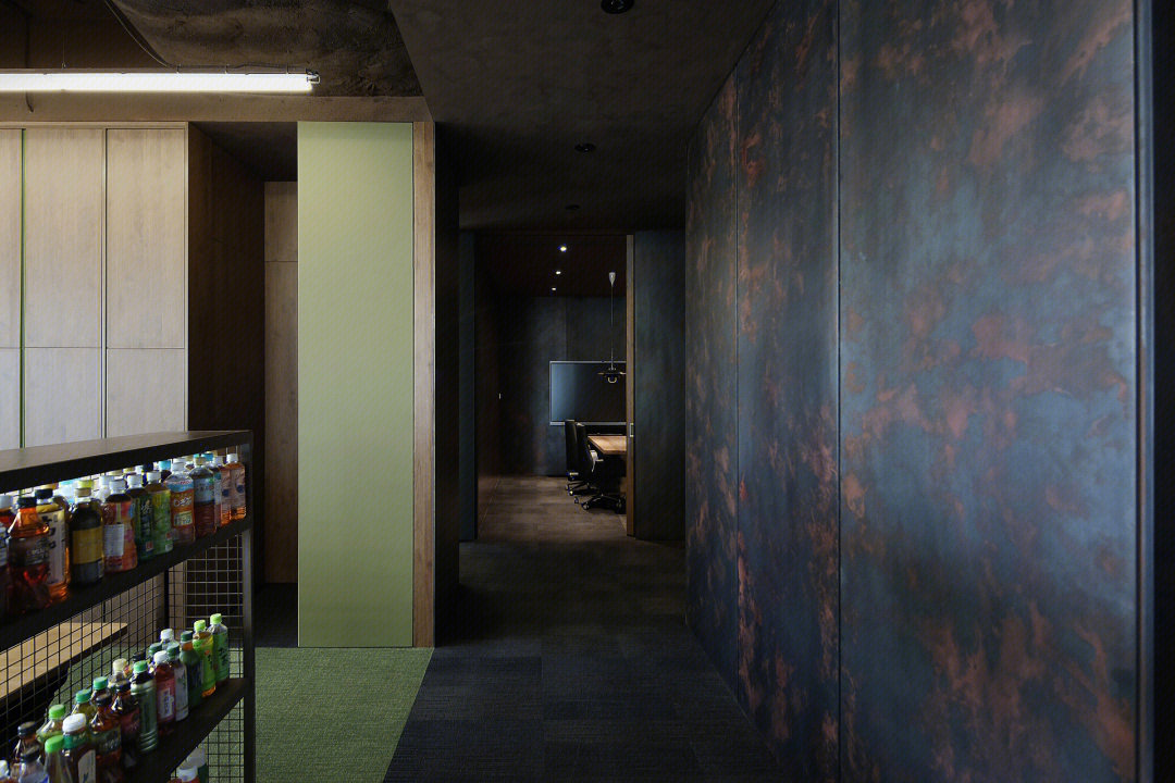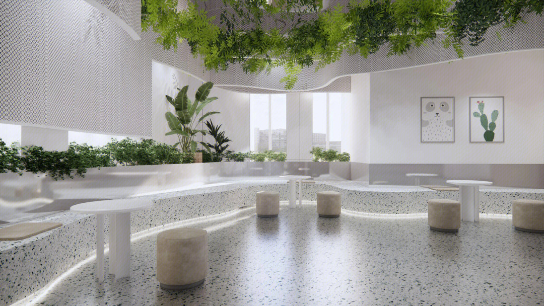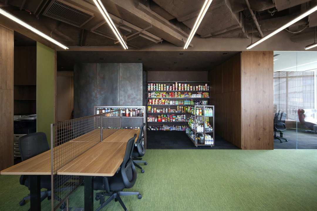 围绕着那根唯一的立柱形成工作区的绿植景观带,形成员工闲聊、独立工作或休息的座位带。