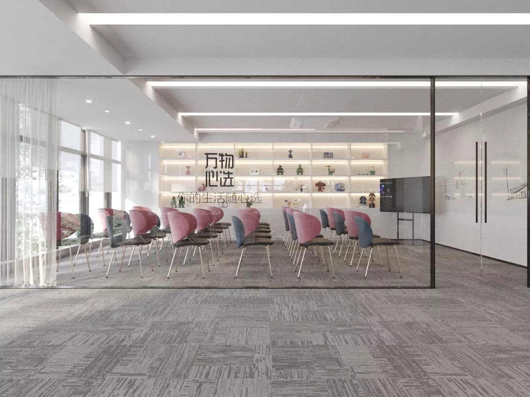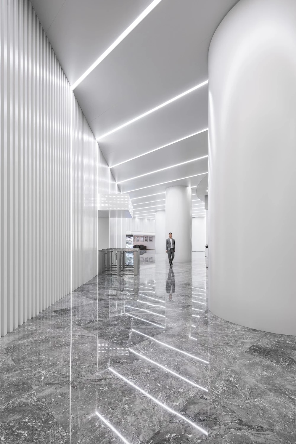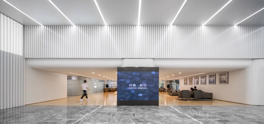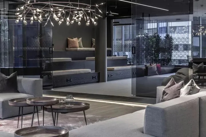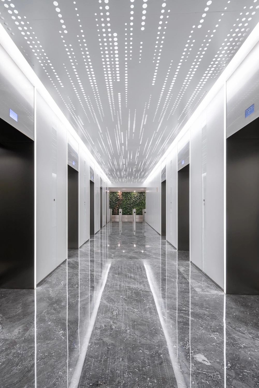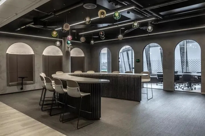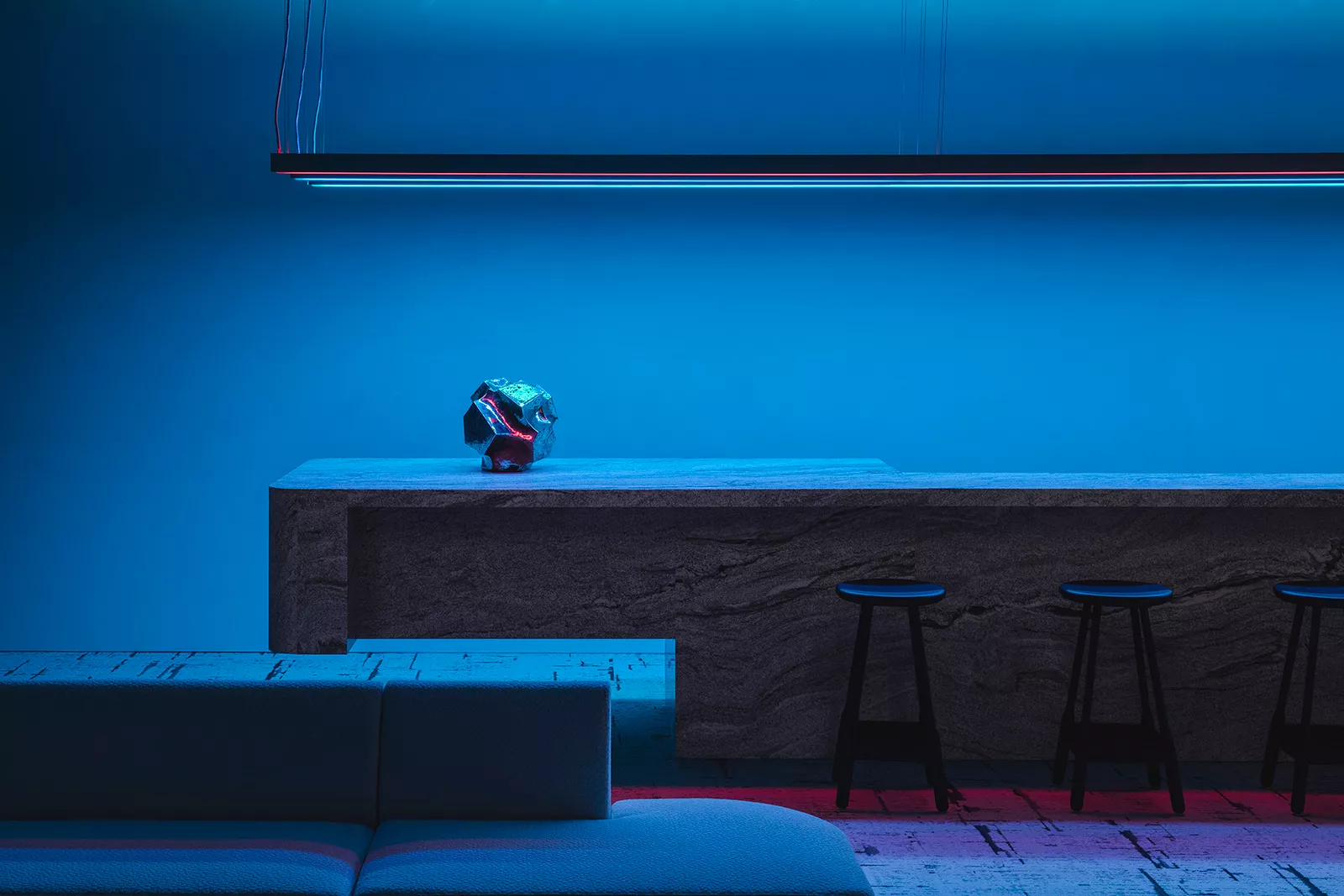 精心构思的休息区成为了空间的焦点,红、绿、蓝三条彩色光带将整个区域巧妙地融合、交织在一起,渲染了一场关于光、影、色彩的梦幻情境,给人留下了深刻的、生动的记忆。