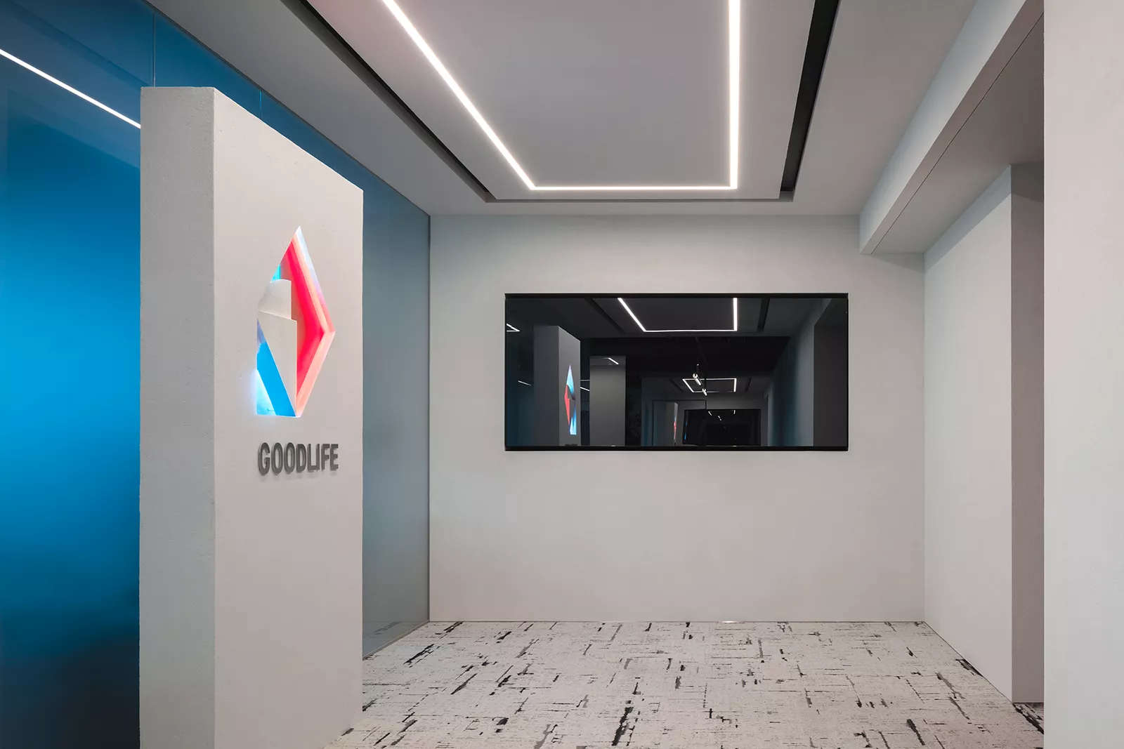 Goodlife办公室的设计是一种新的办公风格,由光、颜色和材料之间的关系共同建立起来。办公室的入口处是一个有着Goodlife标志性的雕塑作品,采用红色、蓝色和绿色的灯光来塑造空间。