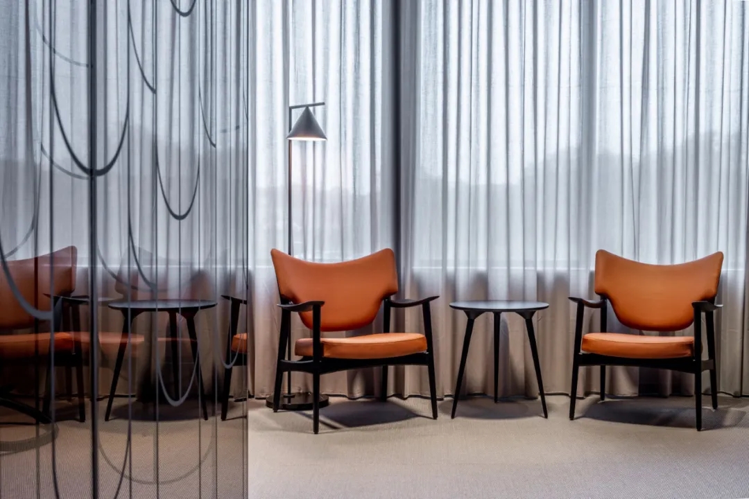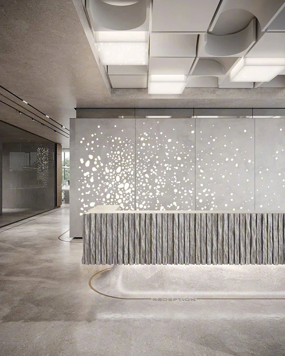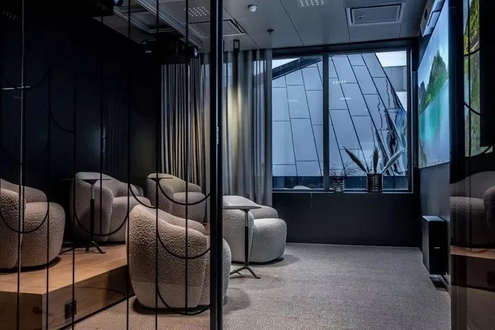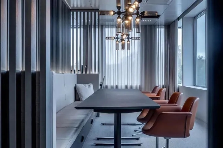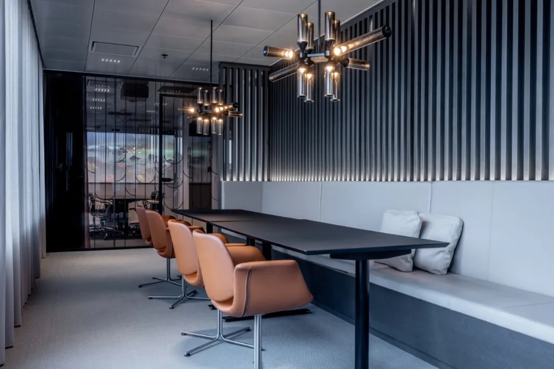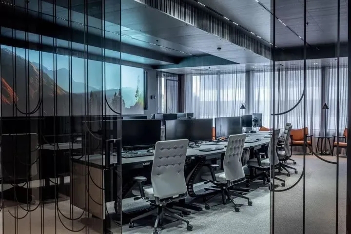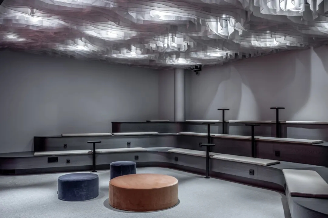设计师从油藏中发现的含油砂层形态为灵感设计而来的。柔软的织物模仿砂岩地层形态,轻盈垂下,同地面所铺设的,同样有着织物感的Bolon编织地板遥相呼应,为会议室和休息区营造出一派灵动柔美、温暖惬意的环境氛围。