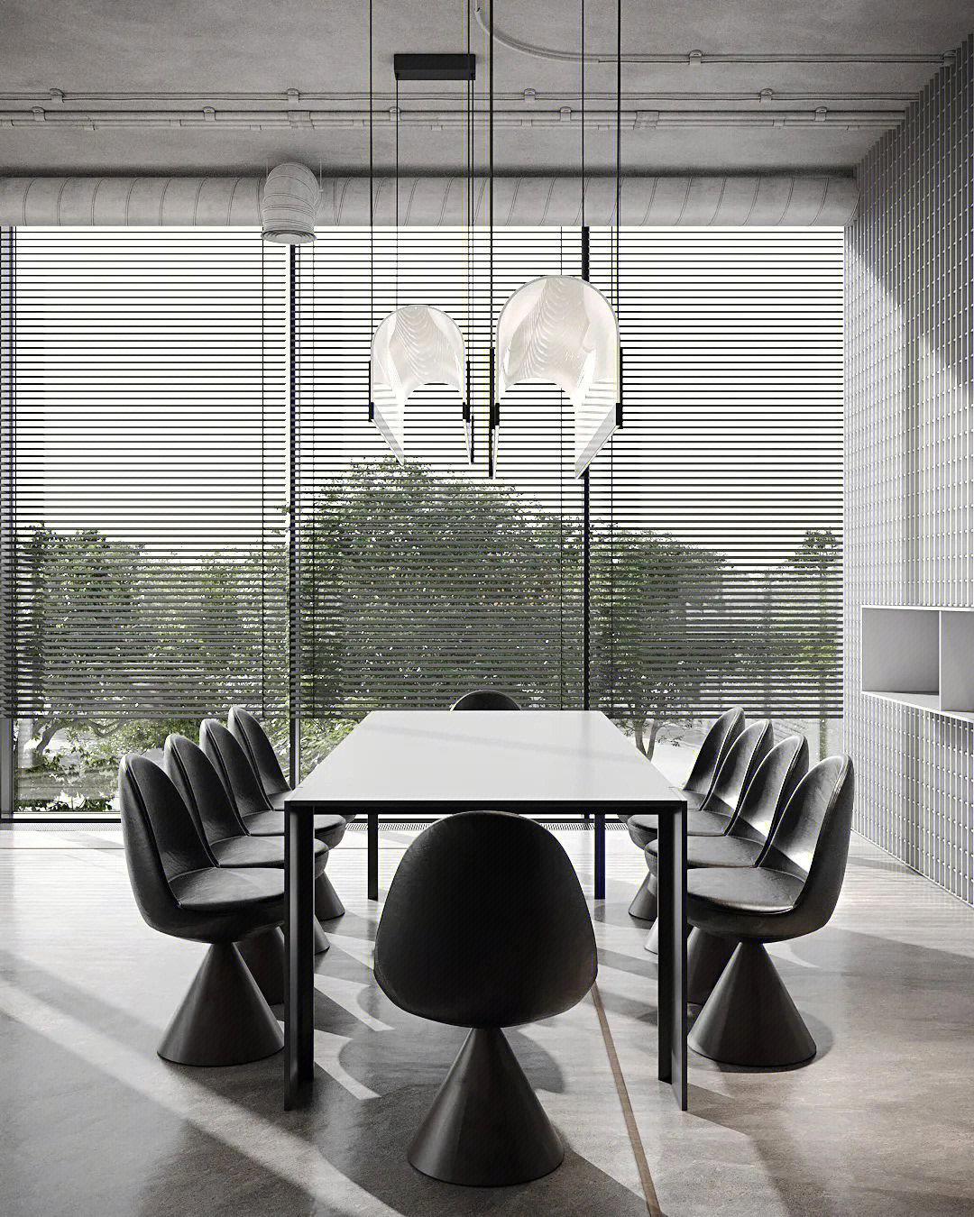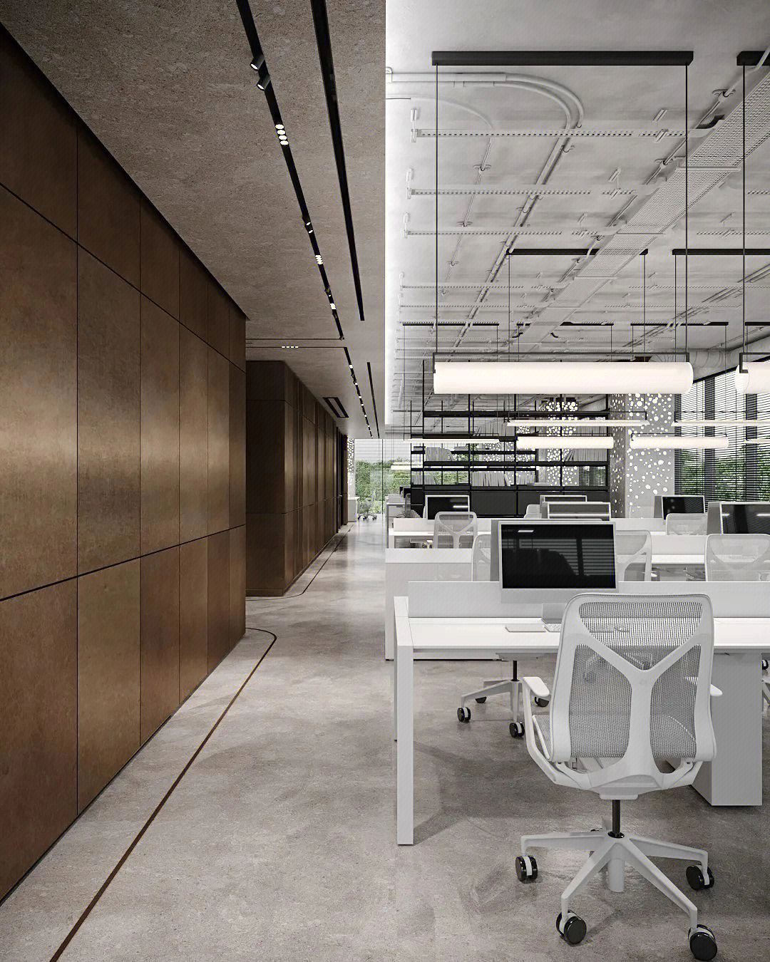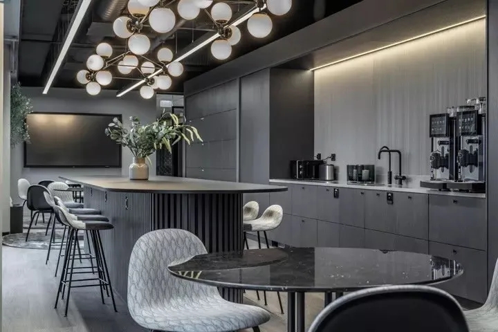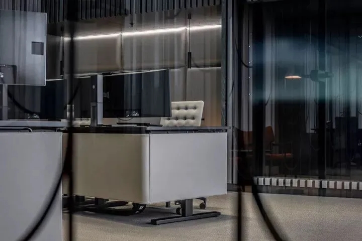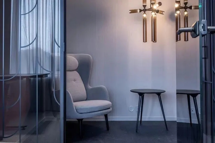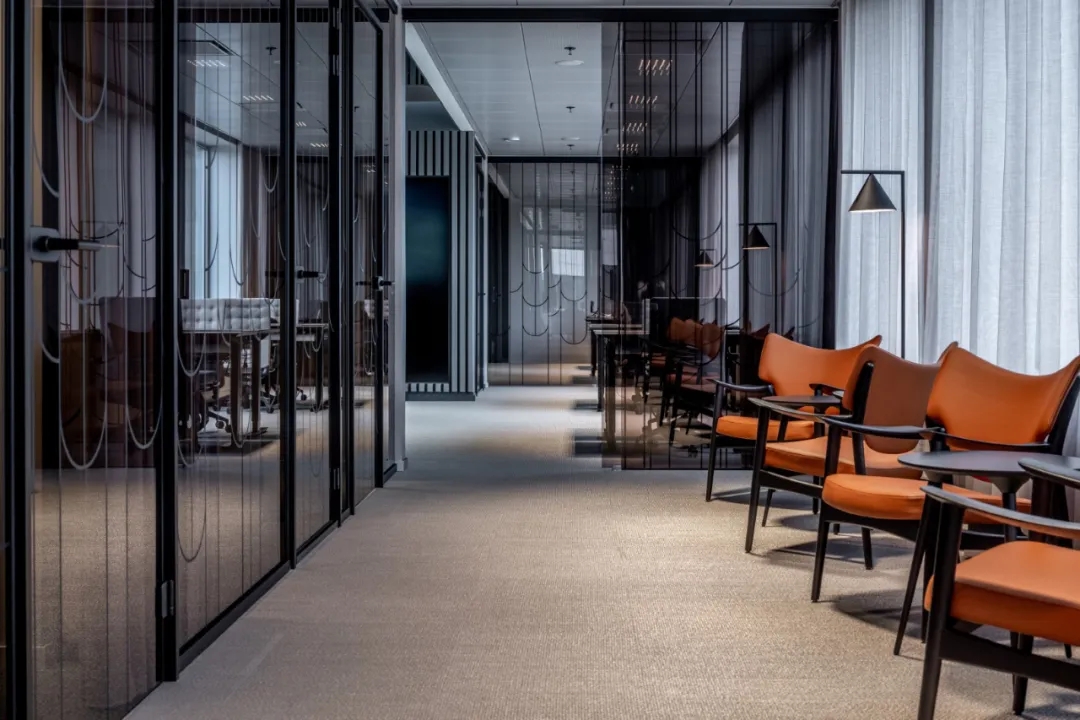 设计师从油藏中发现的含油砂层形态为灵感设计而来的。柔软的织物模仿砂岩地层形态,轻盈垂下,同地面所铺设的,同样有着织物感的Bolon编织地板遥相呼应,为会议室和休息区营造出一派灵动柔美、温暖惬意的环境氛围。