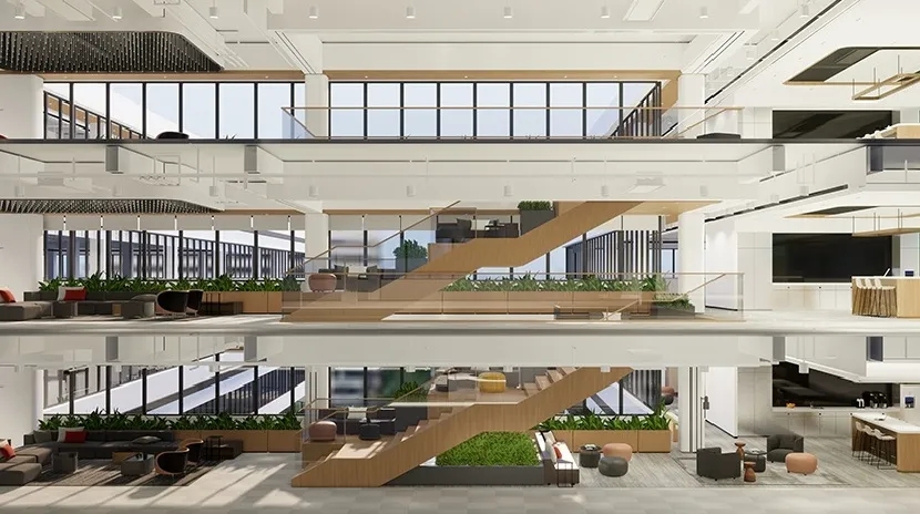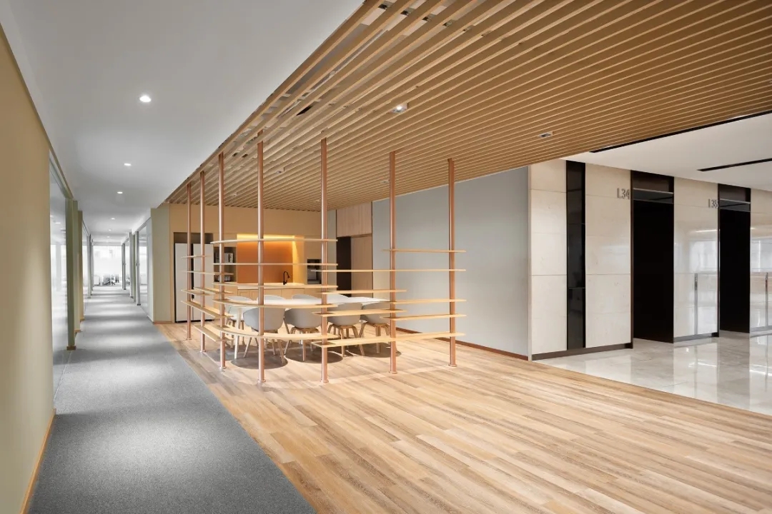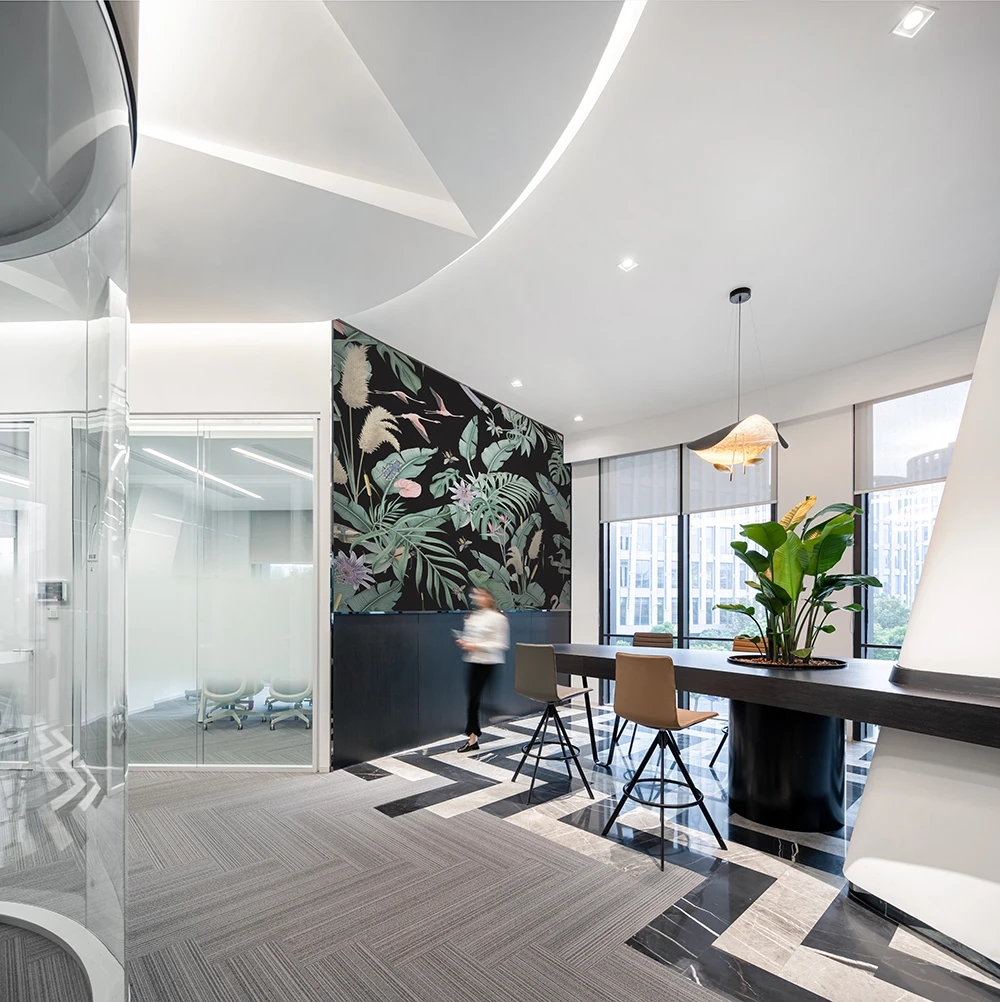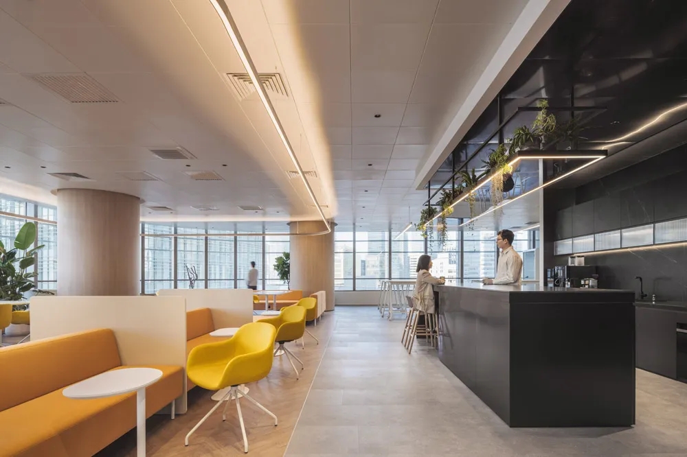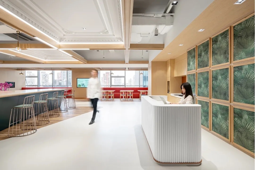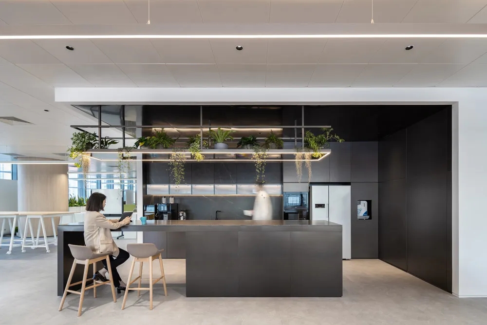入口前厅是人们对空间感知的第一印象。在这里,FTA引入“办公厨房”概念,将传统接待台升级为一个强连接的社交中心,把现代人追求自由、灵活多变的工作方式与社群归属感融于一身。