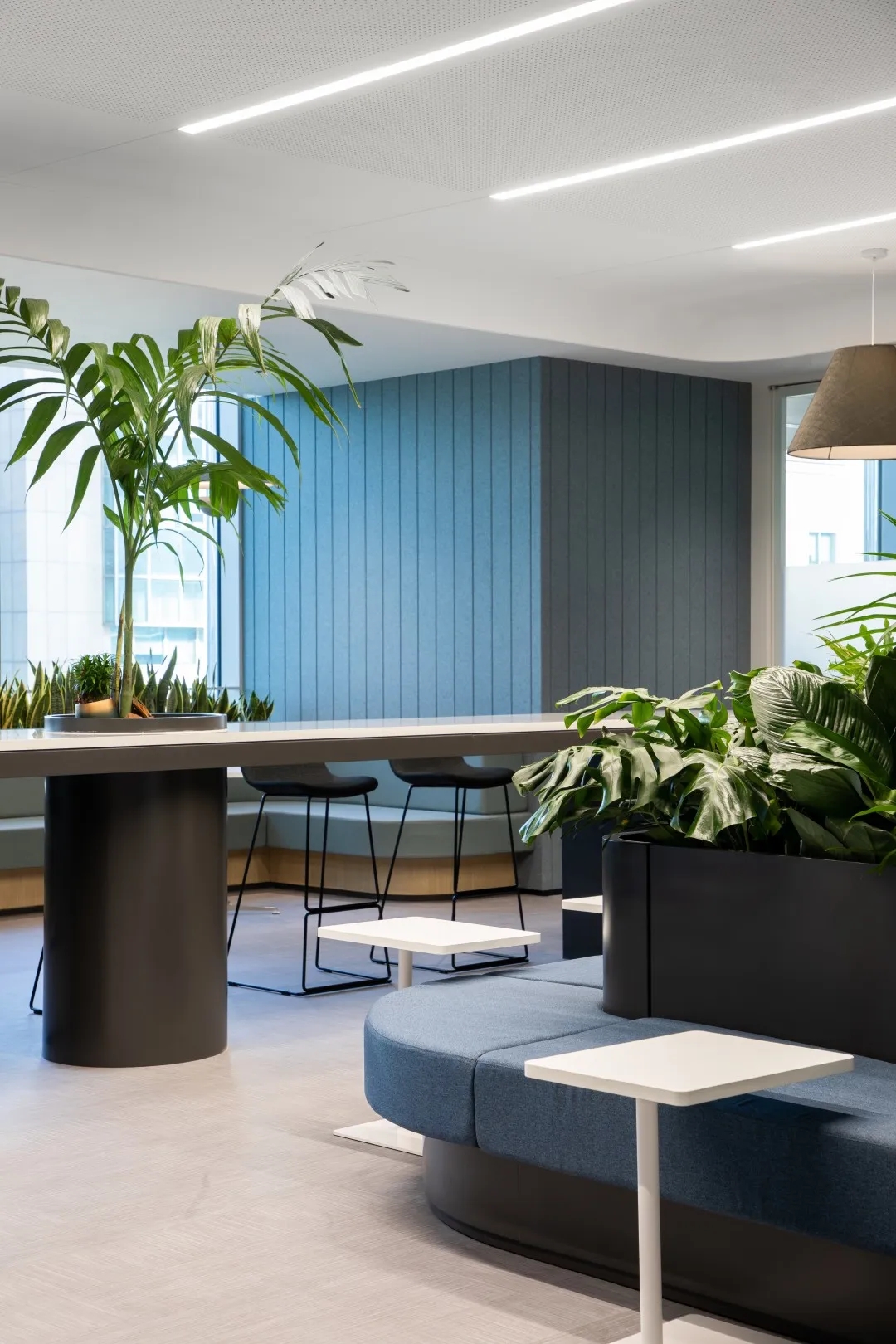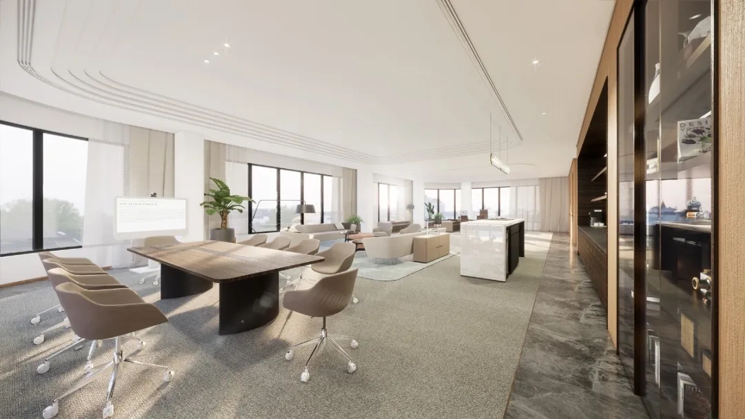 以吧台为圆心,品牌历史墙、产品展示体验区,以及移动办公和洽谈区在不同的维度上依次排开,在绿植的掩映下,品质与舒适一体,秩序与温度并存。纯粹自然的环境氛围,让人在一呼一吸之中静觉空间的美好。