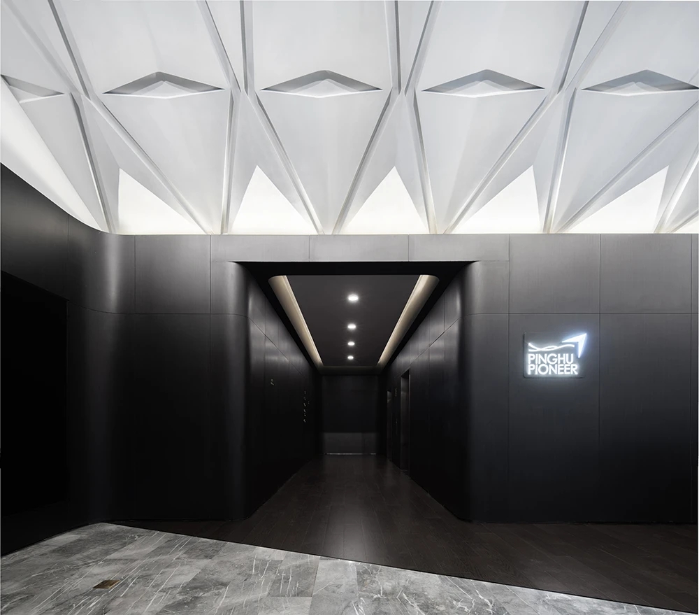 将一层大堂顶部设计成“花托”,与建筑的“花瓣”元素形成呼应,整体视觉上更具统一性。色调上FTA则配以经典的黑白配色,既不会对大胆的外形喧宾夺主,又能体现大胆前卫的现代风格。