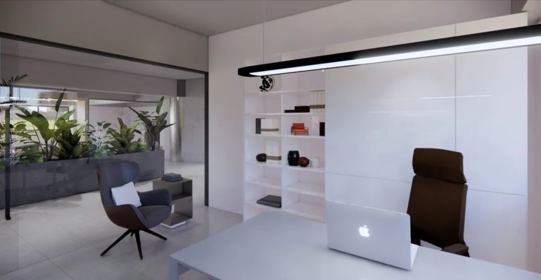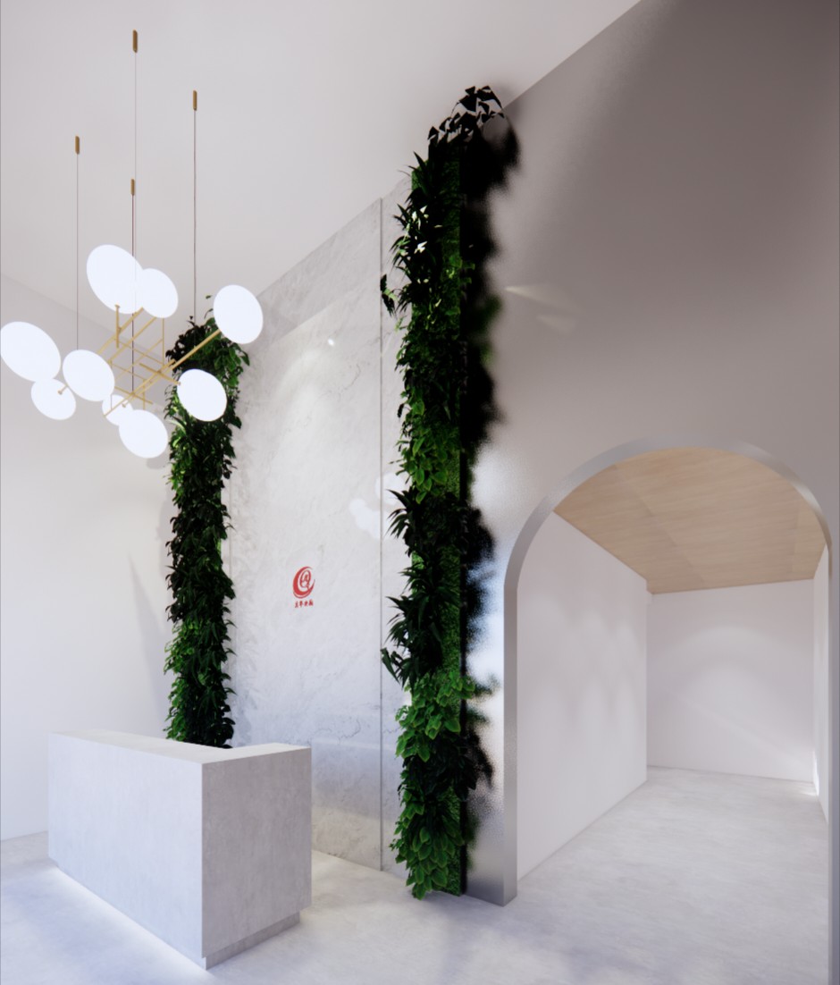 天花板的组合点光以及艺术性发光面打亮了大理石墙壁,赋予了空间灵动性,由上至下,贯穿始终。绿化带的延申加强了大尺度的挑高空间下通透而敞亮的视觉效果。