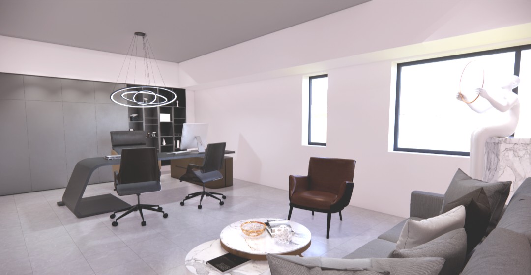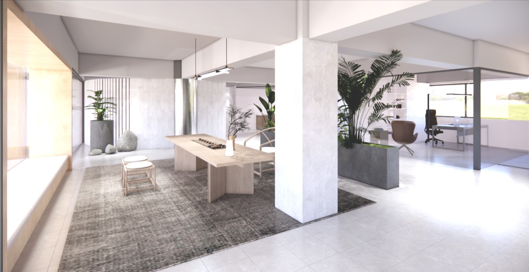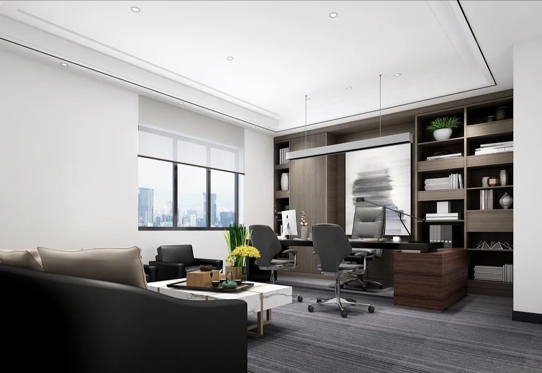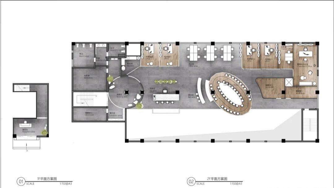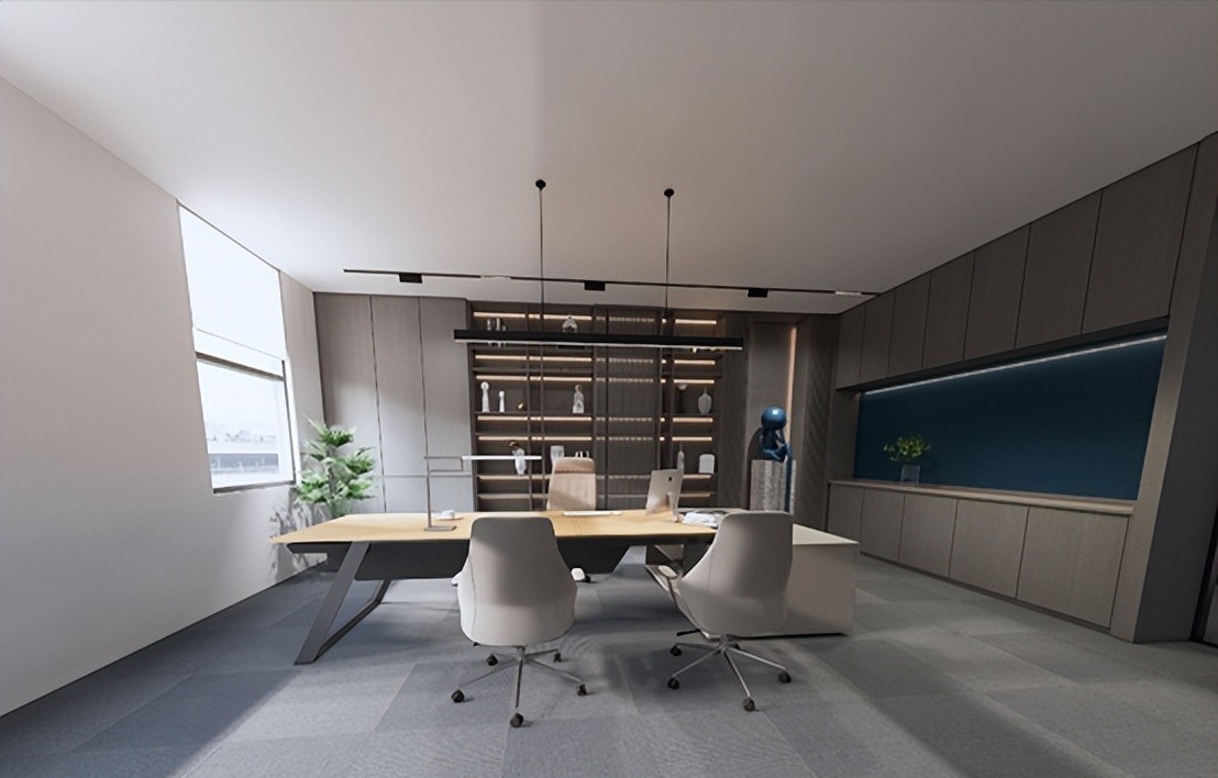 处于不同位置时,可将空间细化为不同的使用场景,充分满足员工需求的同时,形成了几何形极强的趣味构成空间。办公区走道将入口空间和办公空间形成分隔的同时,也形成了动线上的引导,从入口空间可进入会议室与董事长办公室。