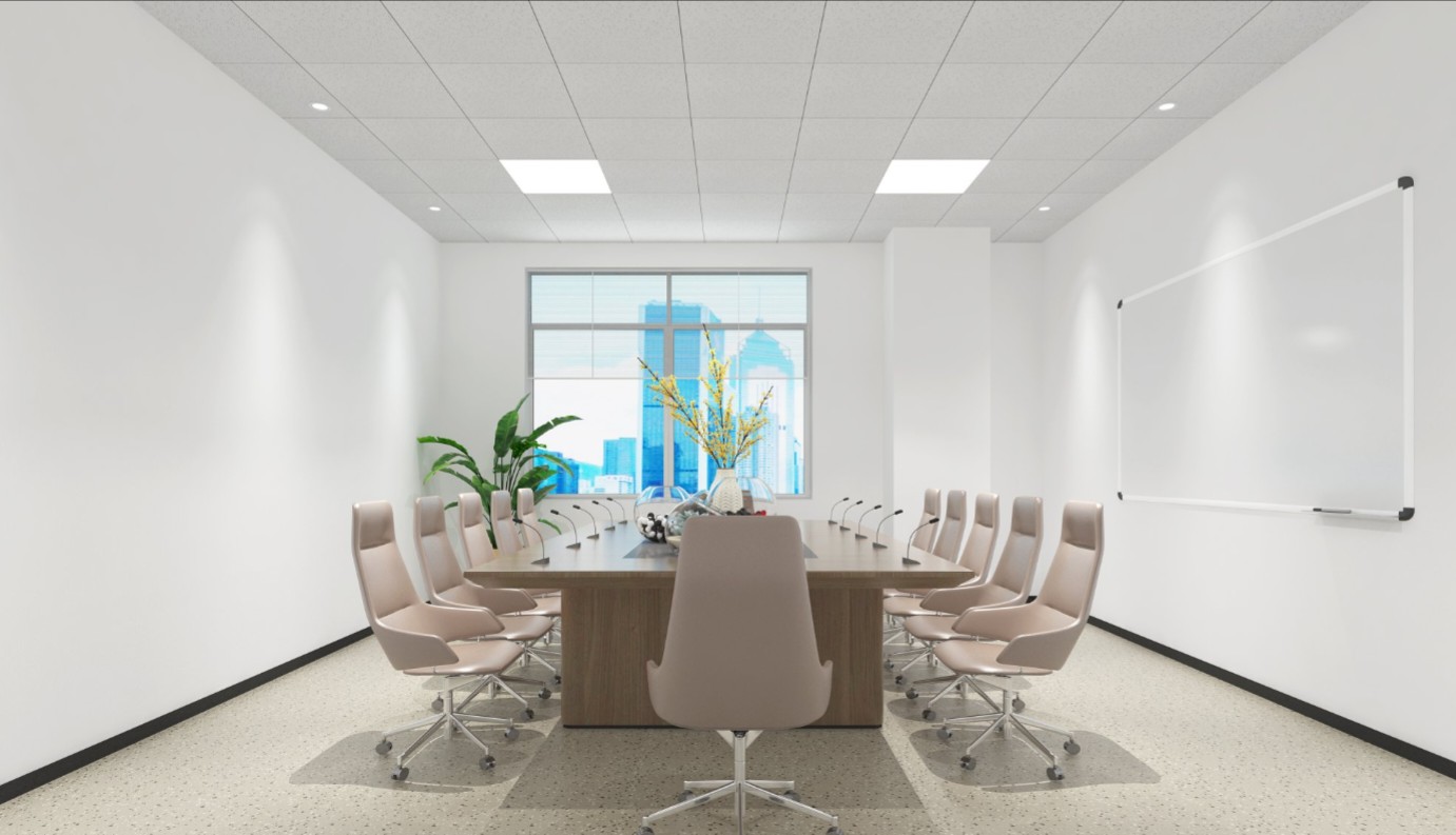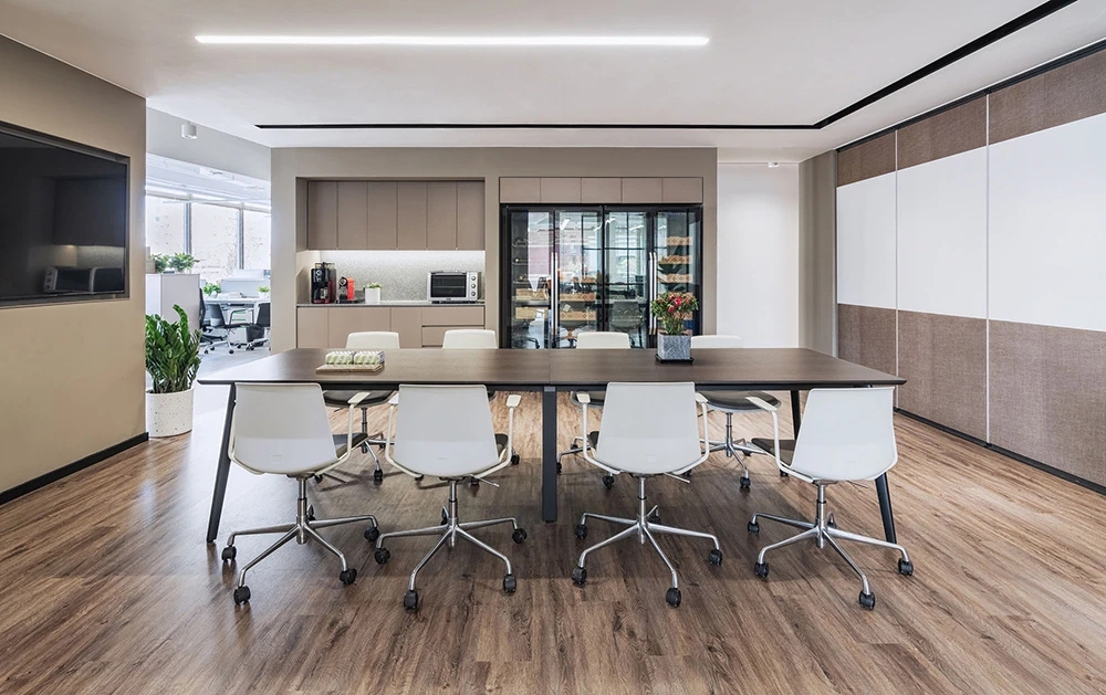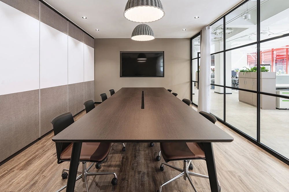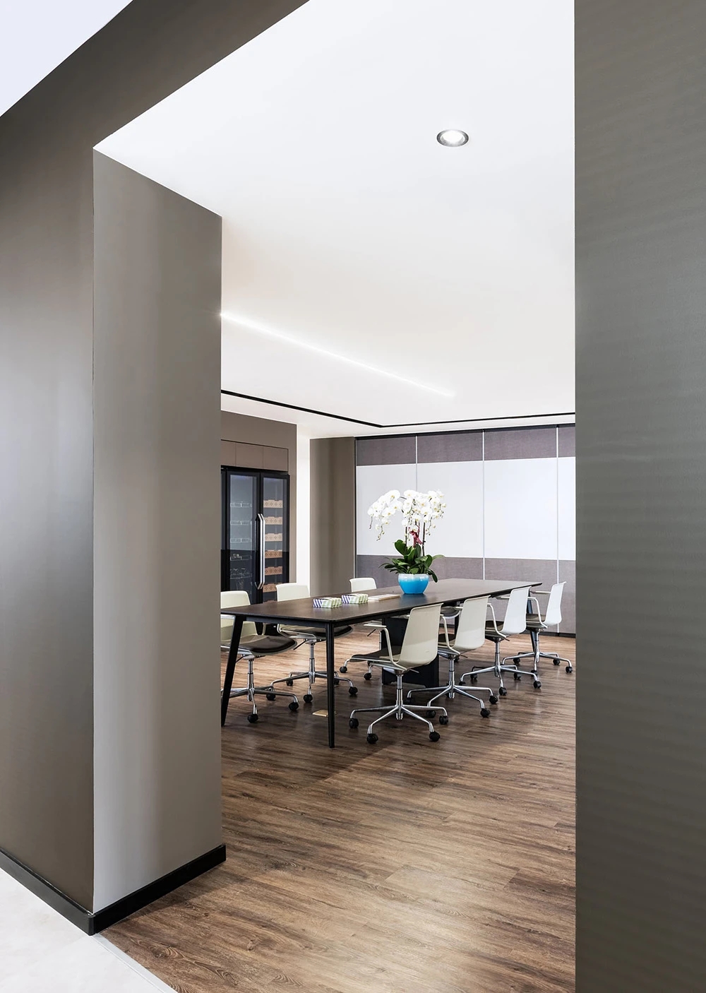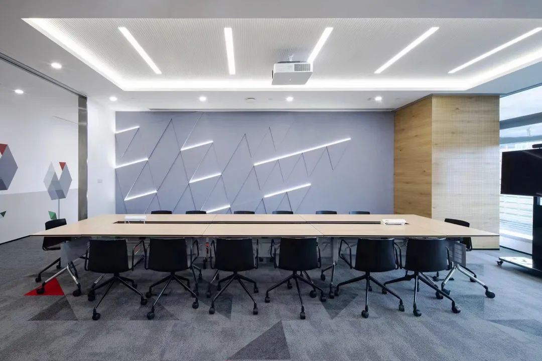 会议室在材质的选用上,力求凸显力量感与天然木材的质感。白色粗线勾边的沉稳与木质的天然肌理的多样化组成了整个会议室,一切都仿佛飘出去一样,自然磅礴,视野开阔,令人印象深刻。