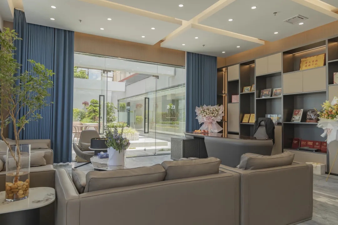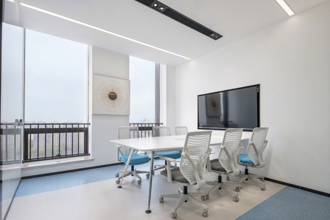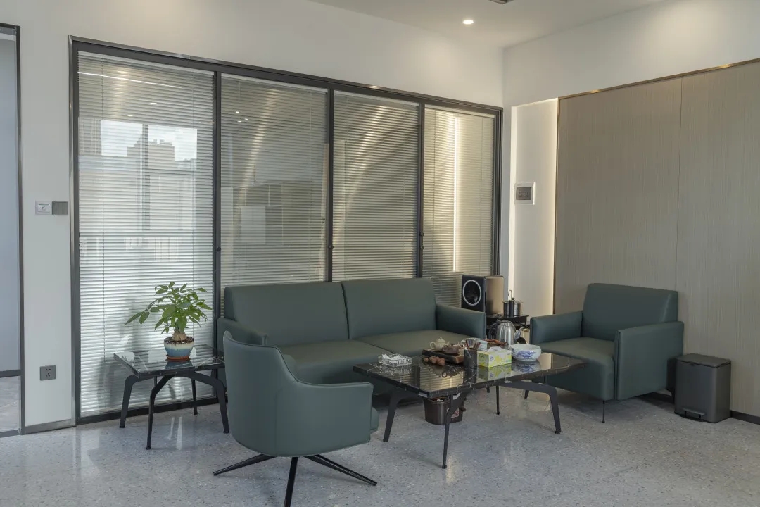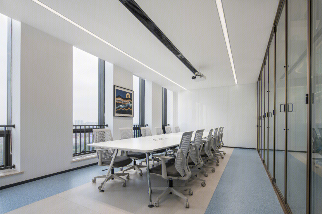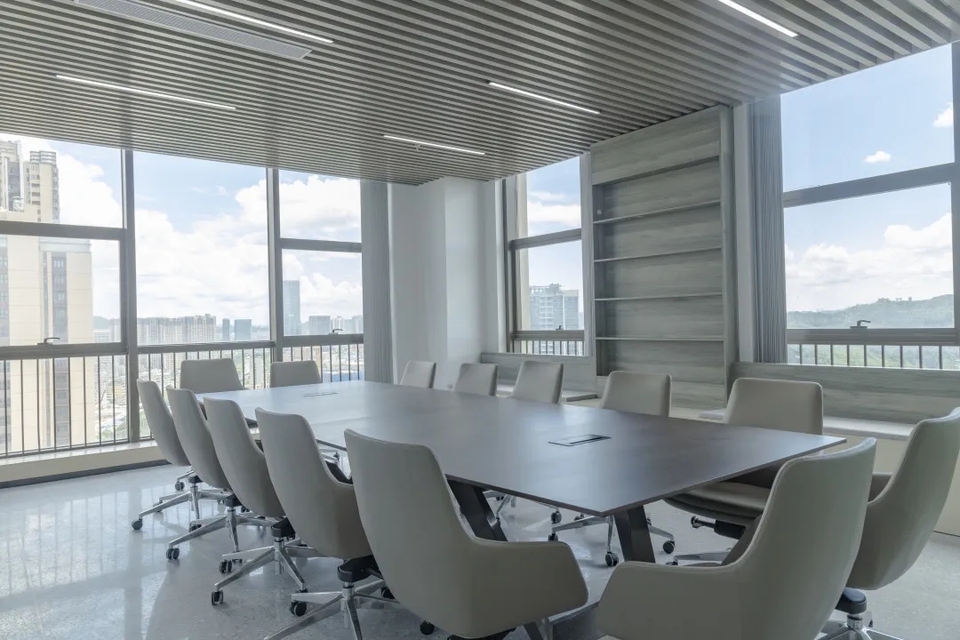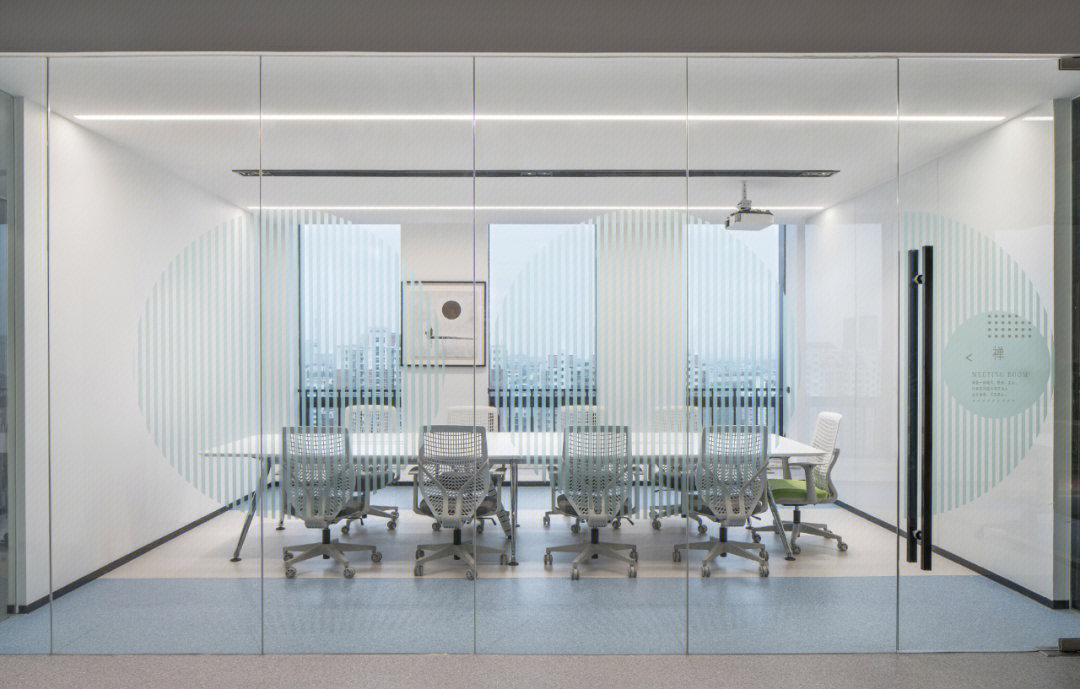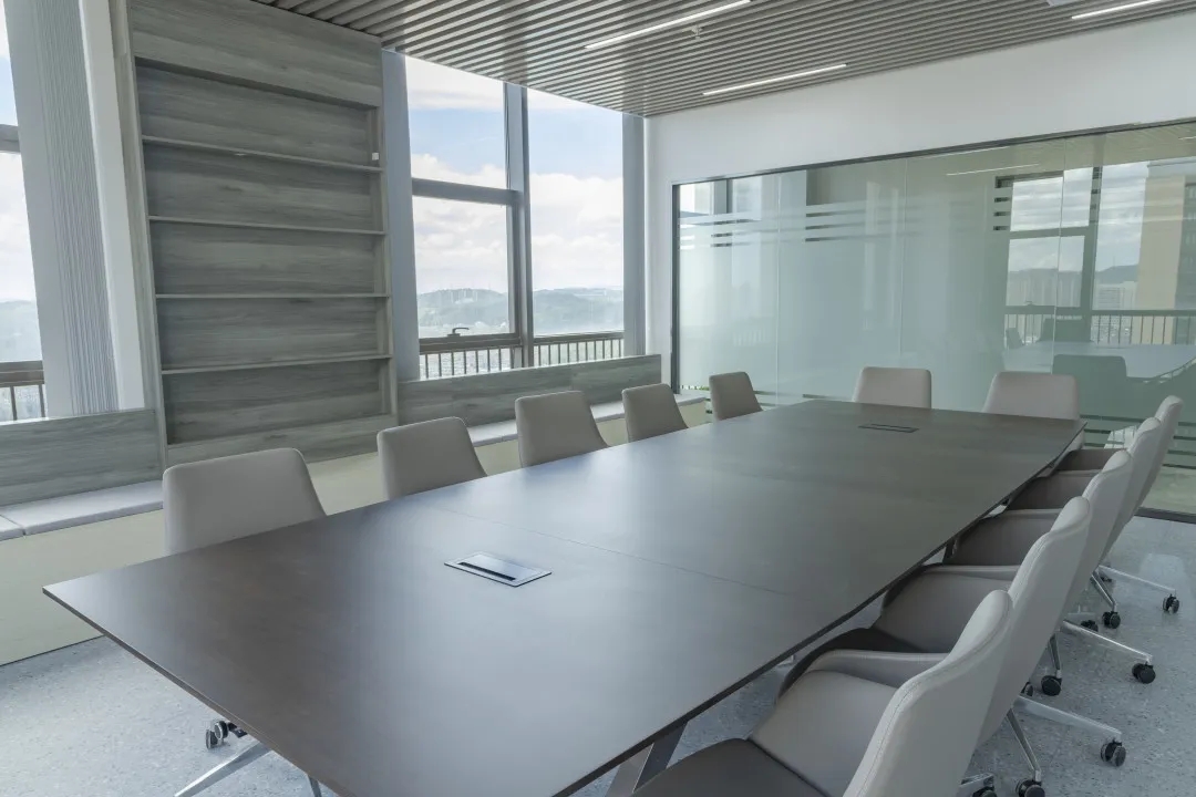 会议室采用全透明玻璃,带来大方、庄重、简洁的观感。会议室背景墙有内嵌的电视机和内嵌展示柜,在展示产品的同时可以增加空间的纵深感。
