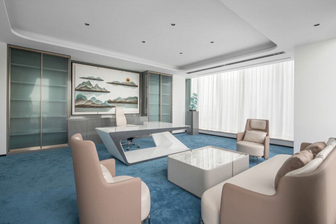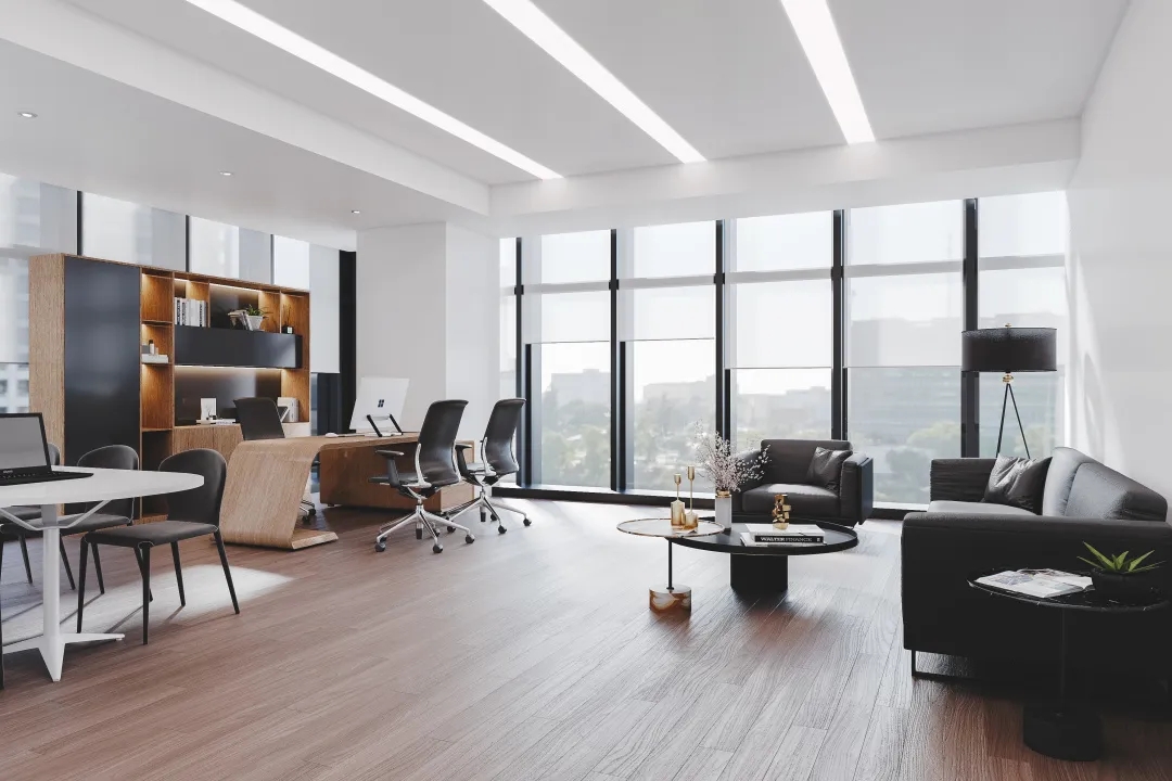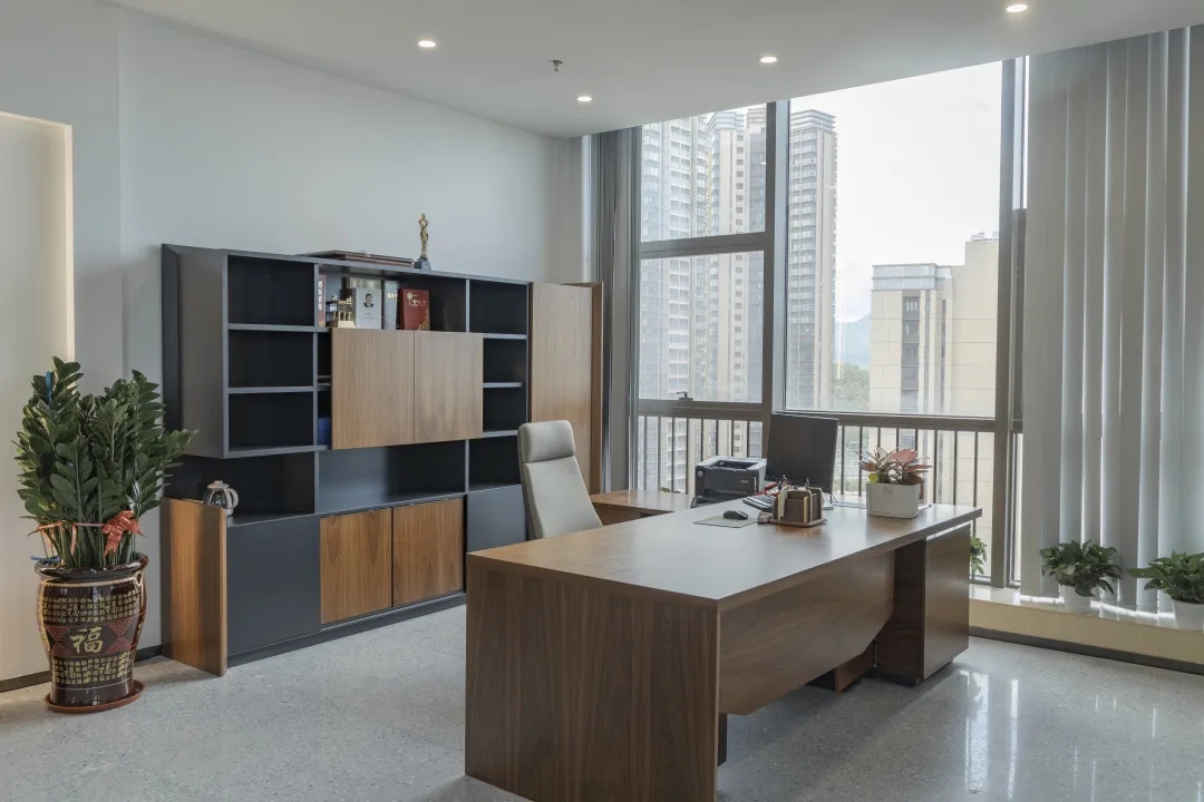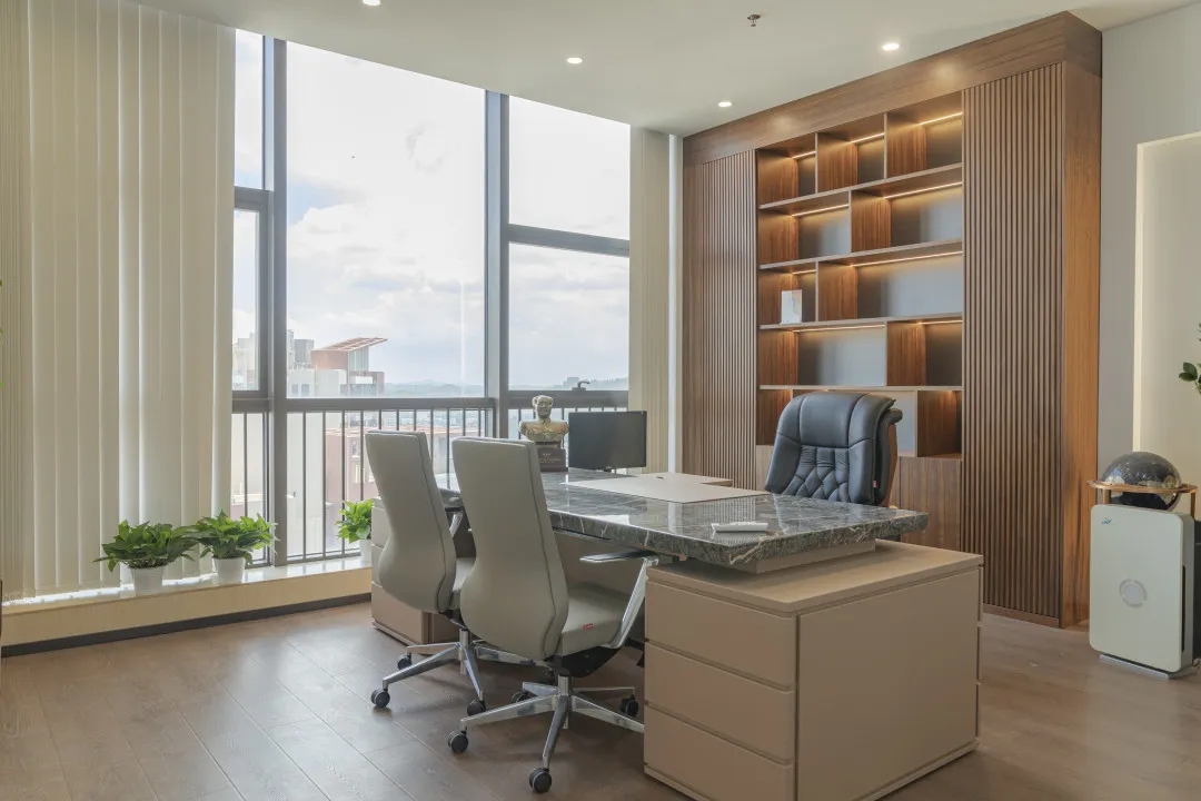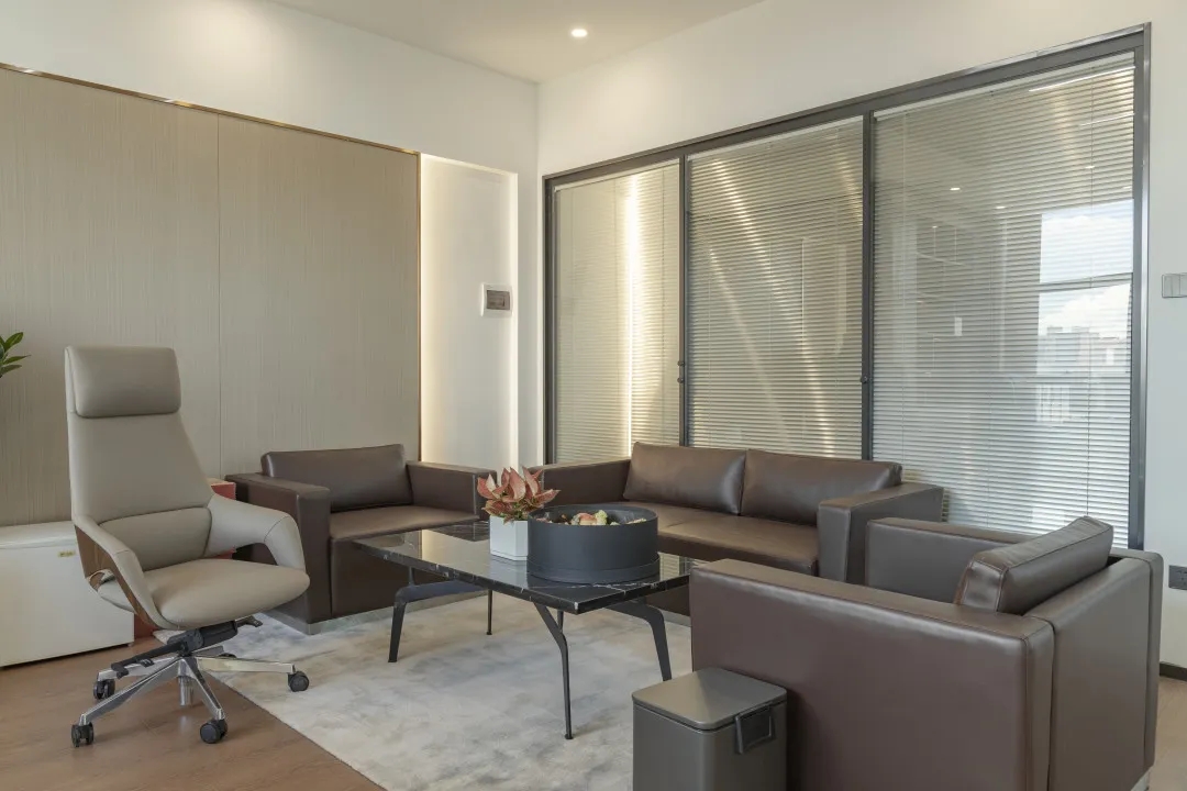 独立办公空间在用色上延续纯白主基调,同时增添了大面积深棕色、原木色,传递出领导者稳健大气的态度。通过减少装饰保持极简风格,以此创造一种舒适高级的品质感。