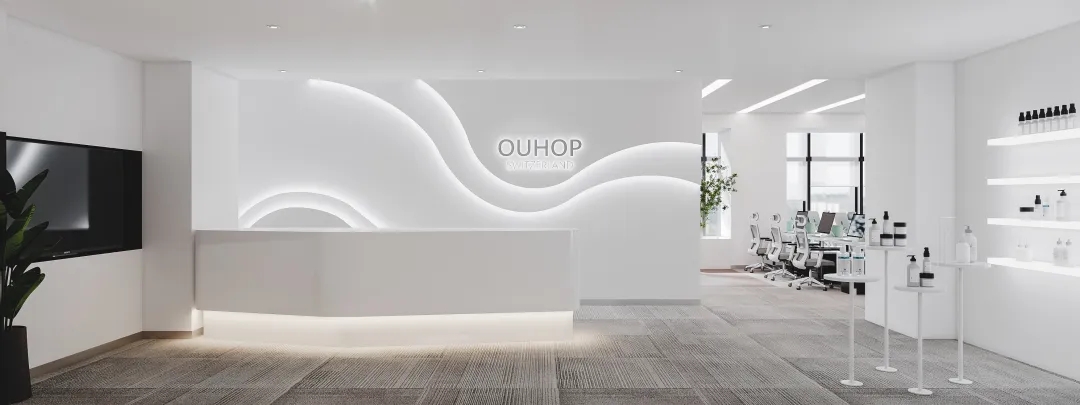 前台选用白色烤漆板,底部内置发光暗藏灯带。背景墙采用曲线进行凹凸分割,营造流动的层次感,内部镶嵌暗藏灯带,更好地勾勒造型。前厅一侧放置展台和发光亚克力面板进行产品展示,突出品牌形象!
