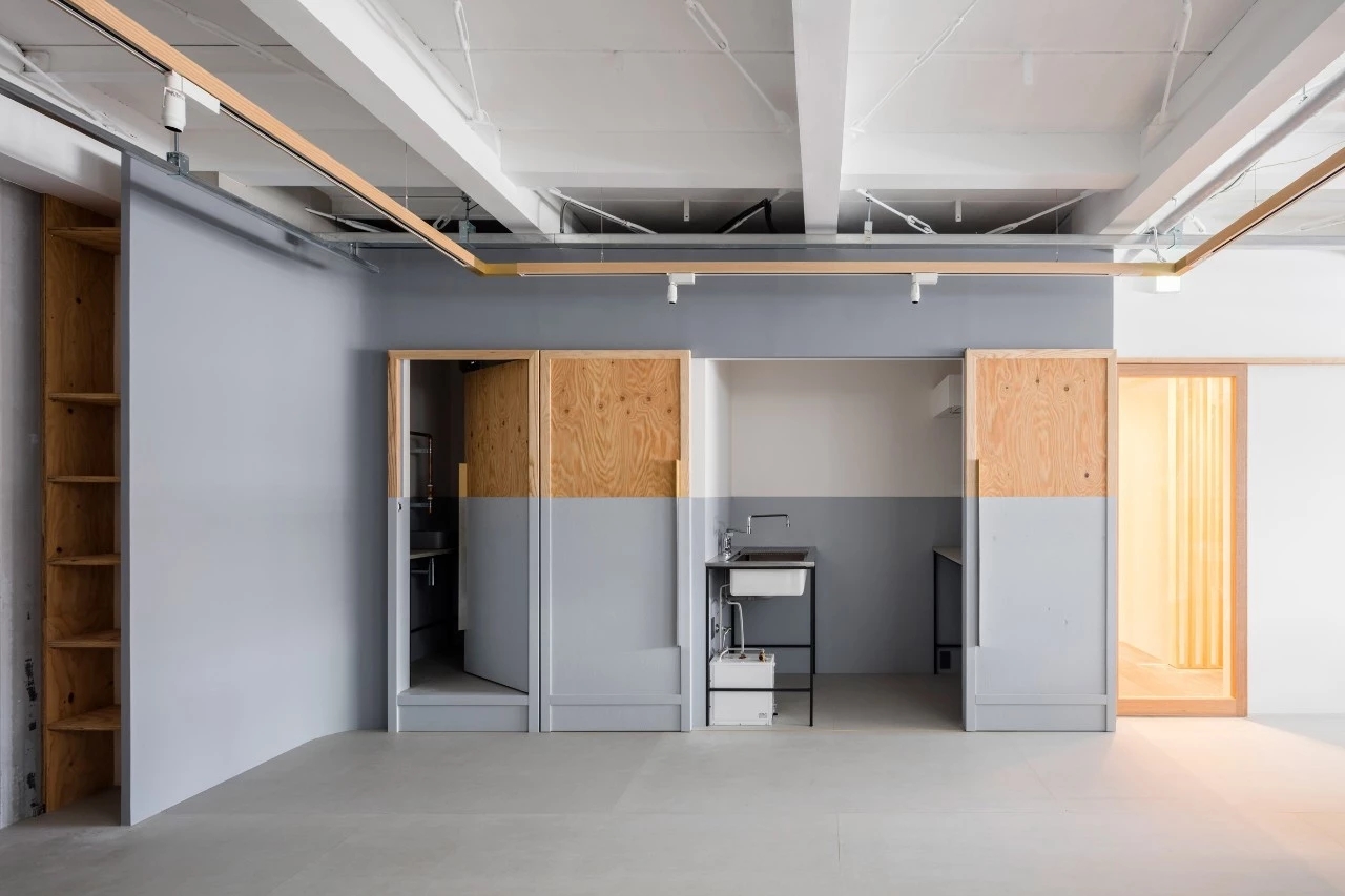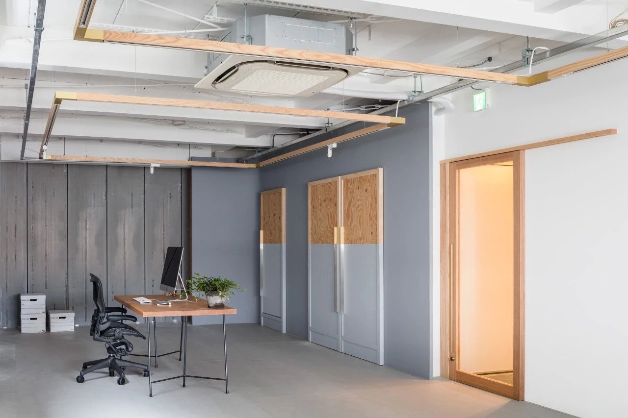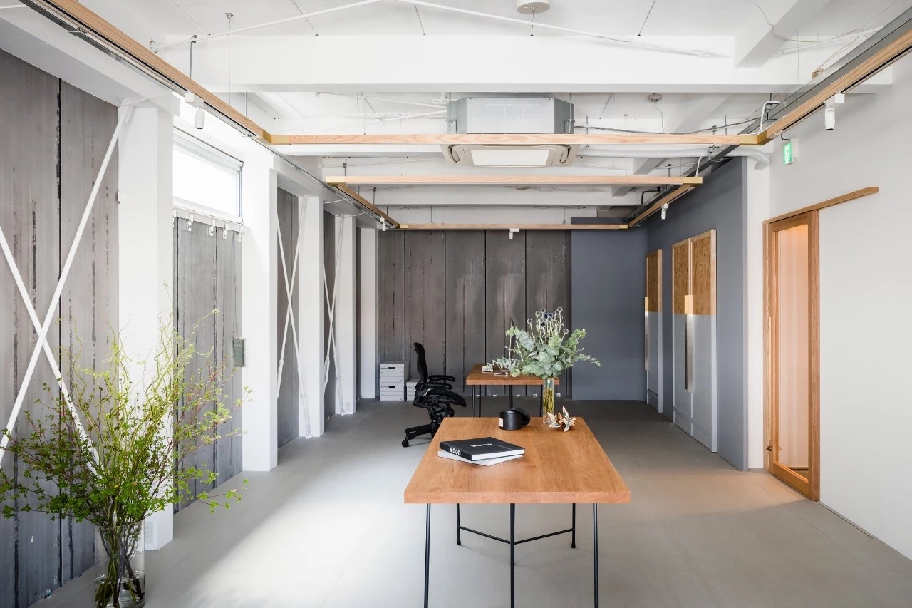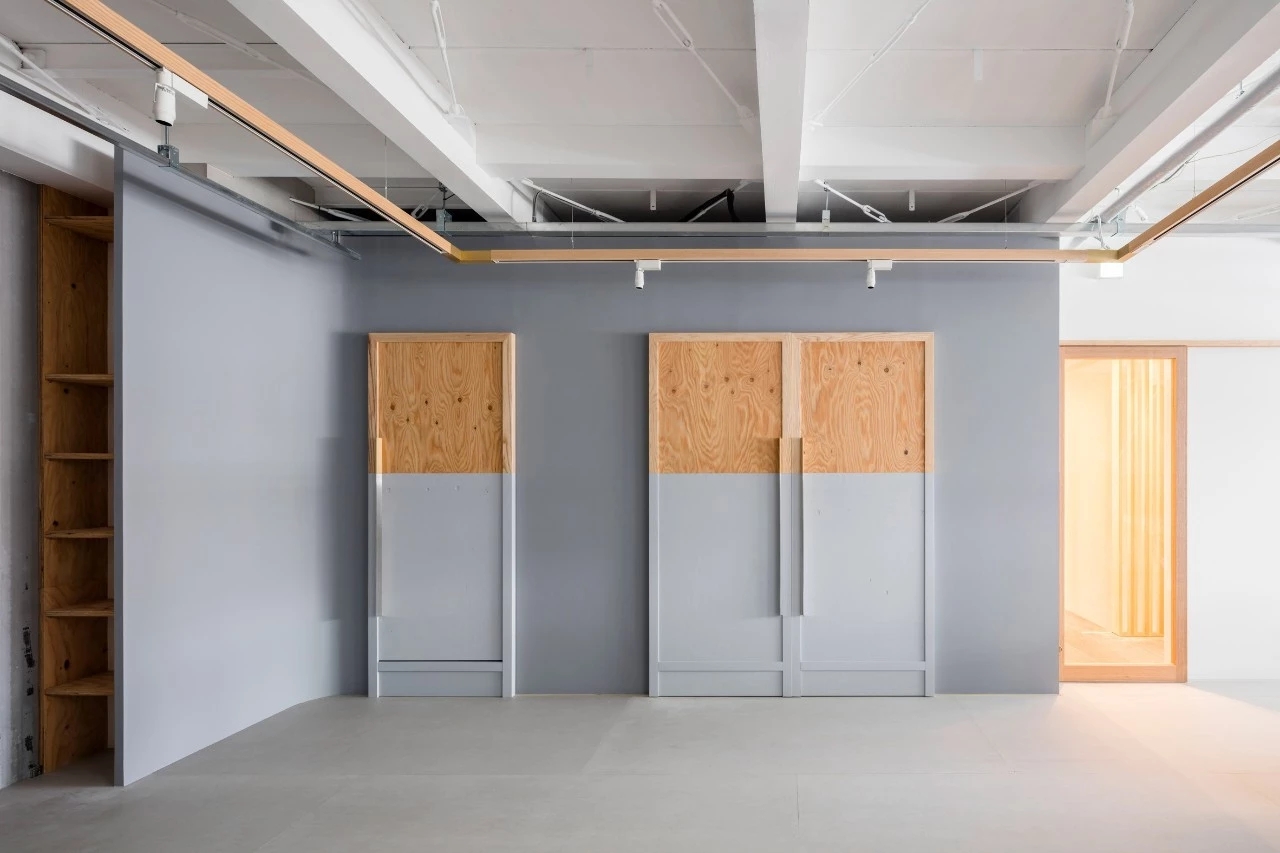 灰色打底的工作室宽敞素雅,木条围绕的天花板凸显简约的工业设计风。粉刷了一半的木门呈现层次感,从而调节室内氛围。