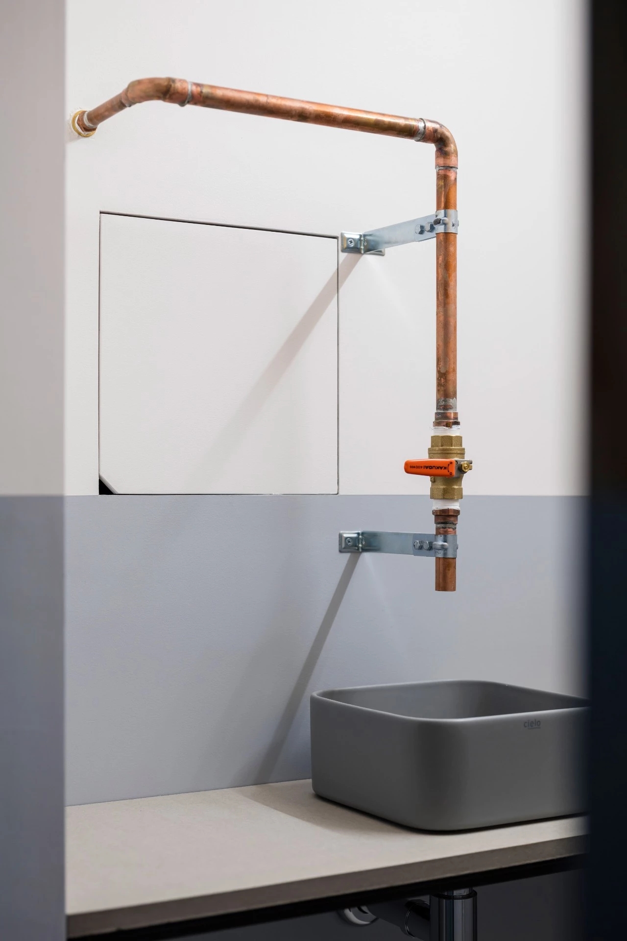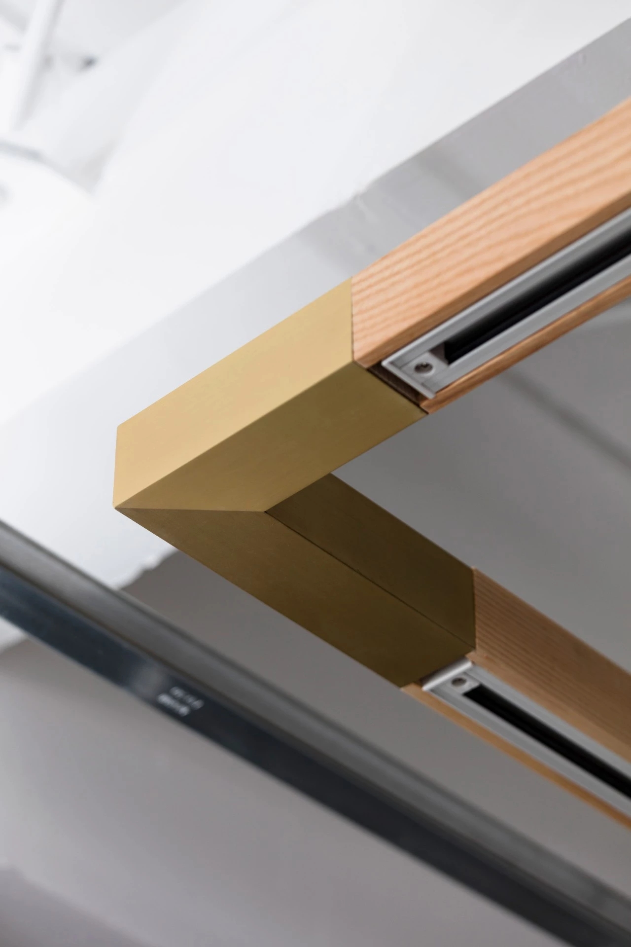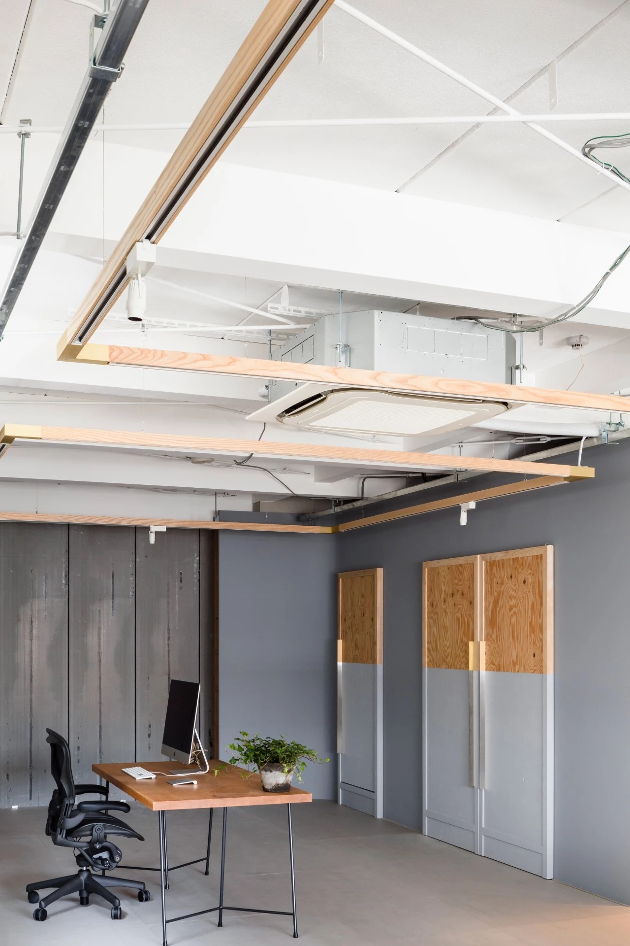 灰色打底的工作室宽敞素雅,木条围绕的天花板凸显简约的工业设计风。粉刷了一半的木门呈现层次感,从而调节室内氛围。
