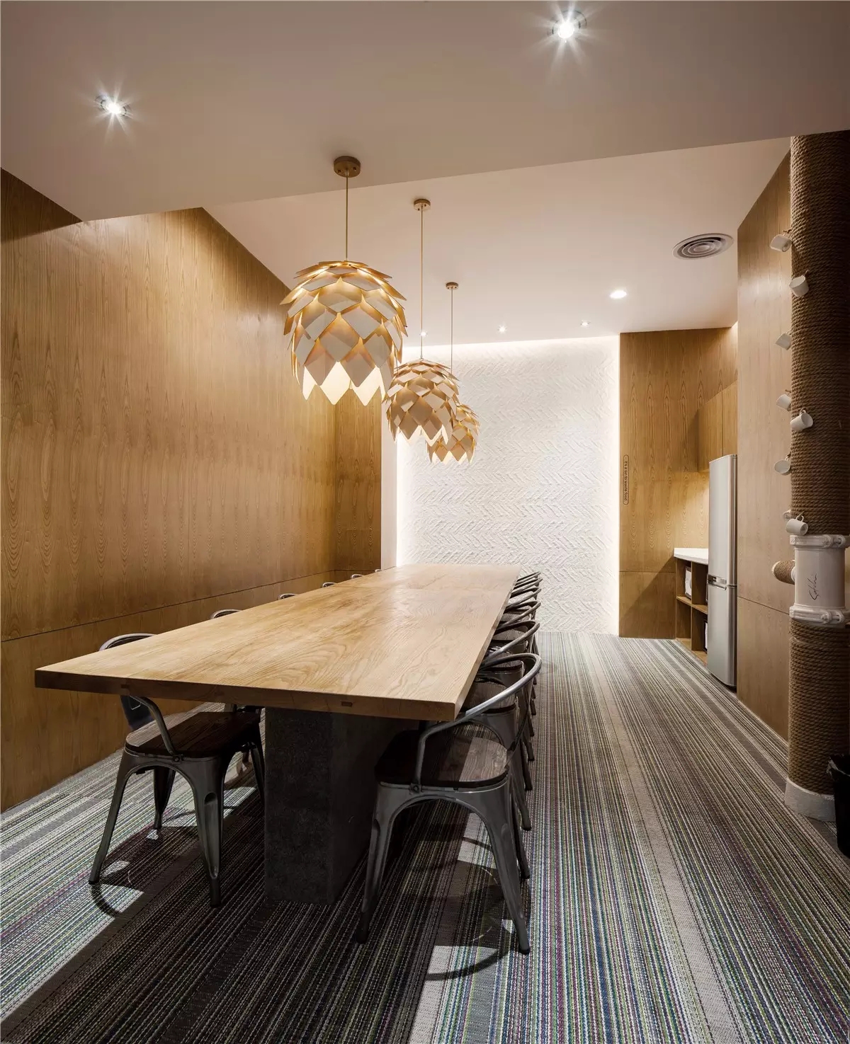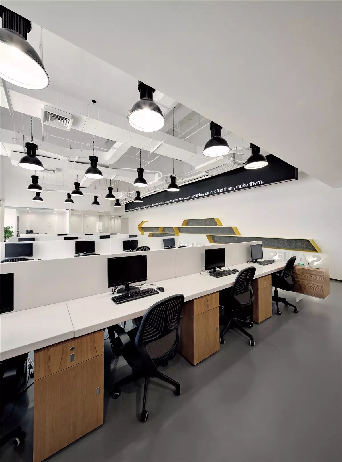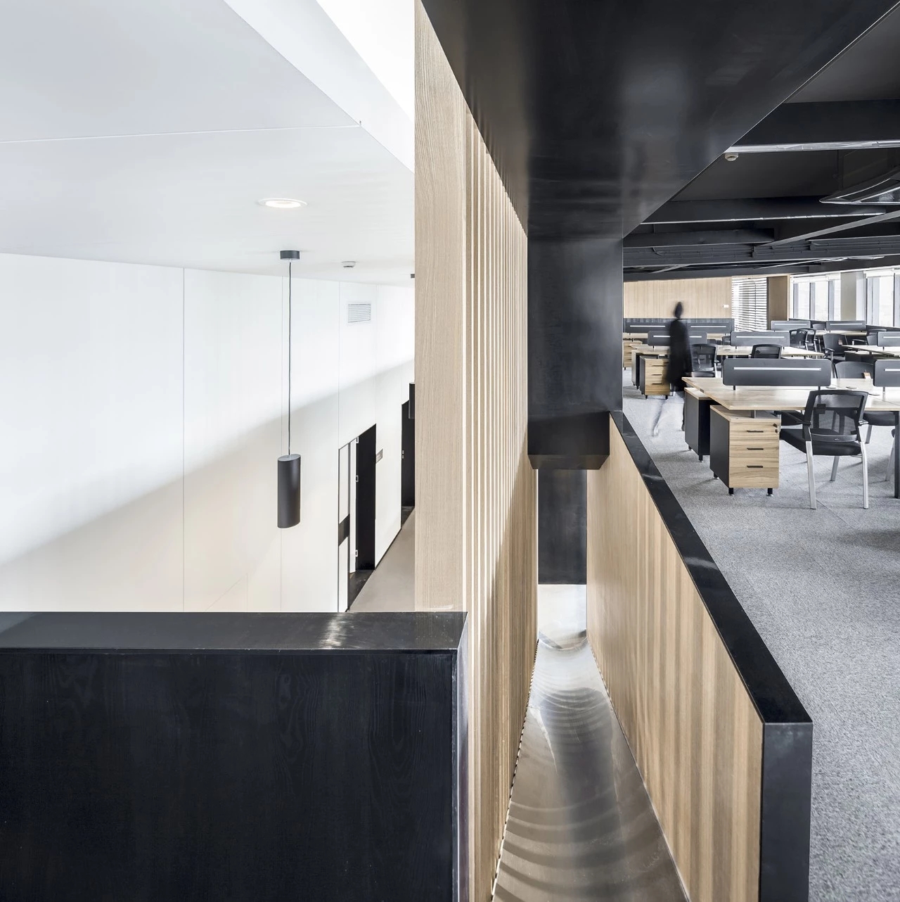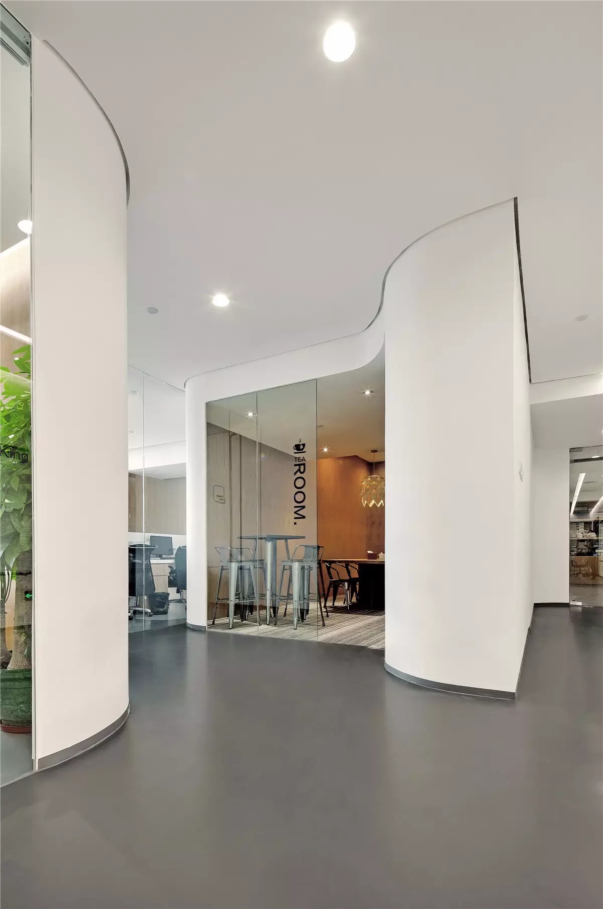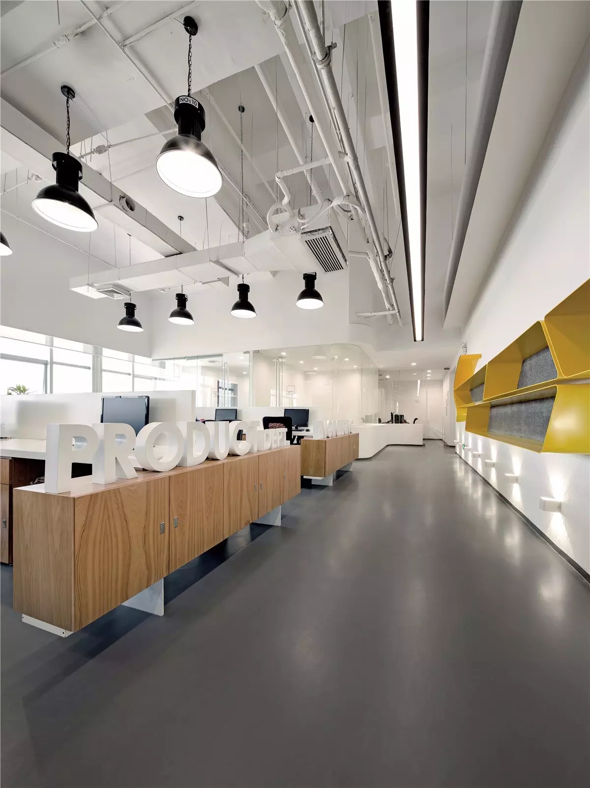 面试区和阅读区共享一堵弧形玻璃墙,两个功能区在视觉上得以扩大,同时也满足了隔音的需求。除特定部门需要独立空间外,剩余部门都设置在开放办公区,办公桌边柜上的立体字便是各部门划分的标志。在该区域,设计师打破了原本沉闷的工作环境,结合超高层高、裸露的天花留白和工业感的吊灯,重新创造一个明亮开阔的空间,为员工营造一个愉悦的工作环境。