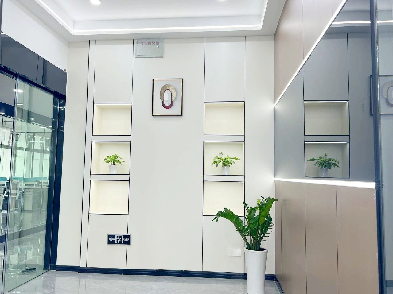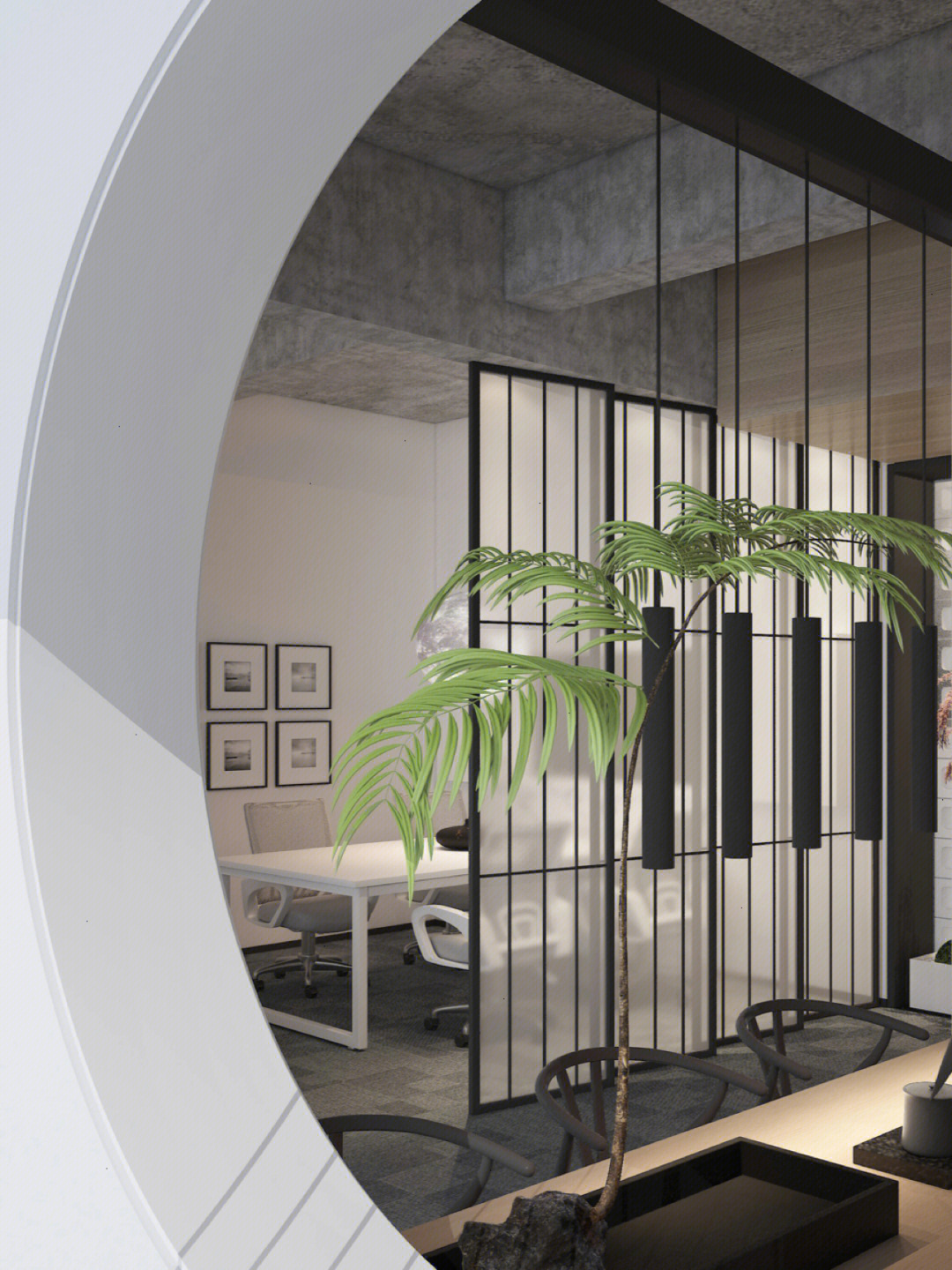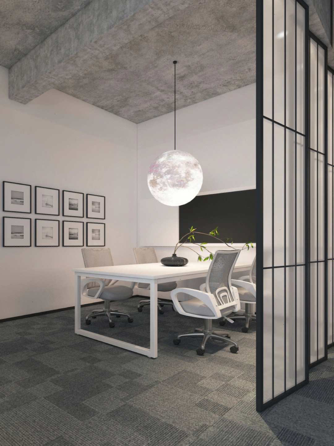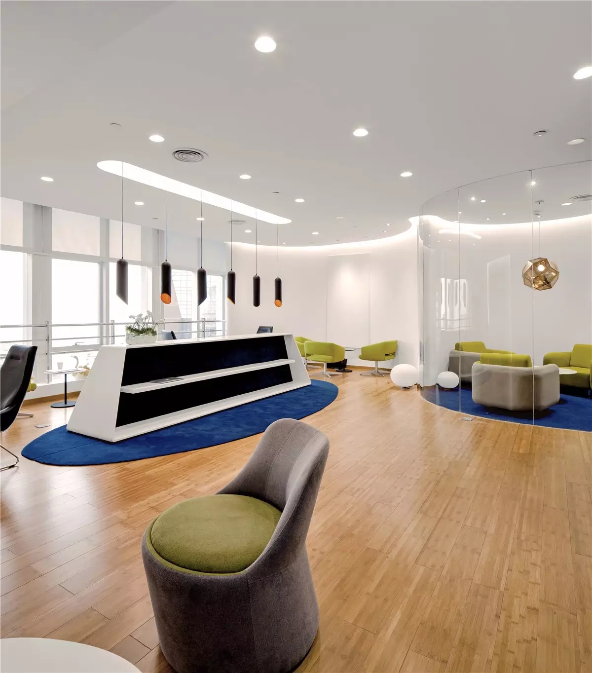 面试区和阅读区共享一堵弧形玻璃墙,两个功能区在视觉上得以扩大,同时也满足了隔音的需求。除特定部门需要独立空间外,剩余部门都设置在开放办公区,办公桌边柜上的立体字便是各部门划分的标志。在该区域,设计师打破了原本沉闷的工作环境,结合超高层高、裸露的天花留白和工业感的吊灯,重新创造一个明亮开阔的空间,为员工营造一个愉悦的工作环境。