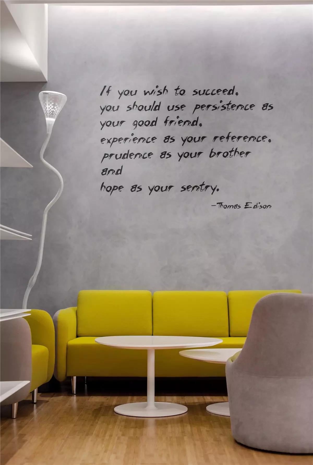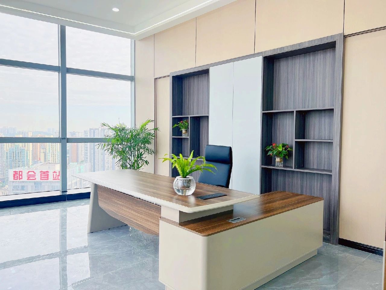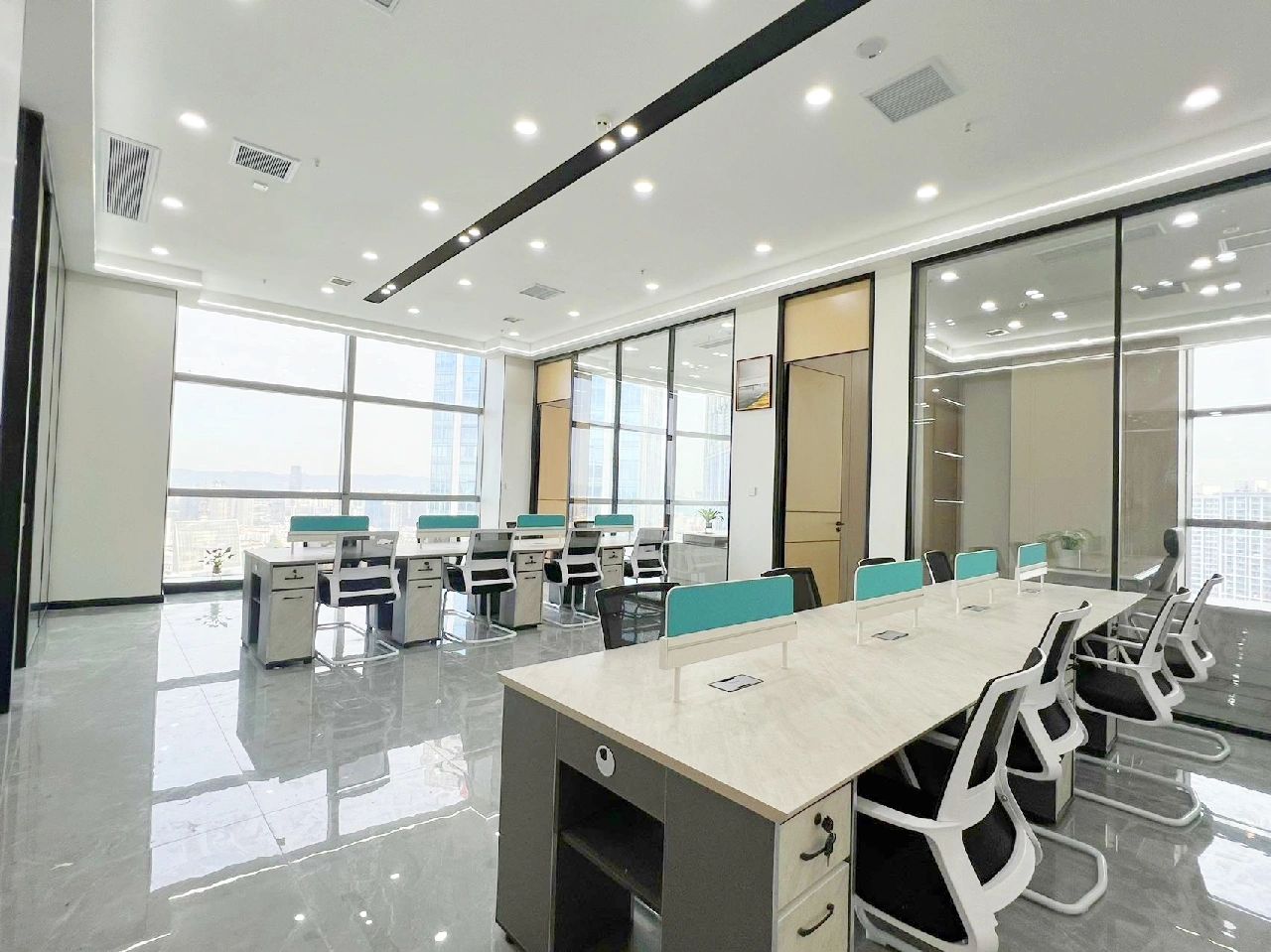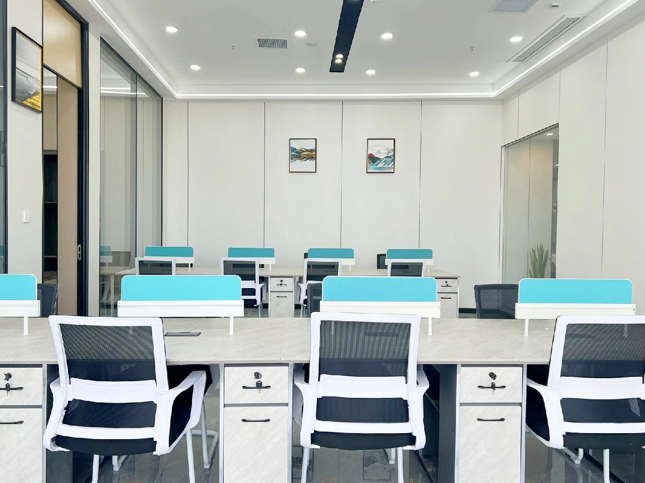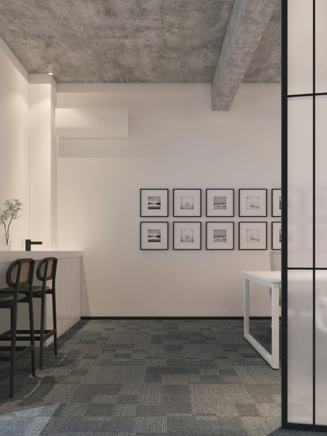 面试区和阅读区共享一堵弧形玻璃墙,两个功能区在视觉上得以扩大,同时也满足了隔音的需求。除特定部门需要独立空间外,剩余部门都设置在开放办公区,办公桌边柜上的立体字便是各部门划分的标志。在该区域,设计师打破了原本沉闷的工作环境,结合超高层高、裸露的天花留白和工业感的吊灯,重新创造一个明亮开阔的空间,为员工营造一个愉悦的工作环境。