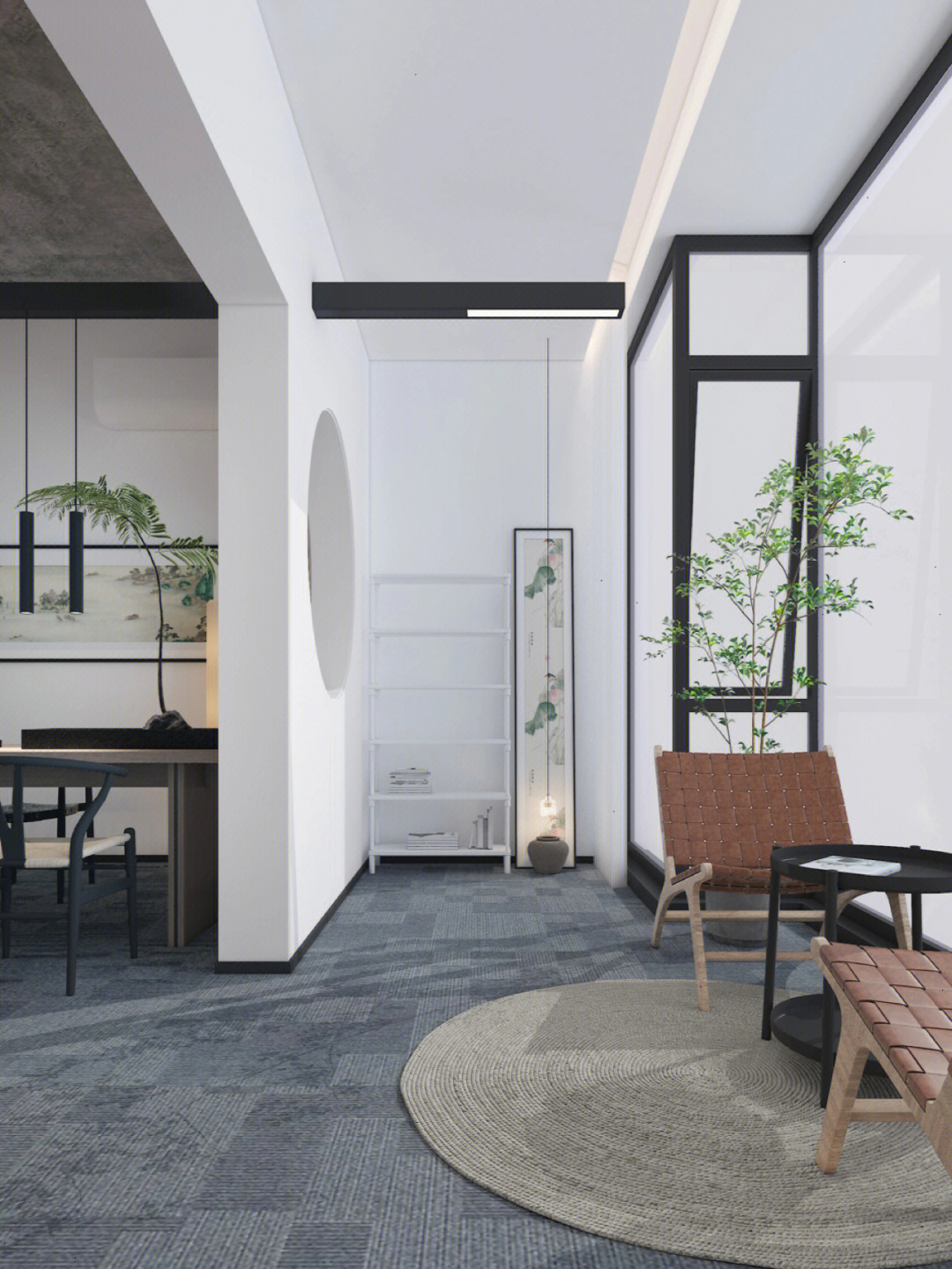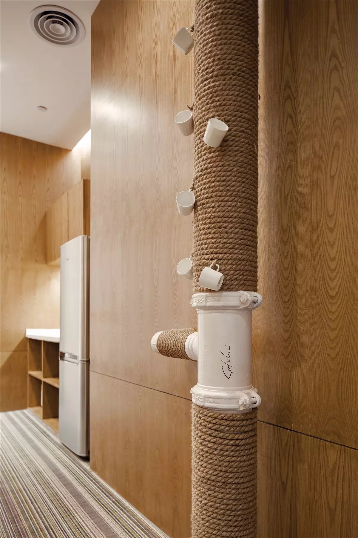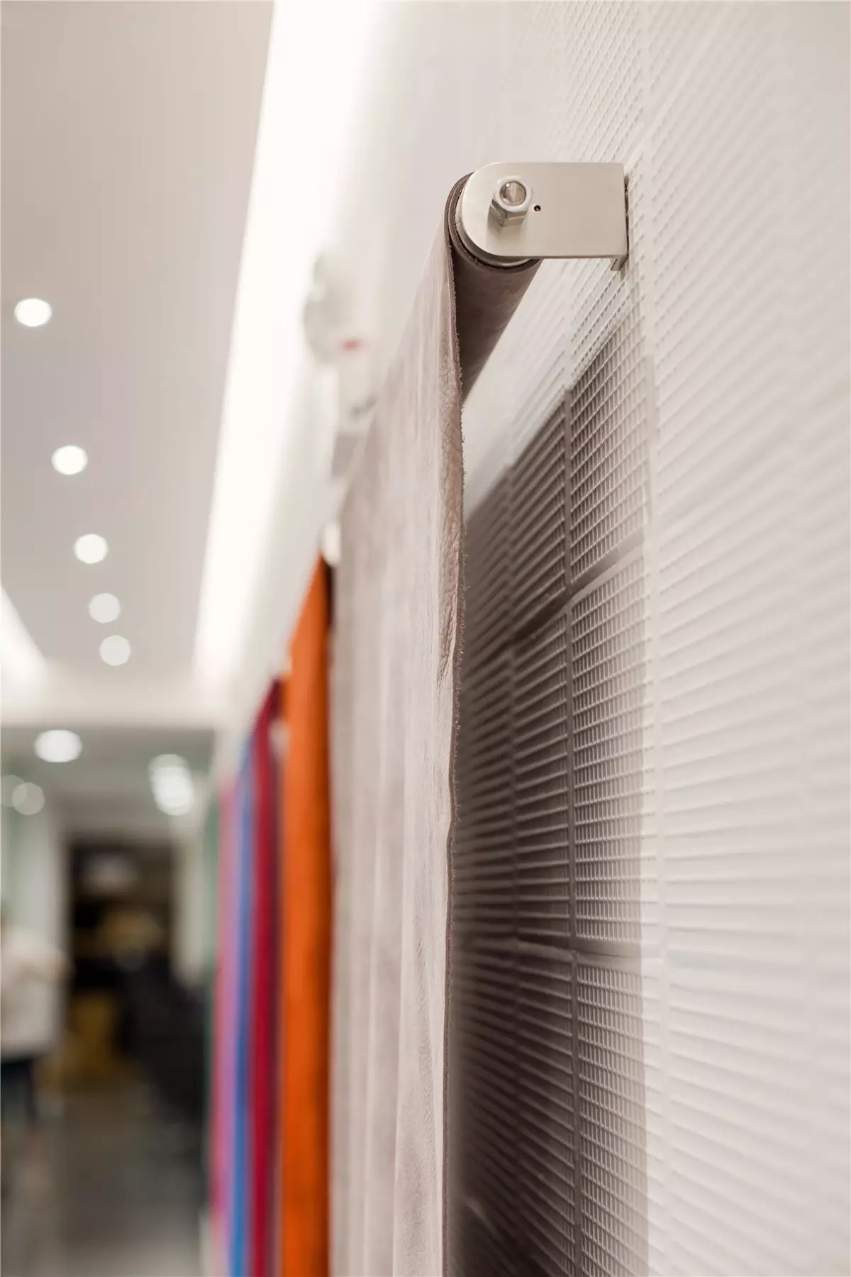 画卷式的展示手法不仅方便更换新皮料,同时有利于观者阅读。走道中看似随意安装的装饰画,配合定制的大型展示架,使观者犹如置身于展馆之中。引领拜访者一圈一圈来回游走也是本次设计的目的之一,让观者感受着沙驰企业文化的同时,也可以停下来欣赏材料的本真之美。