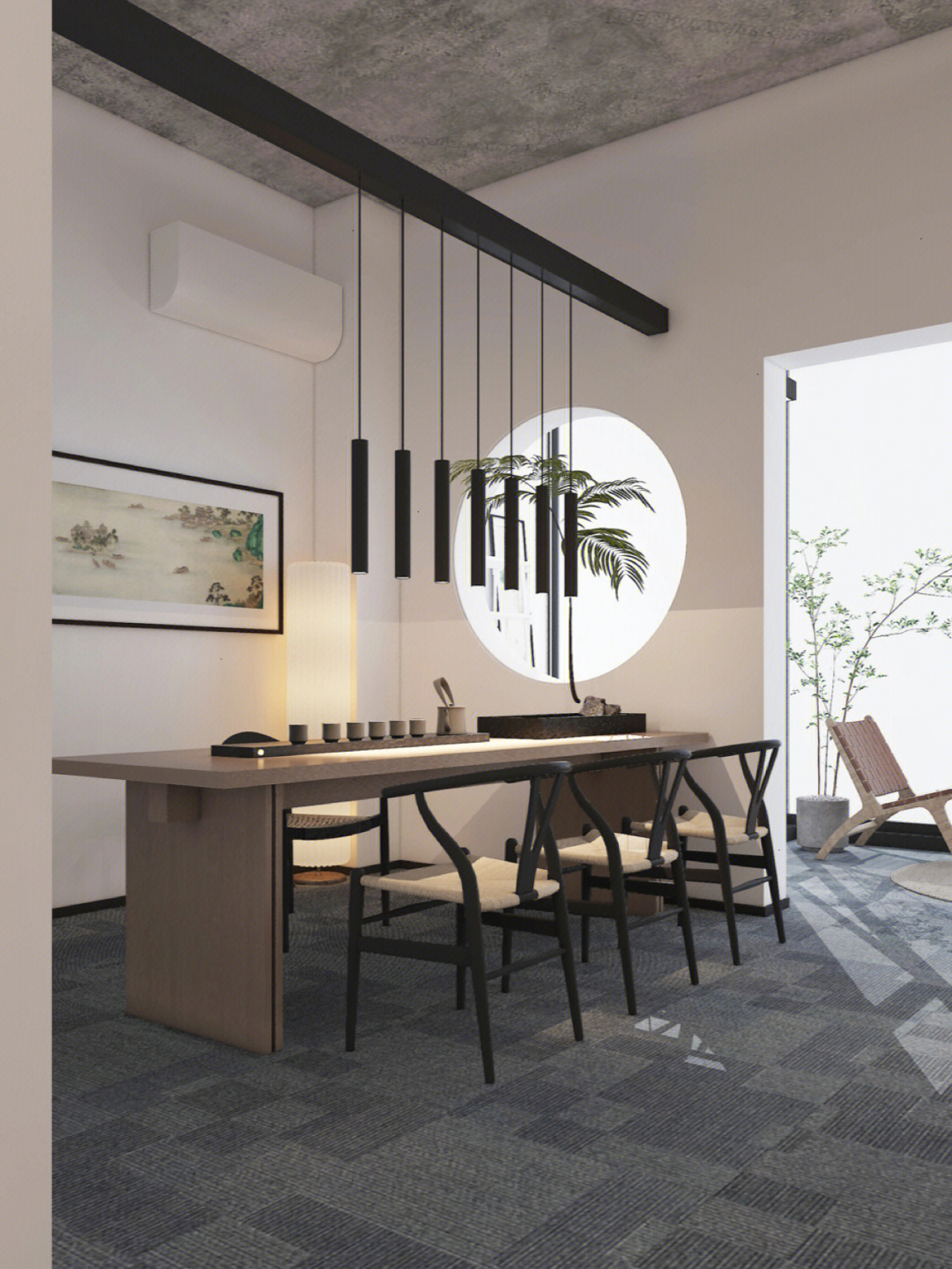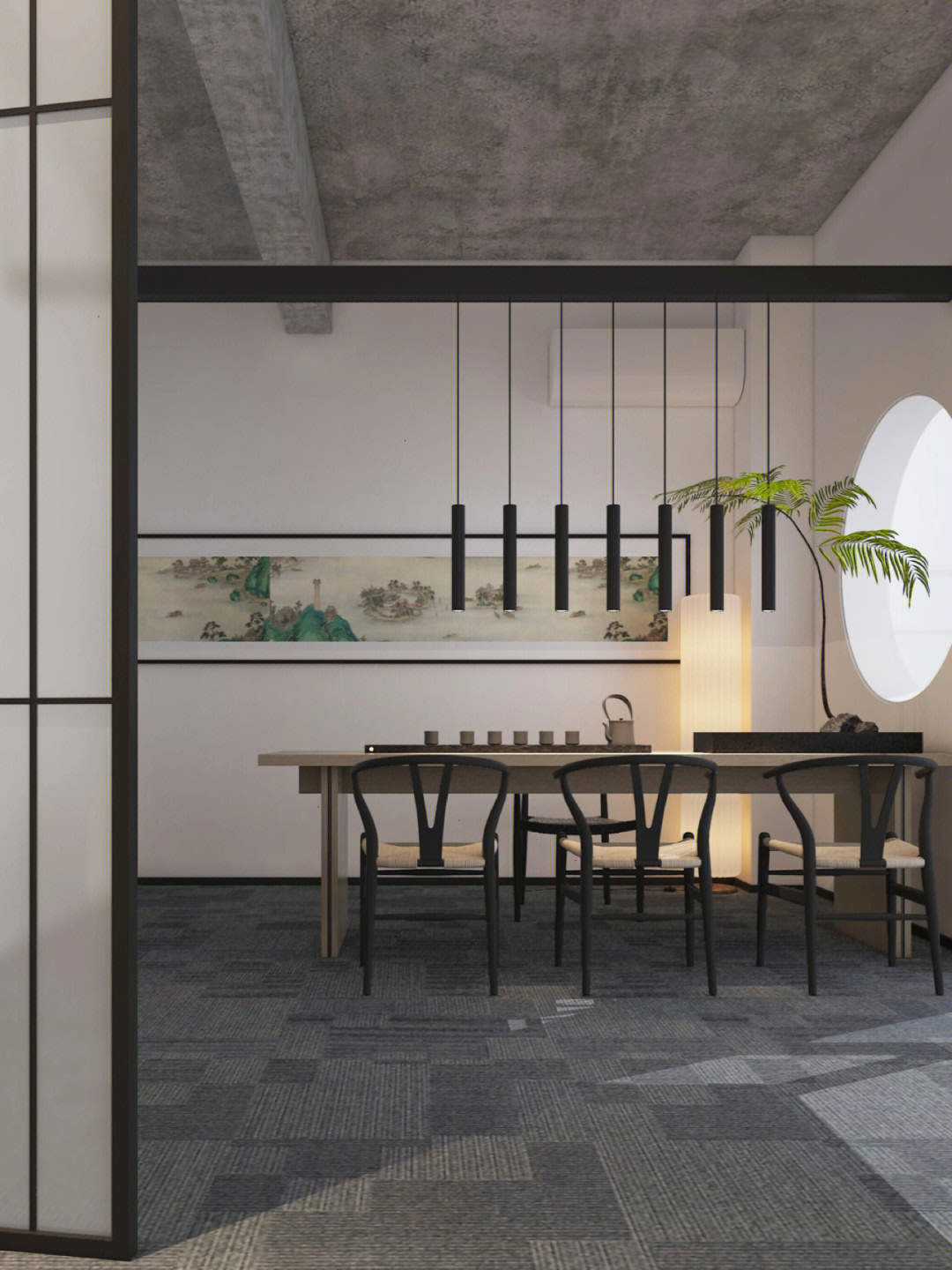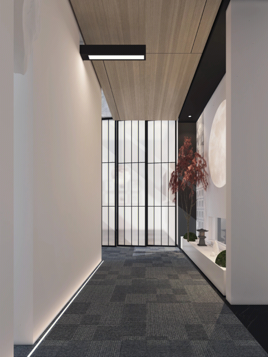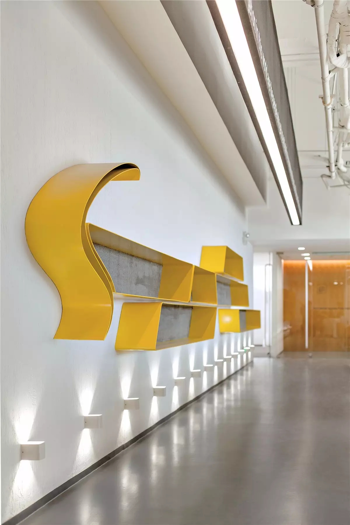 画卷式的展示手法不仅方便更换新皮料,同时有利于观者阅读。走道中看似随意安装的装饰画,配合定制的大型展示架,使观者犹如置身于展馆之中。引领拜访者一圈一圈来回游走也是本次设计的目的之一,让观者感受着沙驰企业文化的同时,也可以停下来欣赏材料的本真之美。